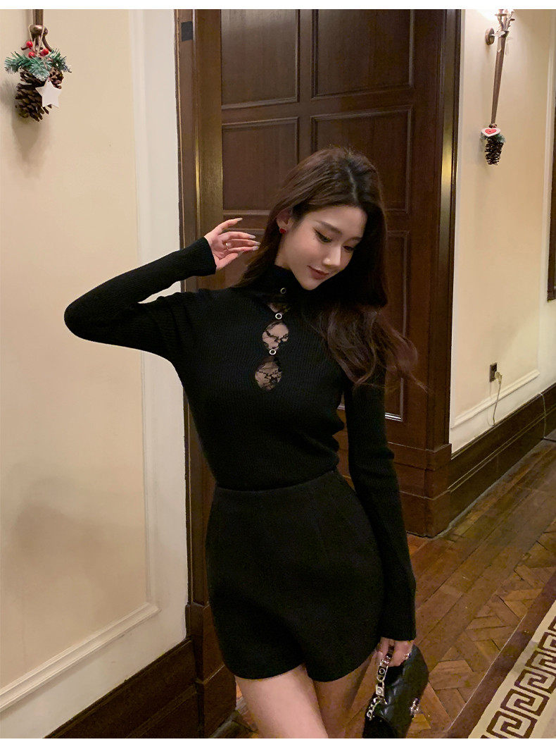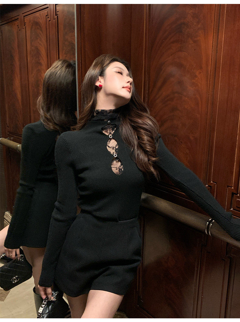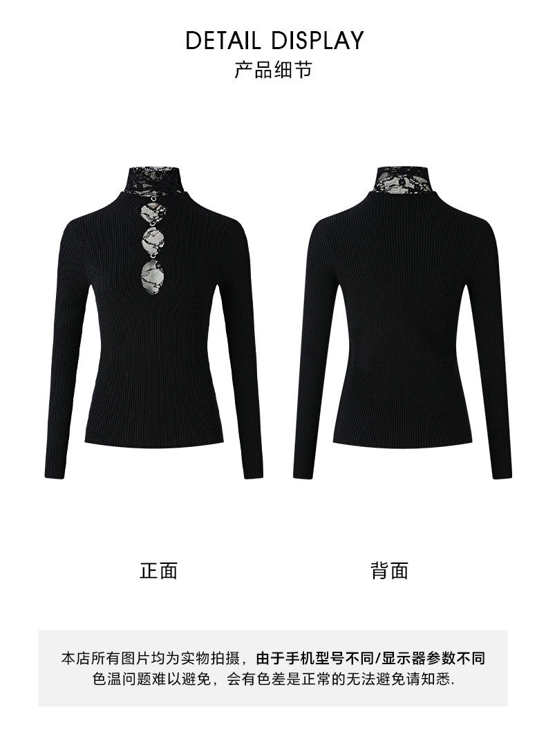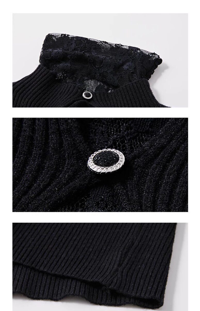 Hollinna Elegant Lace Patchwork Knit Sweater for Women, Autumn/Winter 2025 New Style, Waist-Cinching Slim-Fit Base Layer Top