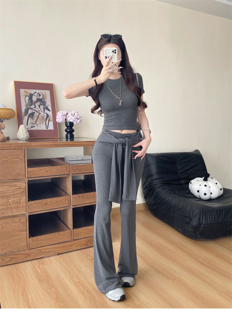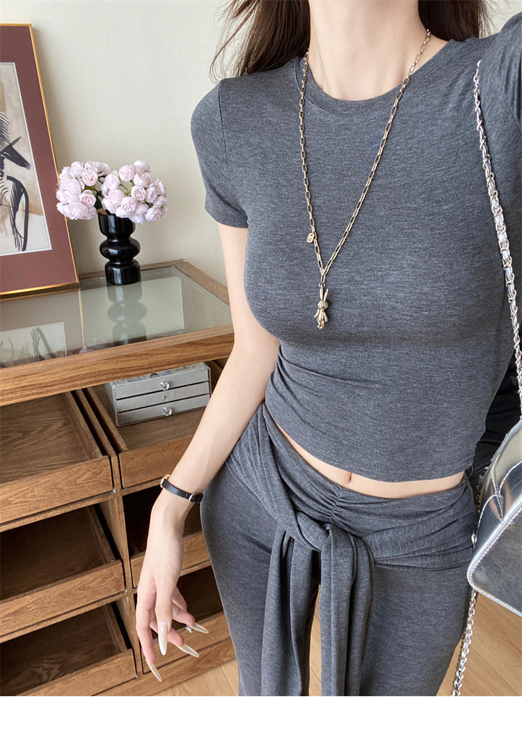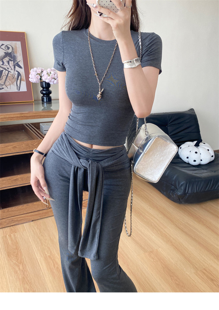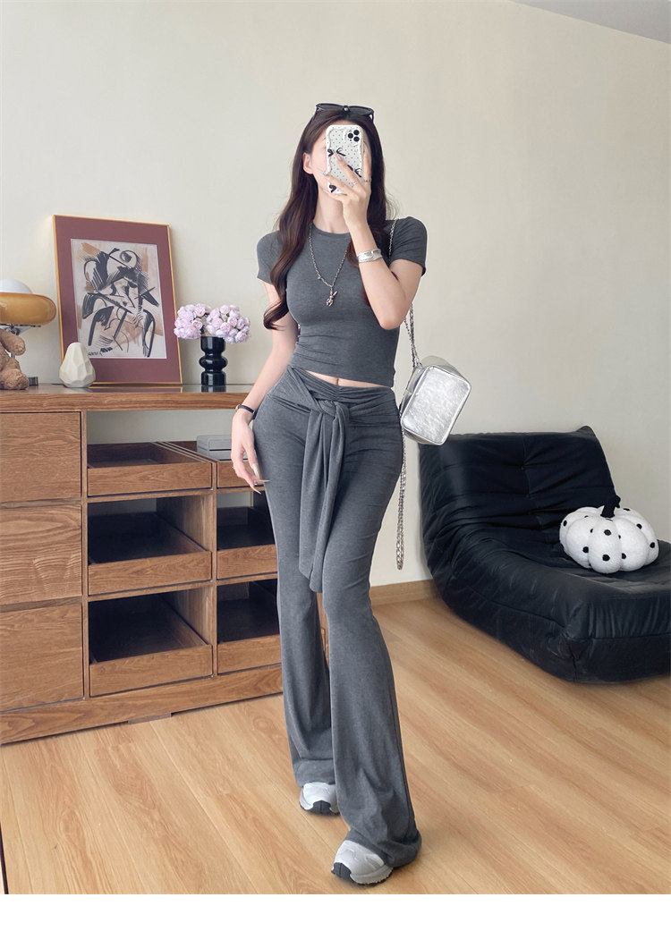 Summer Hot Girl Gray Round Neck Tight Short-Sleeved T-Shirt with Tie Design and Floor-Length Tencel Pants Two-Piece Set