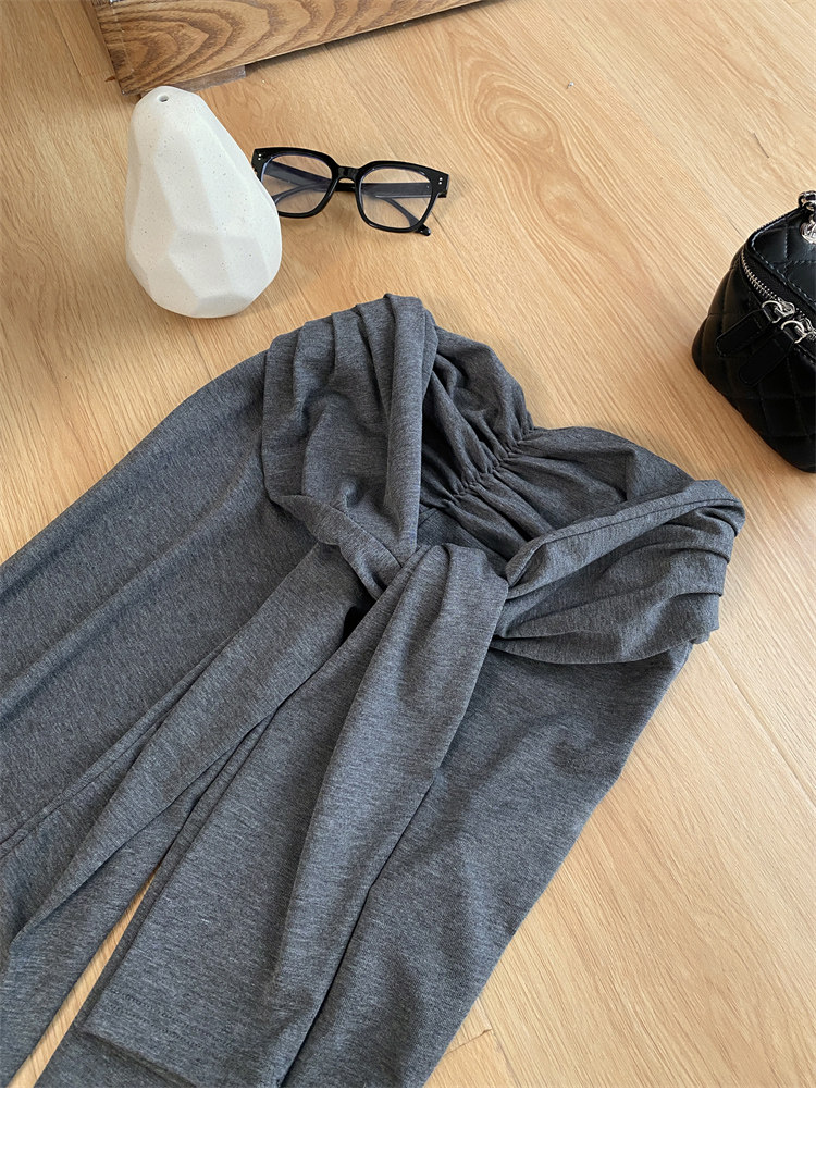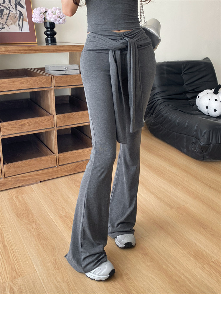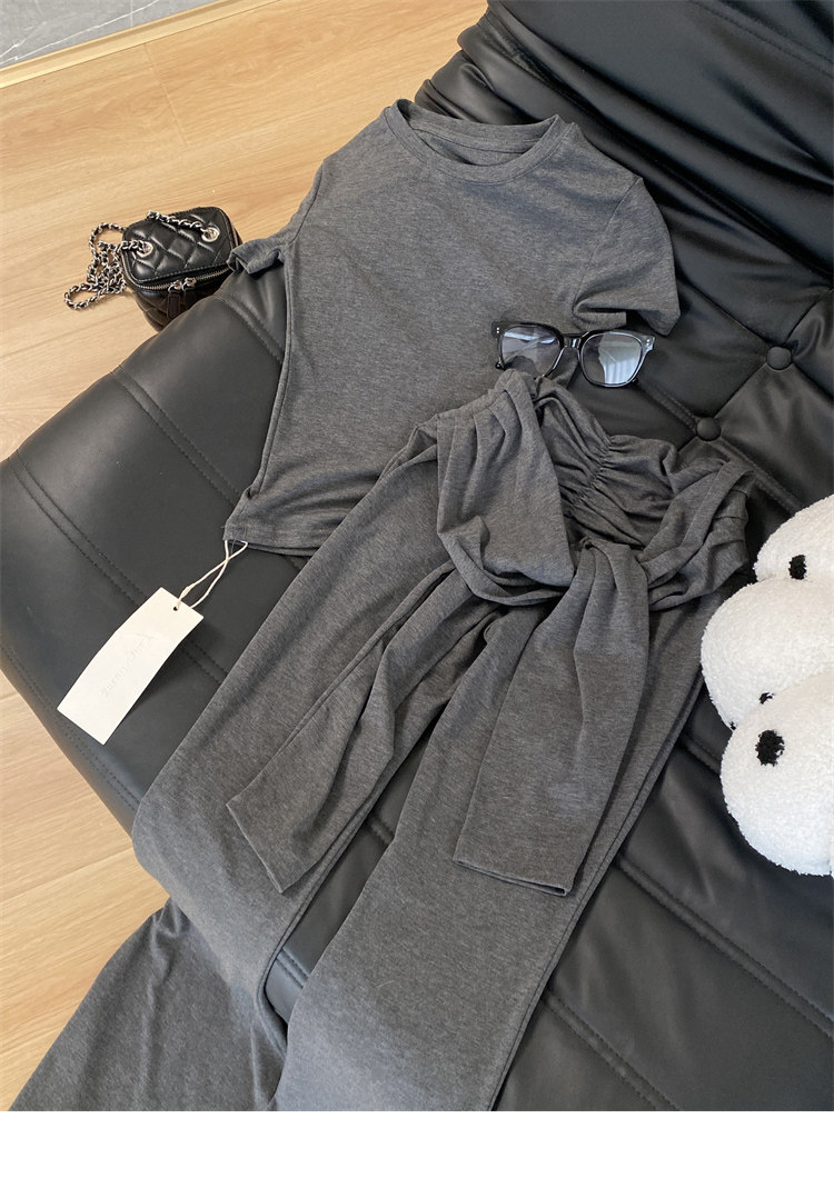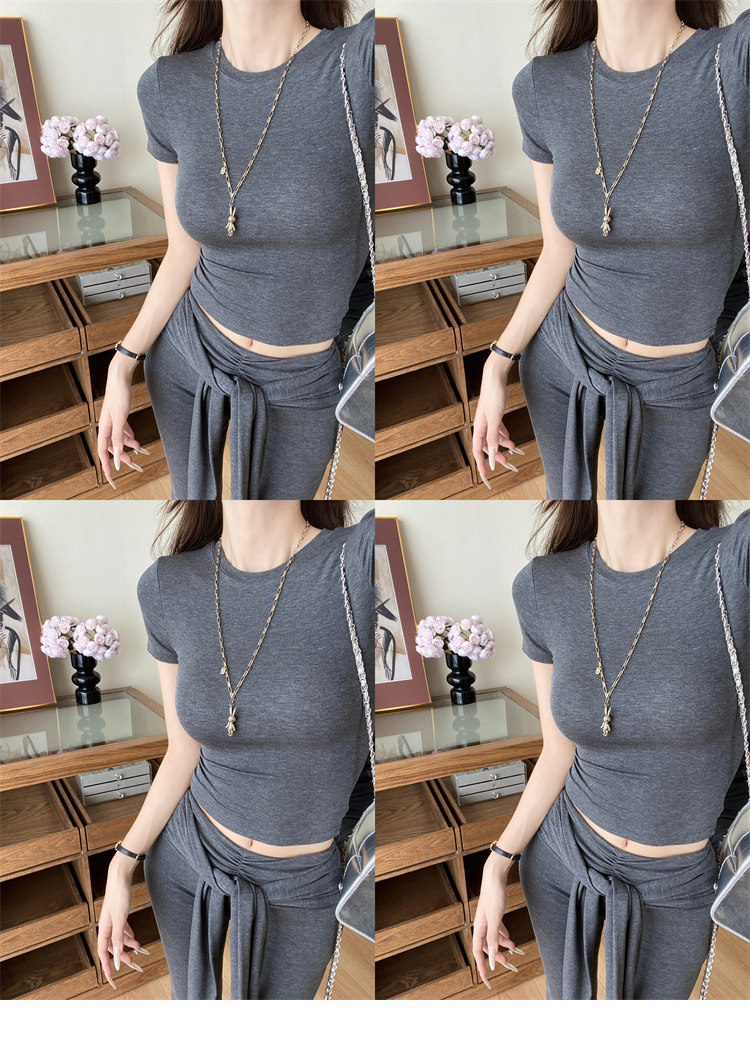 Summer Hot Girl Gray Round Neck Tight Short-Sleeved T-Shirt with Tie Design and Floor-Length Tencel Pants Two-Piece Set