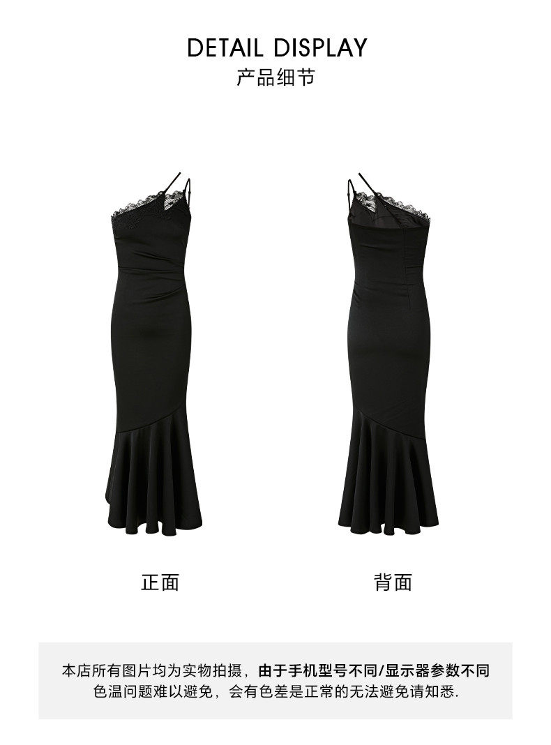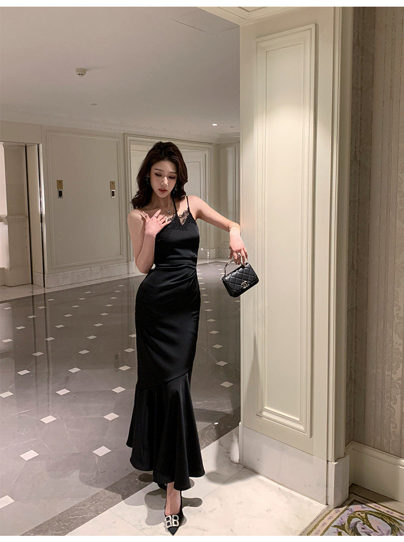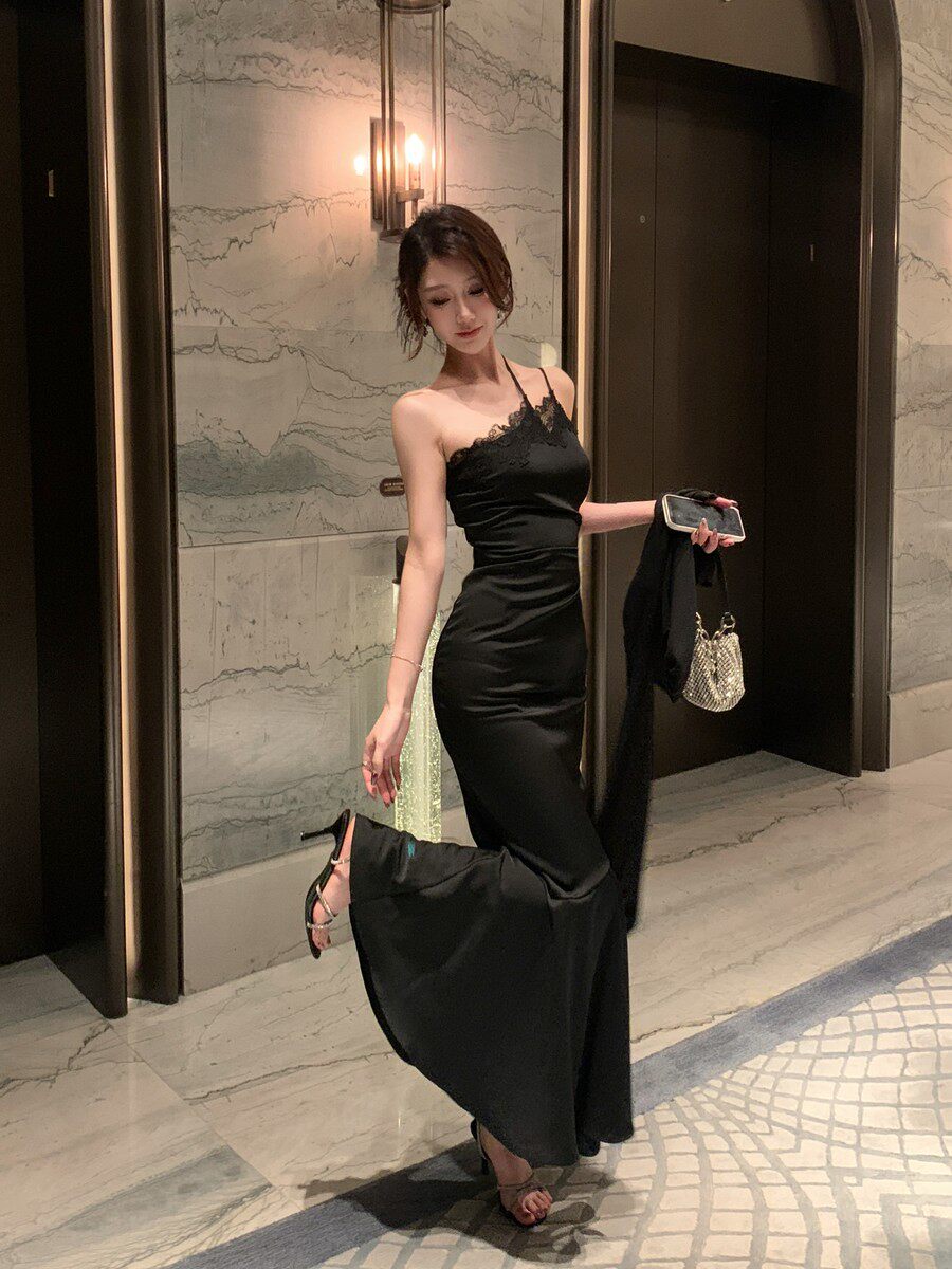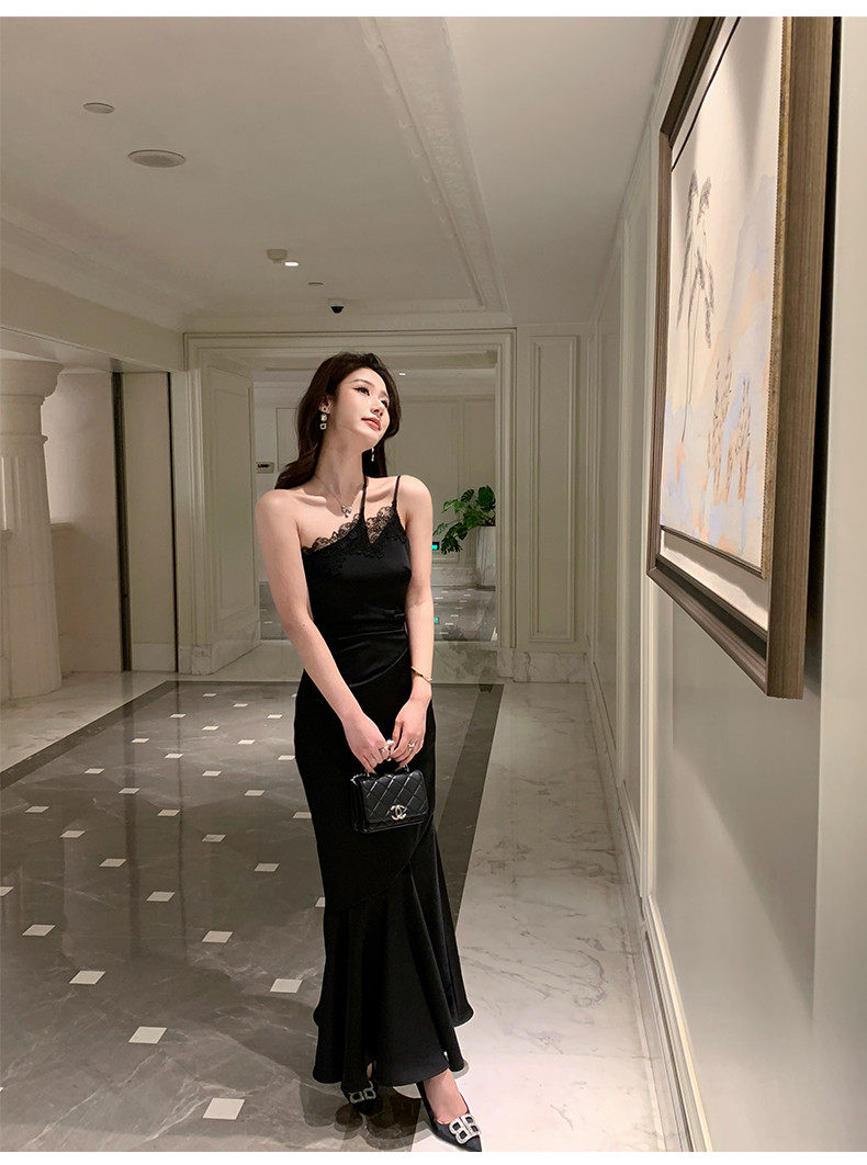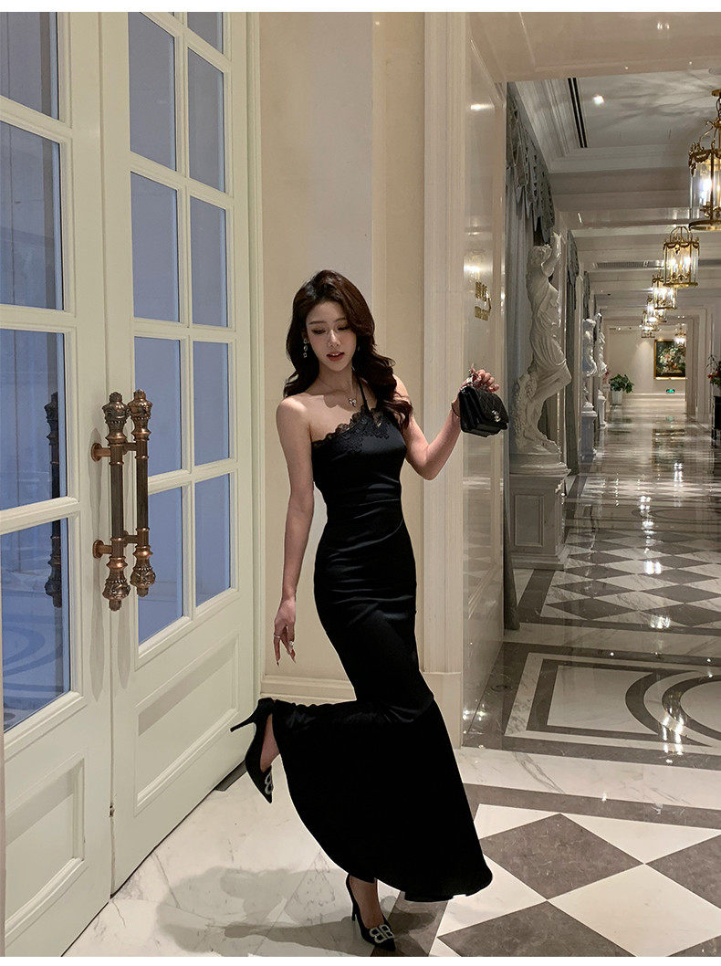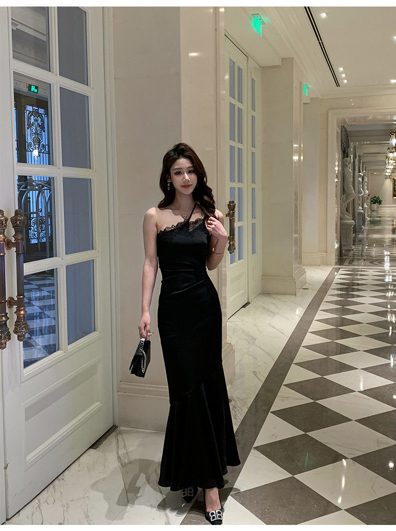 Hollin Oblique Shoulder Strap Black Acetate Dress Women's Spring & Fall 2025 New Sexy Waist Slimming Look Long Skirt