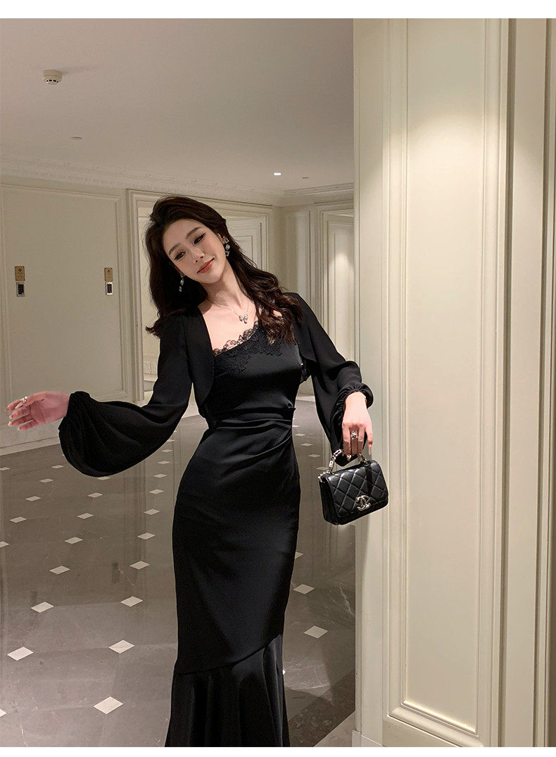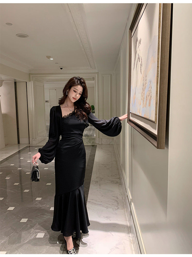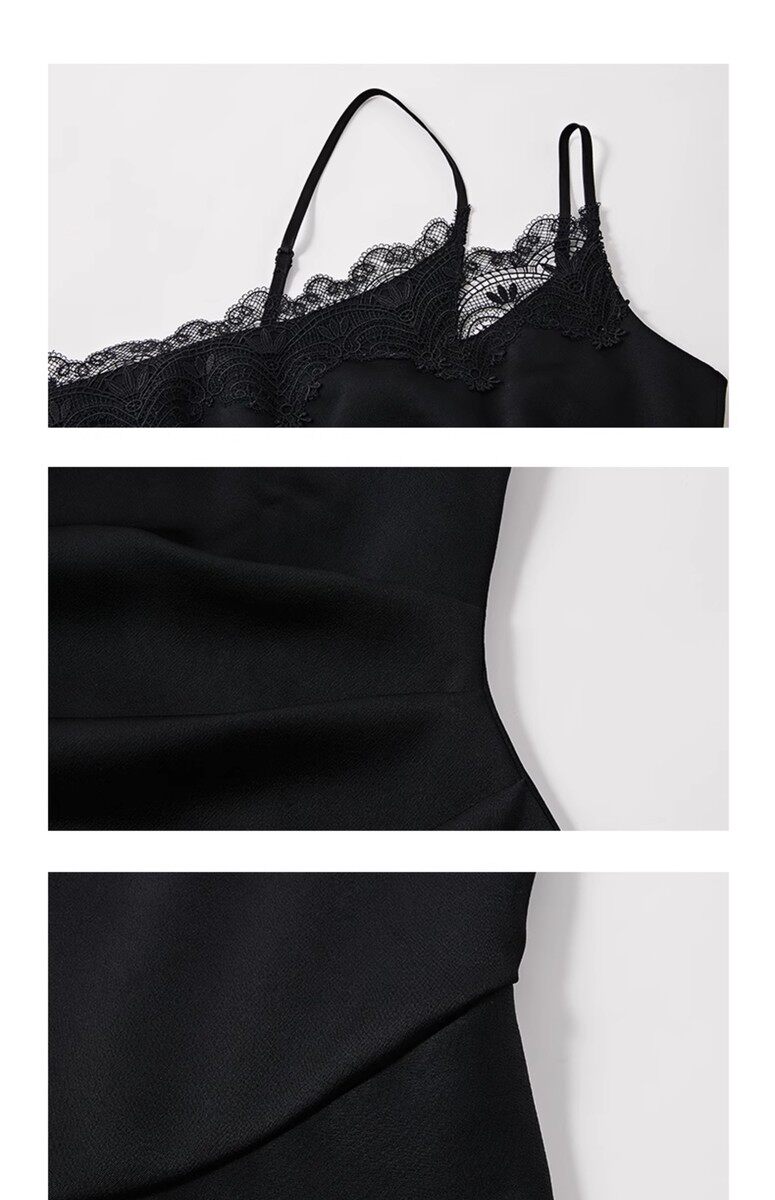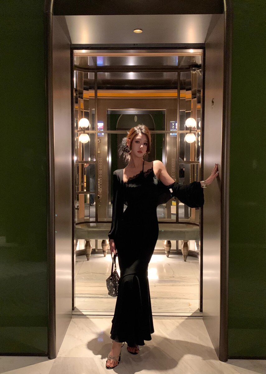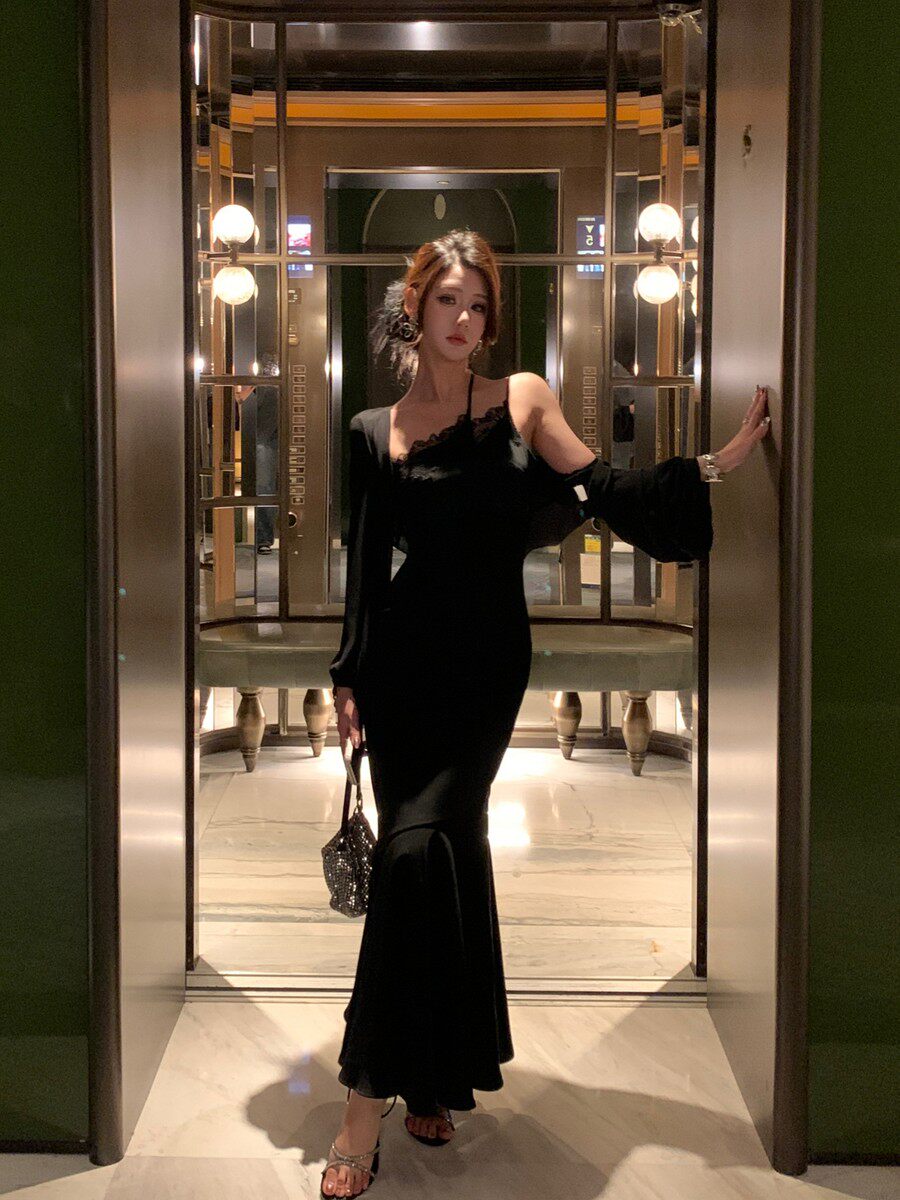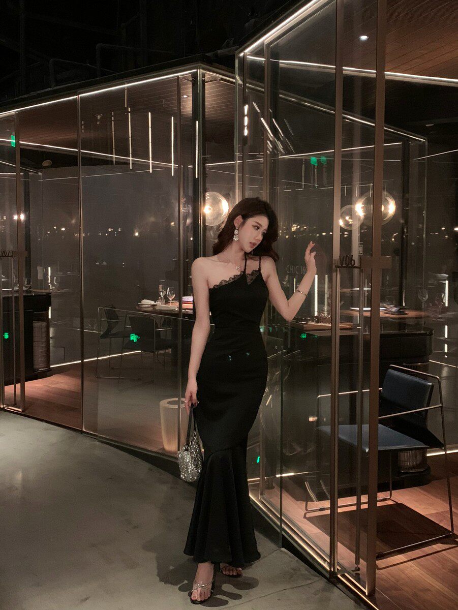 Hollin Oblique Shoulder Strap Black Acetate Dress Women's Spring & Fall 2025 New Sexy Waist Slimming Look Long Skirt