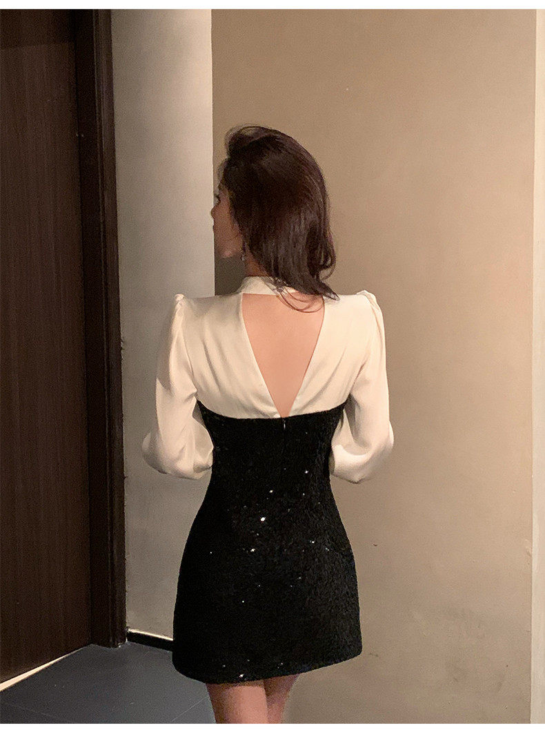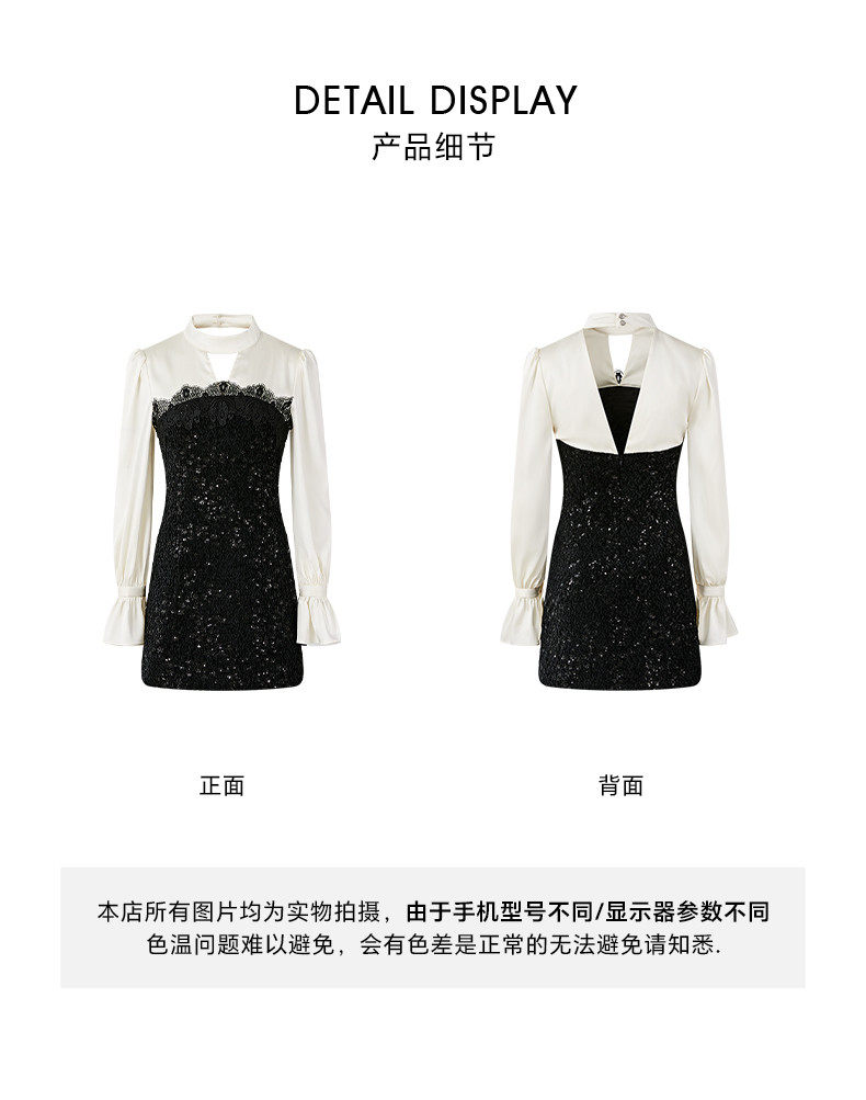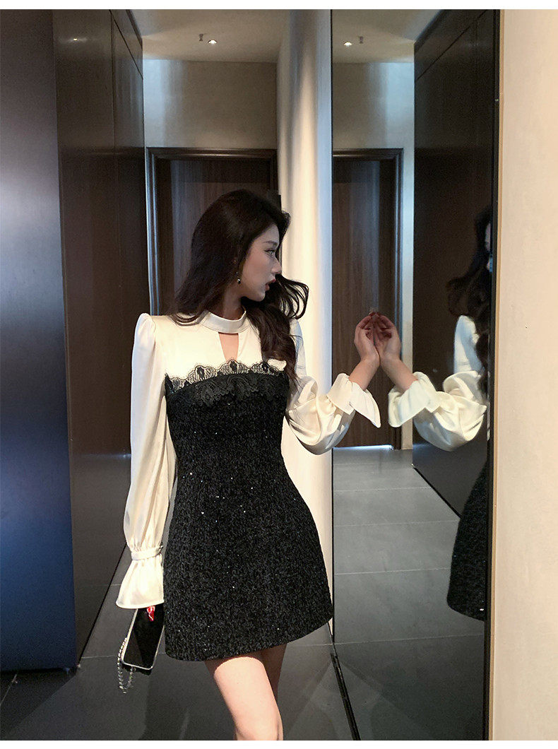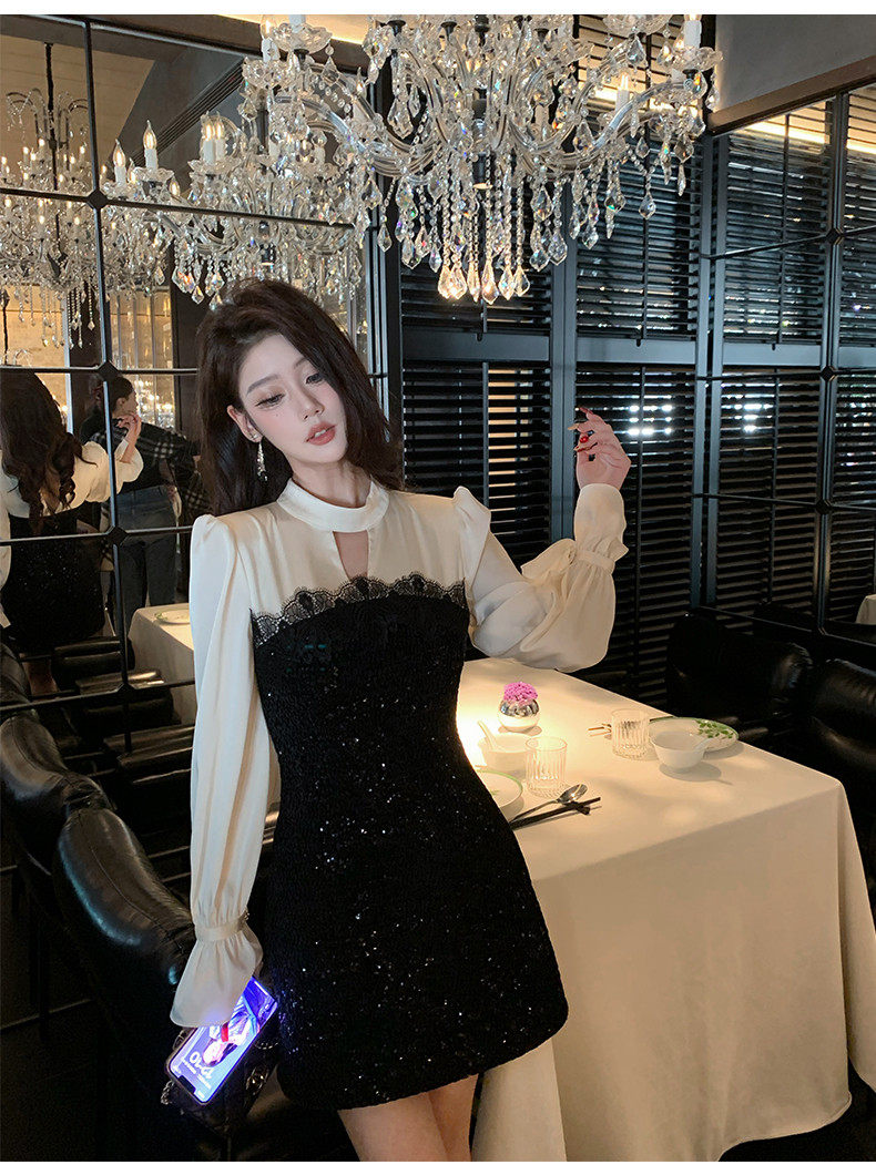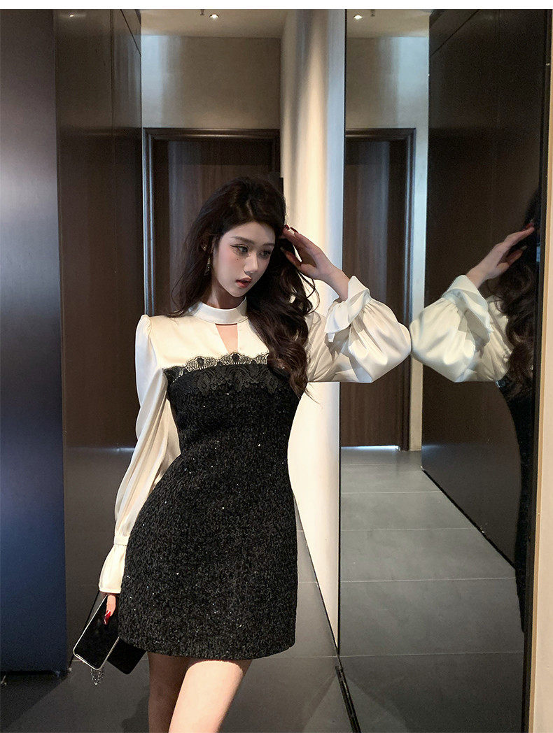 Hollin Patchwork Long-Sleeved Dress for Women, Spring and Autumn 2025 New Design, Waist-Cinching, Slimming, Socialite Style Short Dress