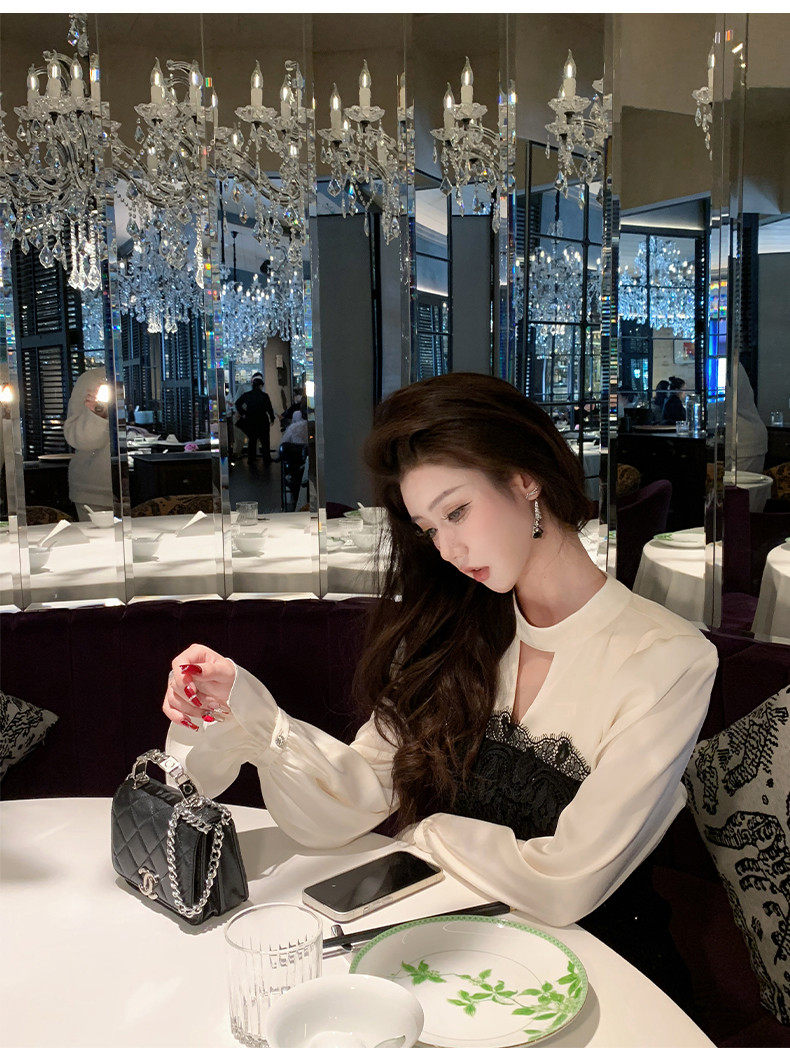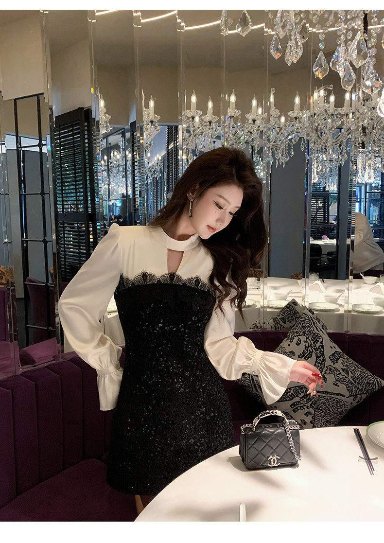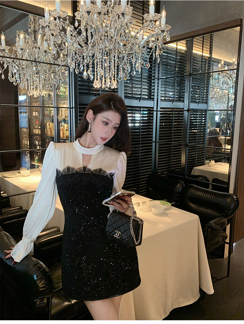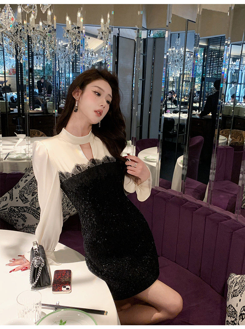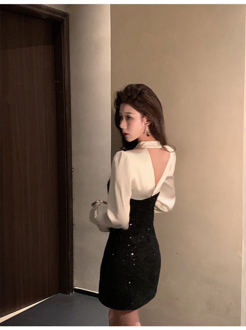 Hollin Patchwork Long-Sleeved Dress for Women, Spring and Autumn 2025 New Design, Waist-Cinching, Slimming, Socialite Style Short Dress