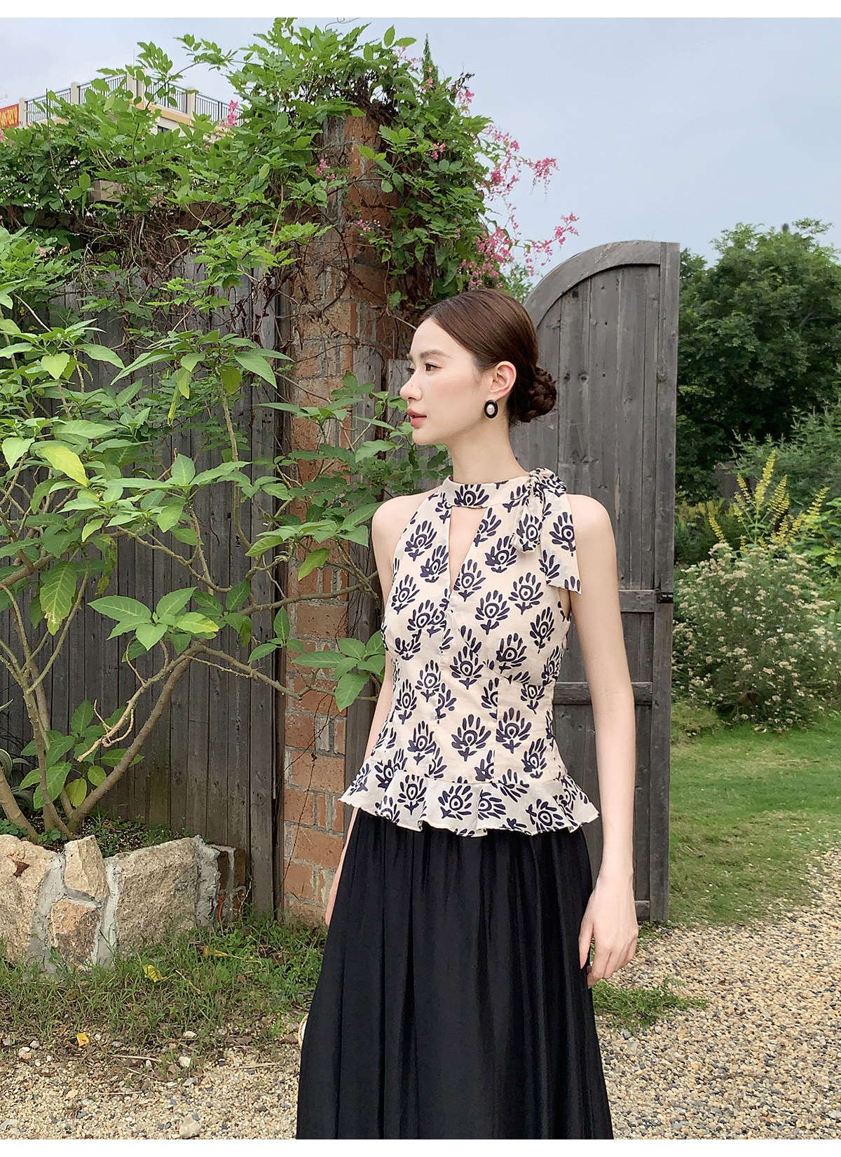 Xxning New Chinese Style V-Neck Hollow-Out Tie Halter Top for Women, Autumn New Slim Fit Elegant Blouse