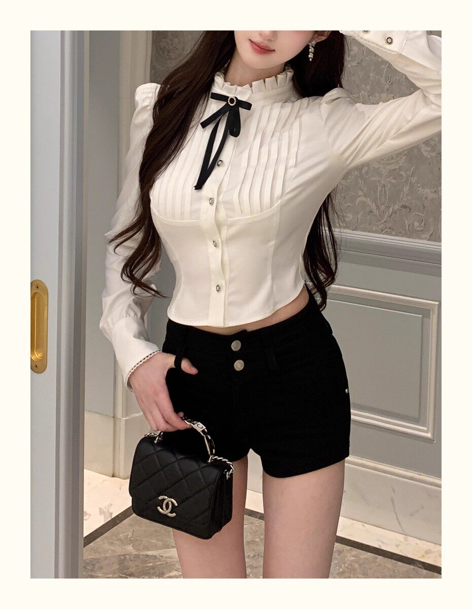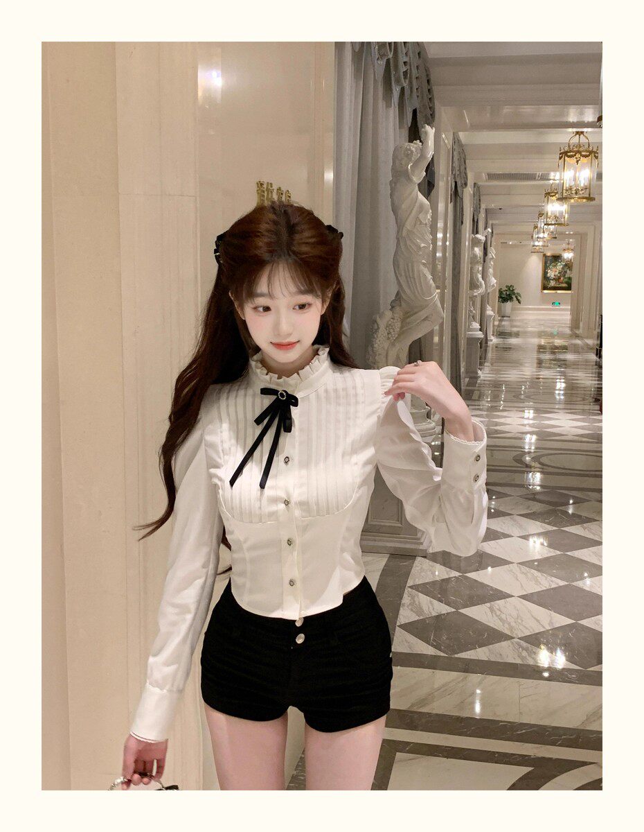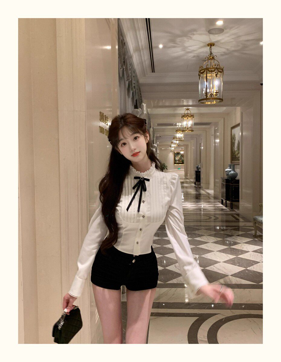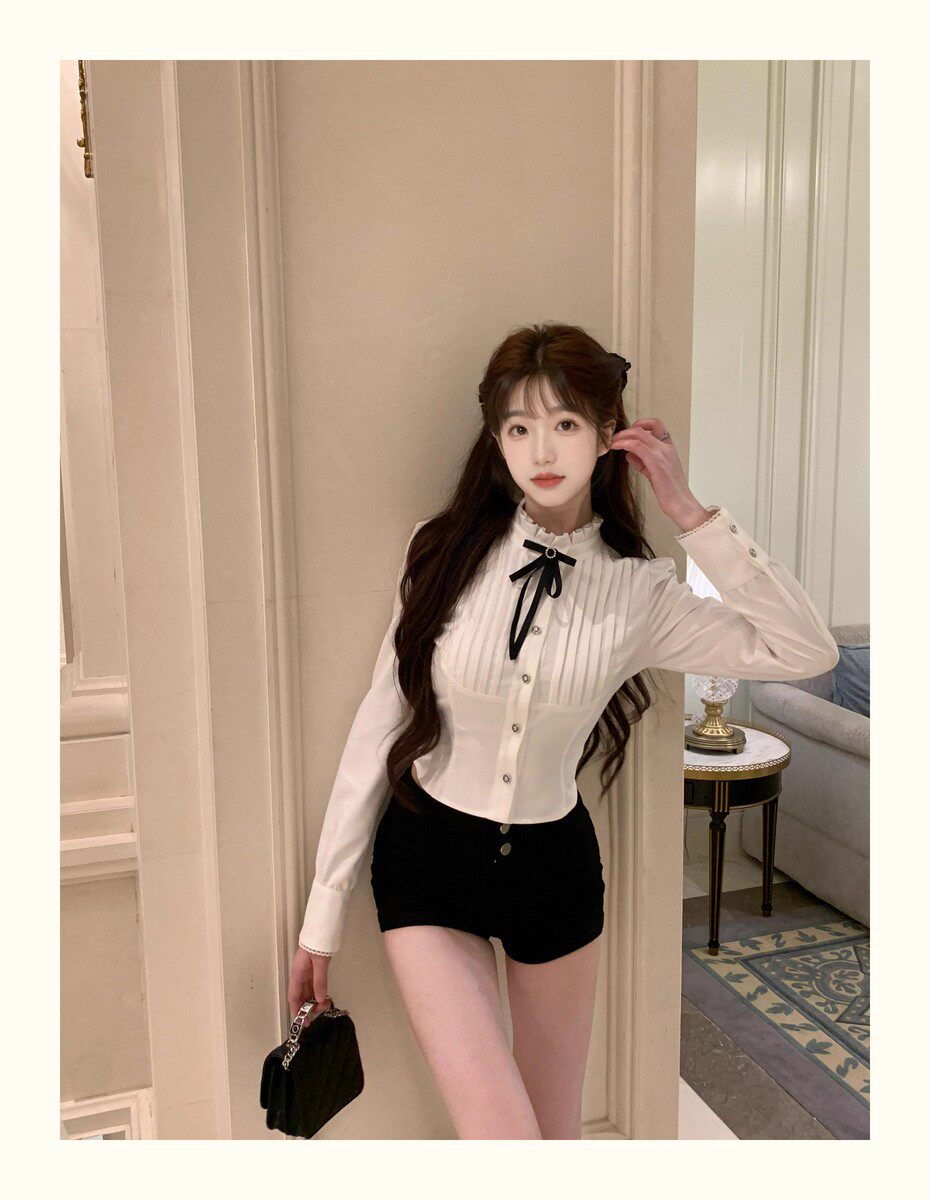 Hollin Bow Tie Slim Long-Sleeved Shirt for Women, Spring and Autumn 2025 New Style, Waist-Cinching, Slimming, Versatile, High-End Shirt