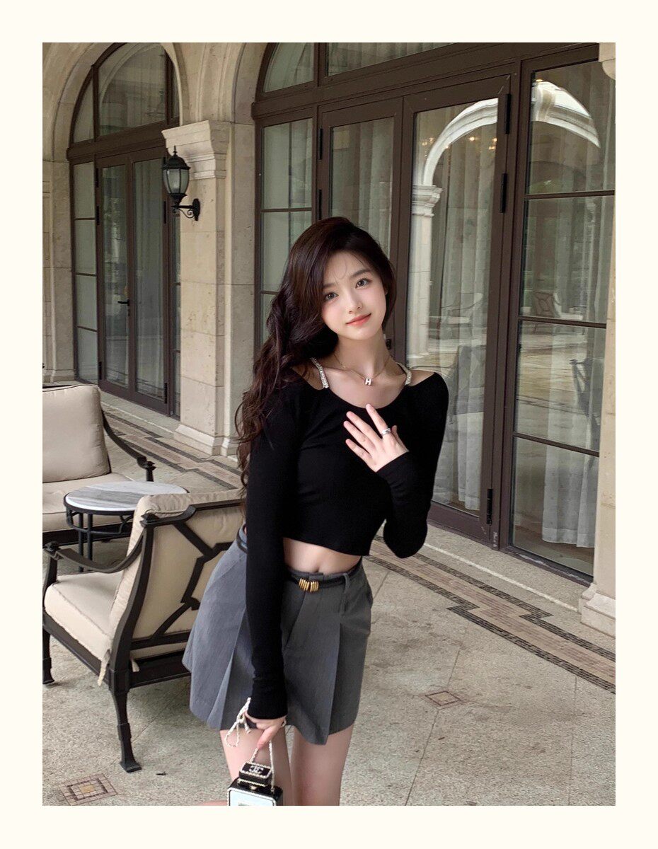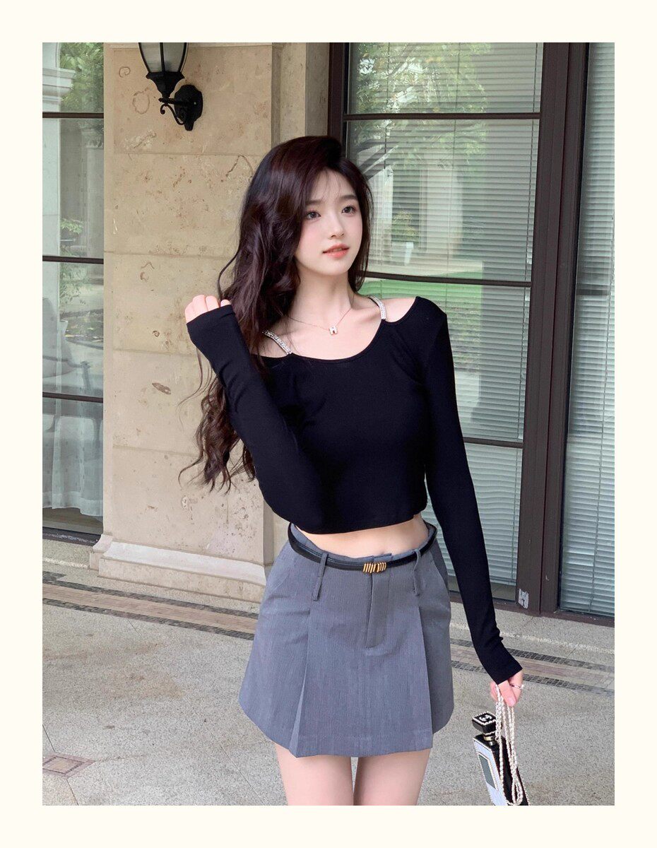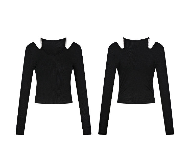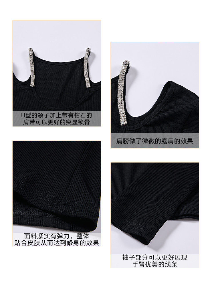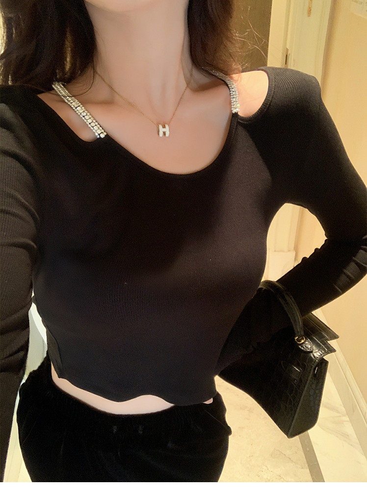 Hollin Rhinestone Knitted Long-Sleeved T-Shirt for Women, Spring and Autumn, Black, Waist-Cinching, Slimming Top, Tight-Fitting, High-End Base Shirt