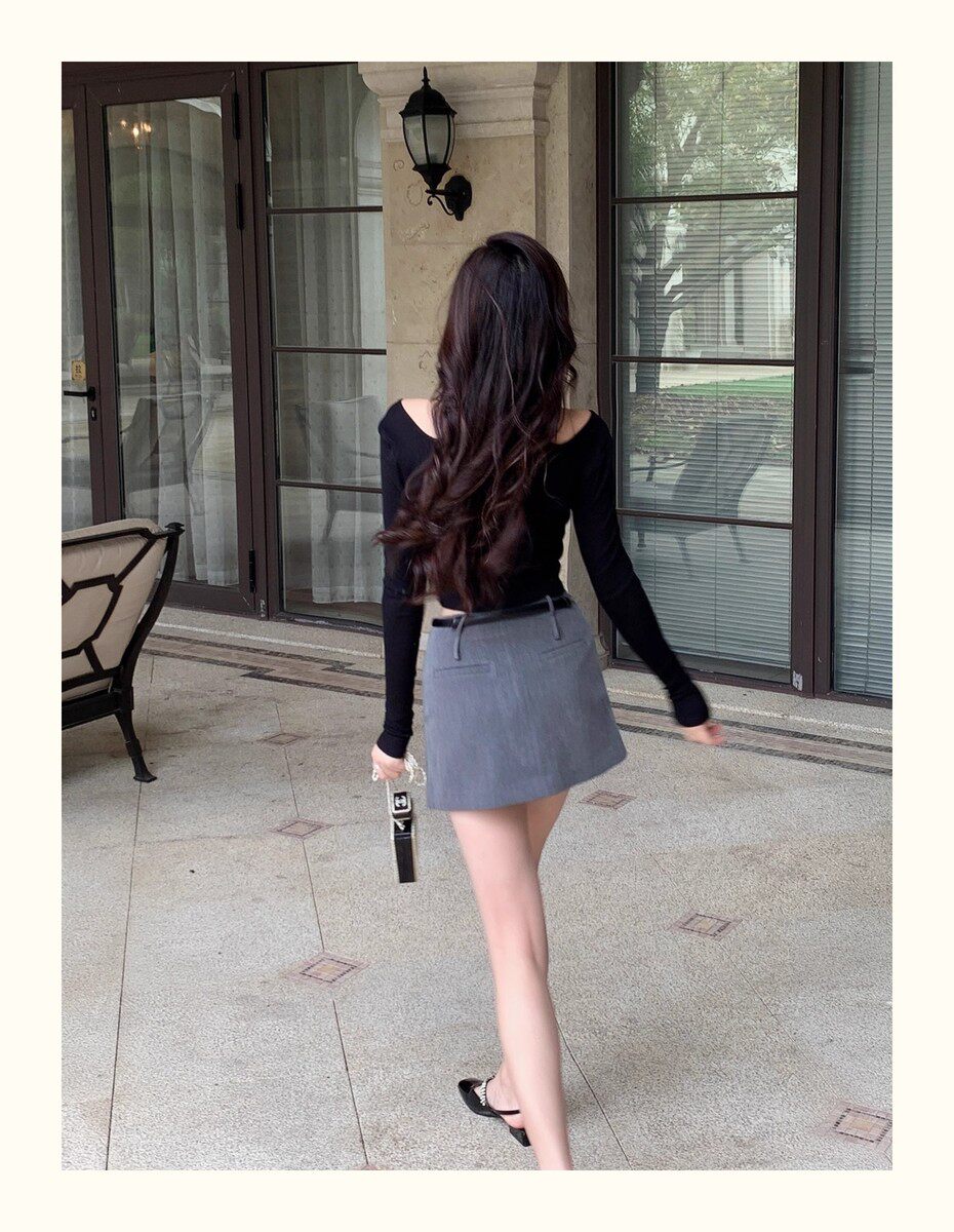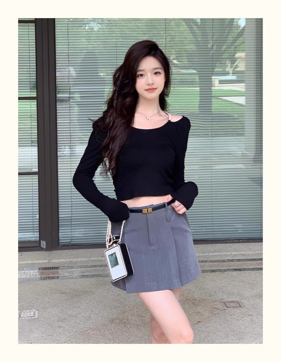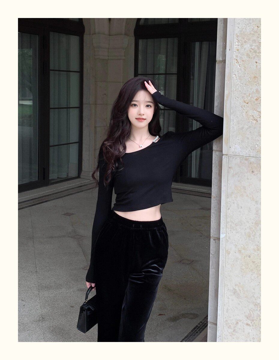 Hollin Rhinestone Knitted Long-Sleeved T-Shirt for Women, Spring and Autumn, Black, Waist-Cinching, Slimming Top, Tight-Fitting, High-End Base Shirt