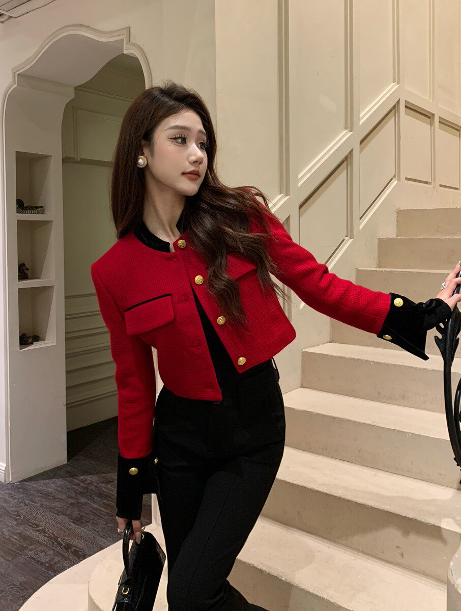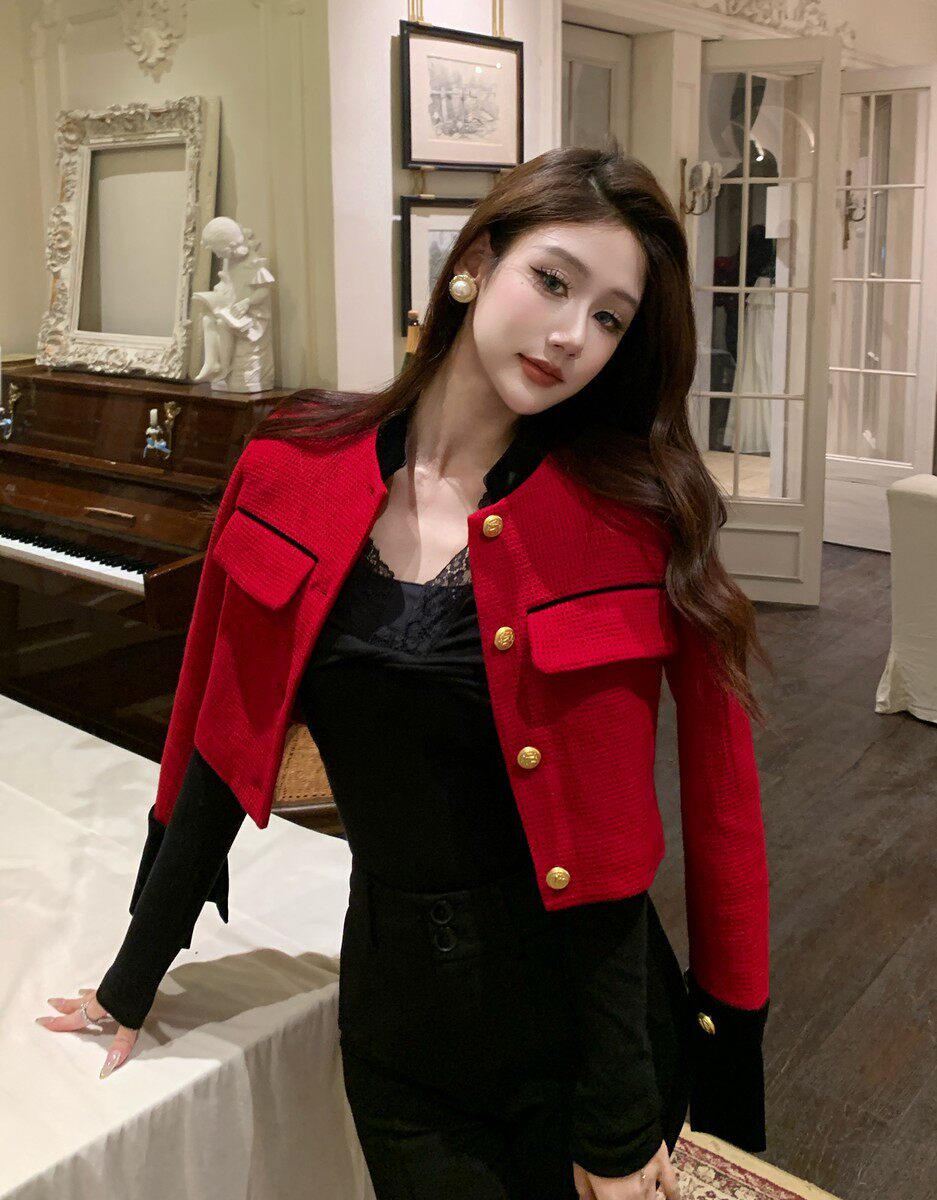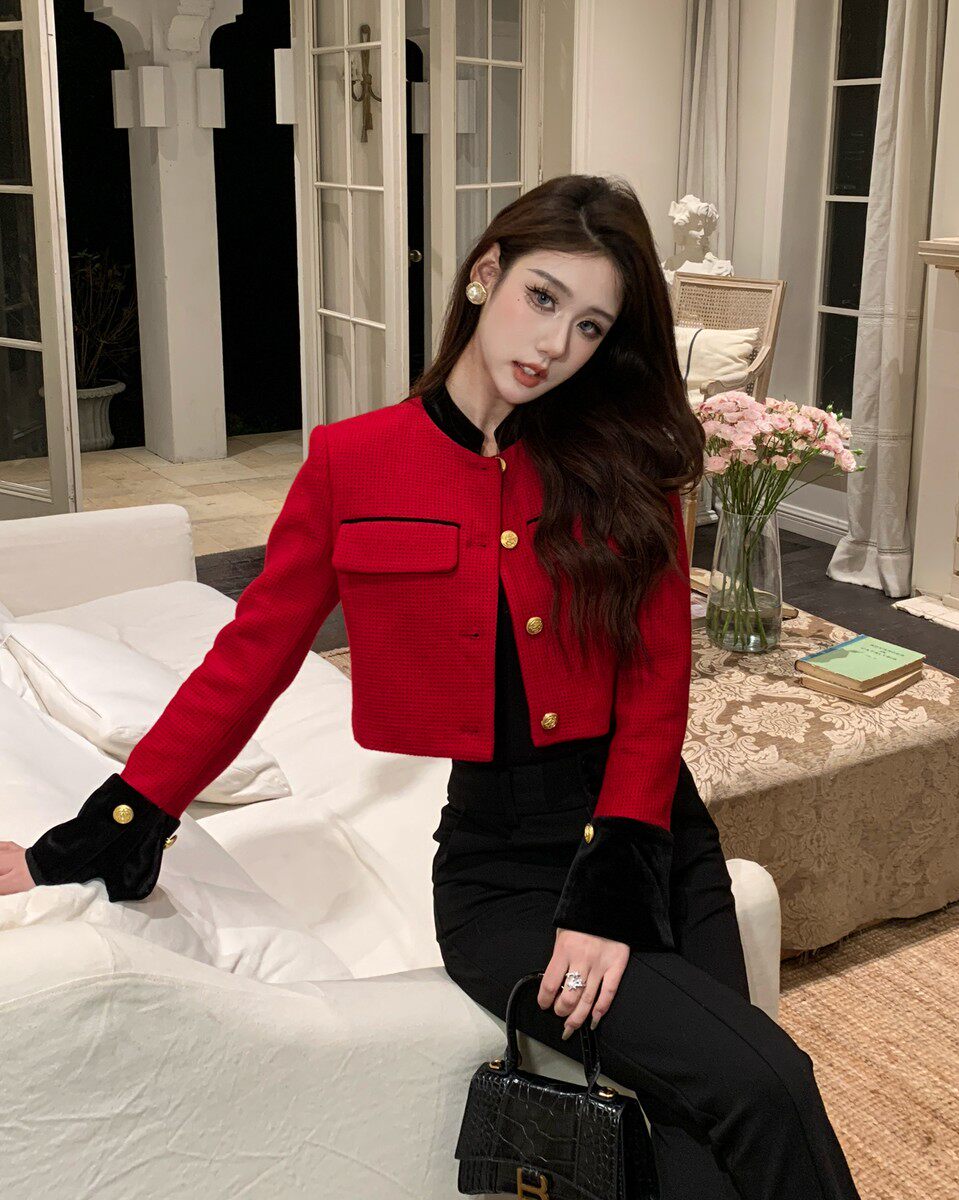 Hollinna Bright Red Wool Tweed Jacket for Women, Versatile Short Design with a High-End Feel for Spring, Autumn, and Winter