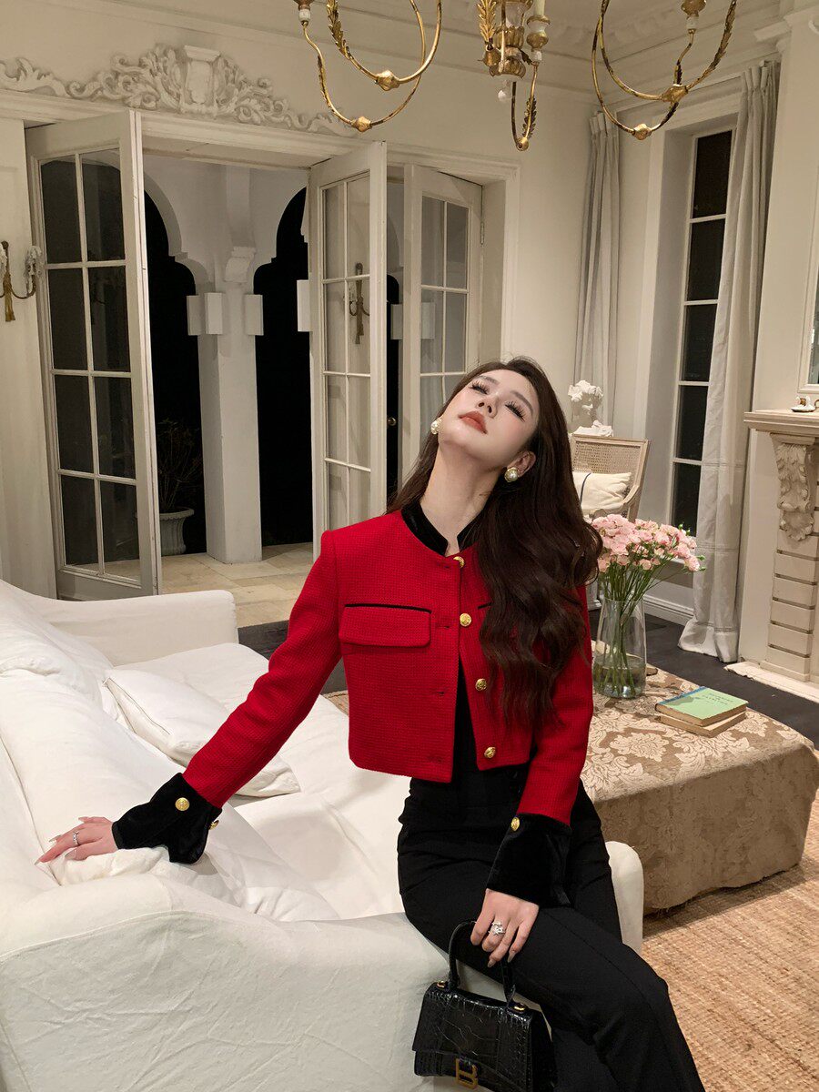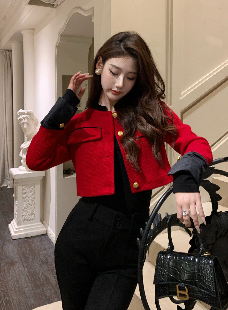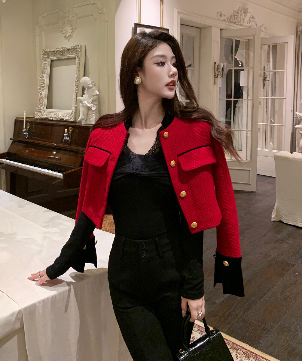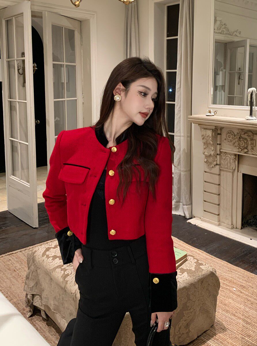 Hollinna Bright Red Wool Tweed Jacket for Women, Versatile Short Design with a High-End Feel for Spring, Autumn, and Winter