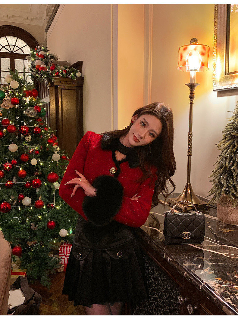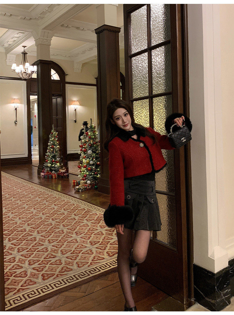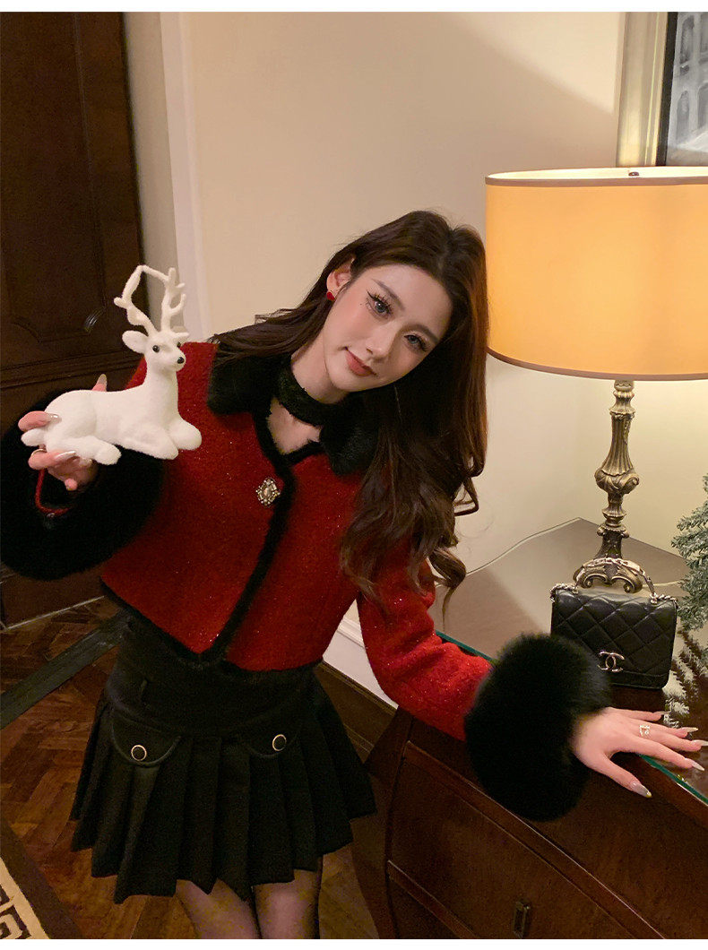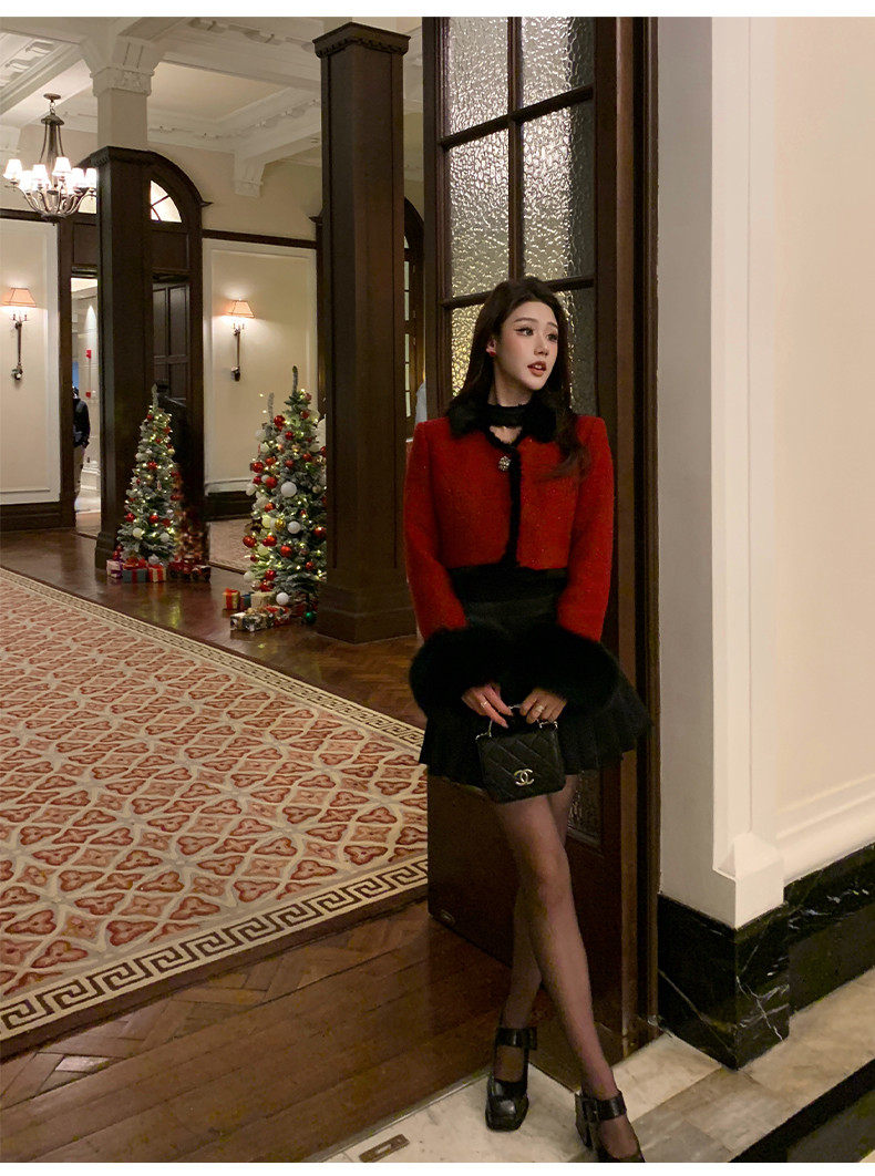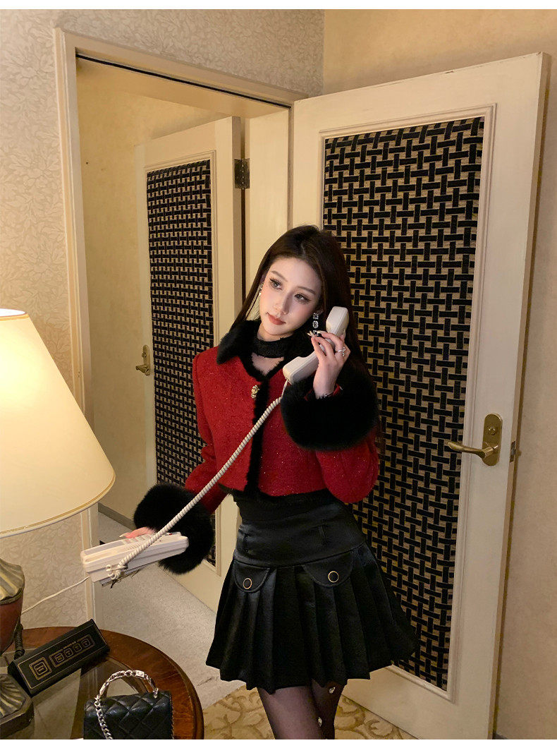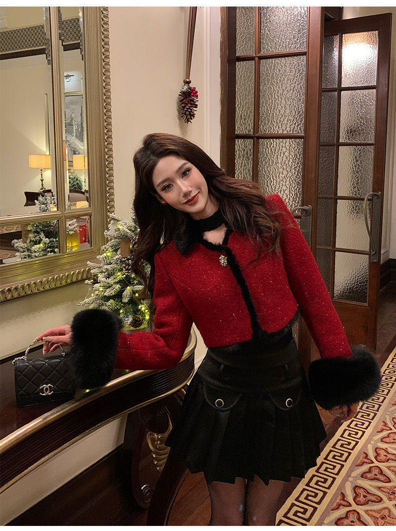 Hollinna Fox Fur Wool Tweed Style Suit for Women Autumn and Winter 2025 New Short Coat Modern Two-Piece Set