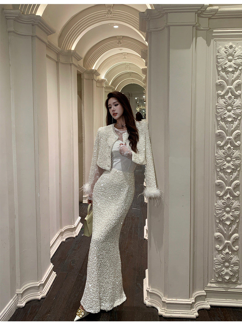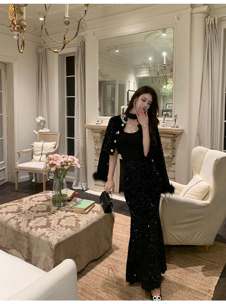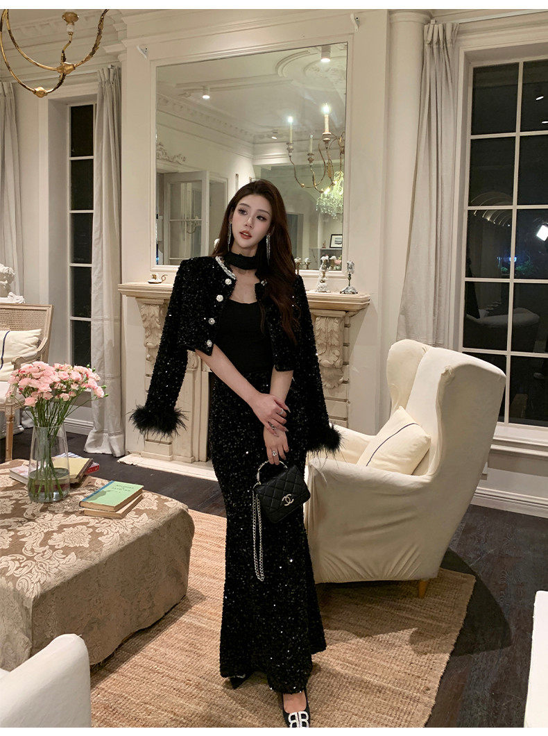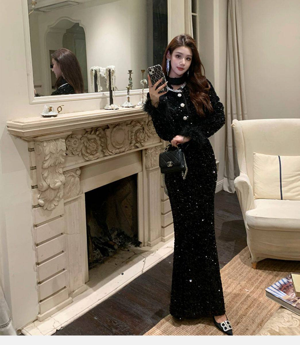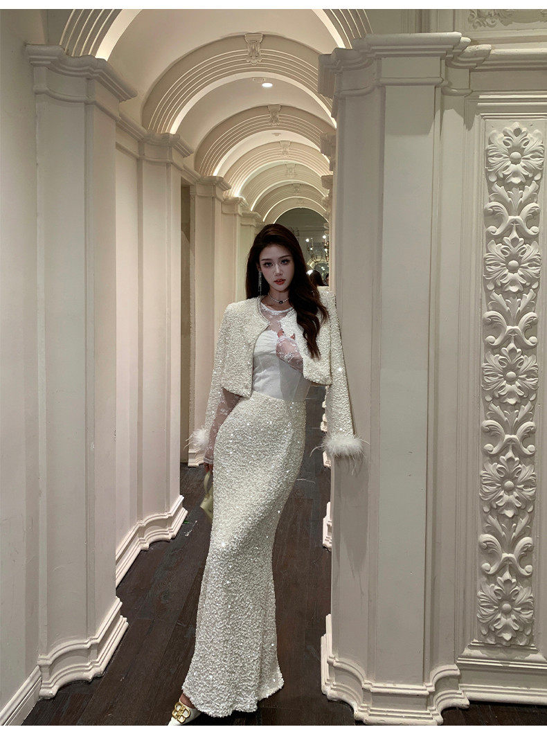 Hollinna Ostrich Feather Dress Evening Gown for Women Sequined Fishtail Skirt Autumn and Winter Light Luxury High-End Birthday Party Complete Set