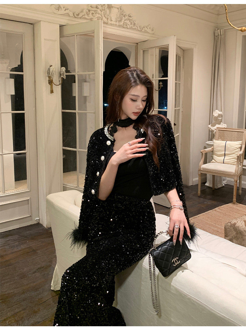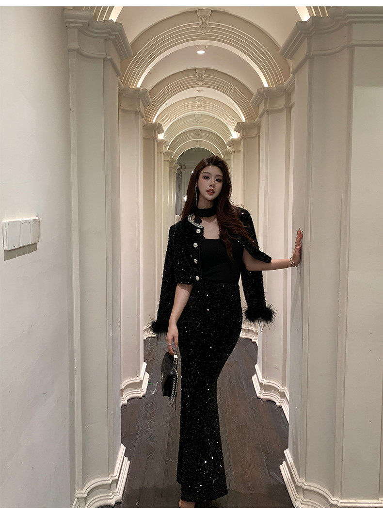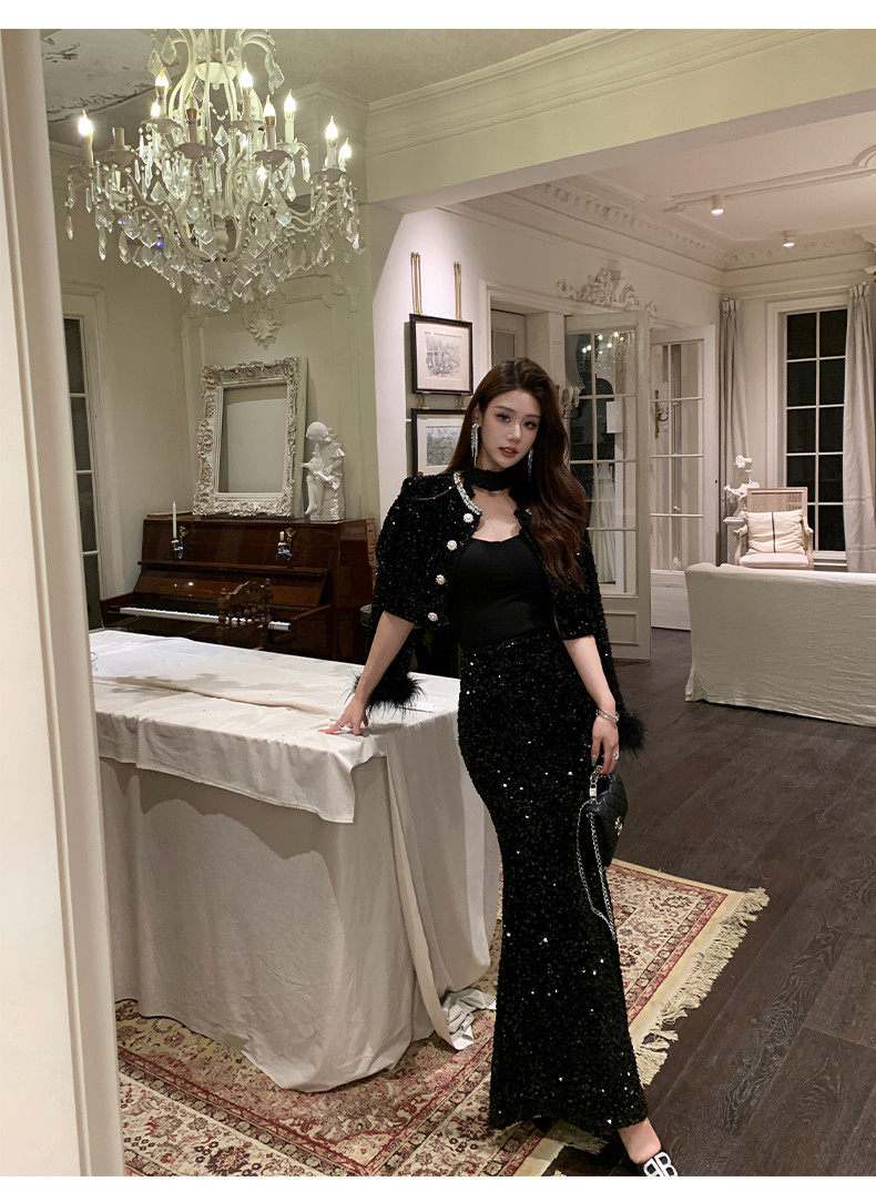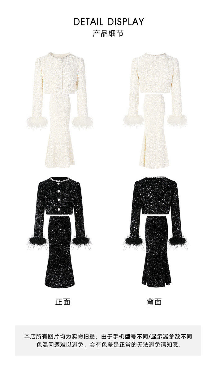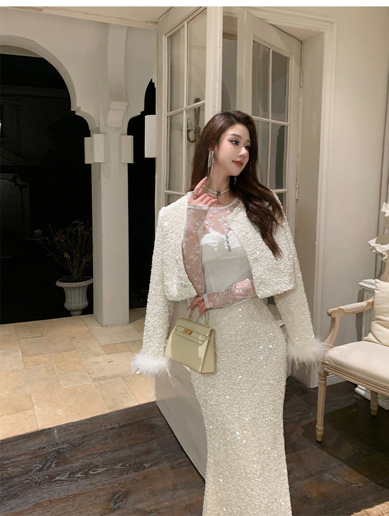 Hollinna Ostrich Feather Dress Evening Gown for Women Sequined Fishtail Skirt Autumn and Winter Light Luxury High-End Birthday Party Complete Set