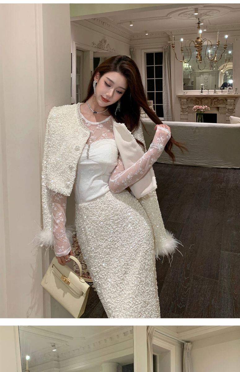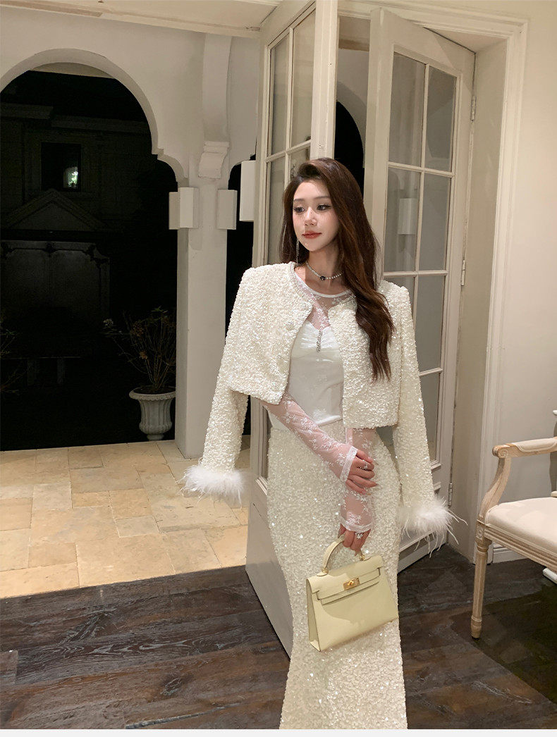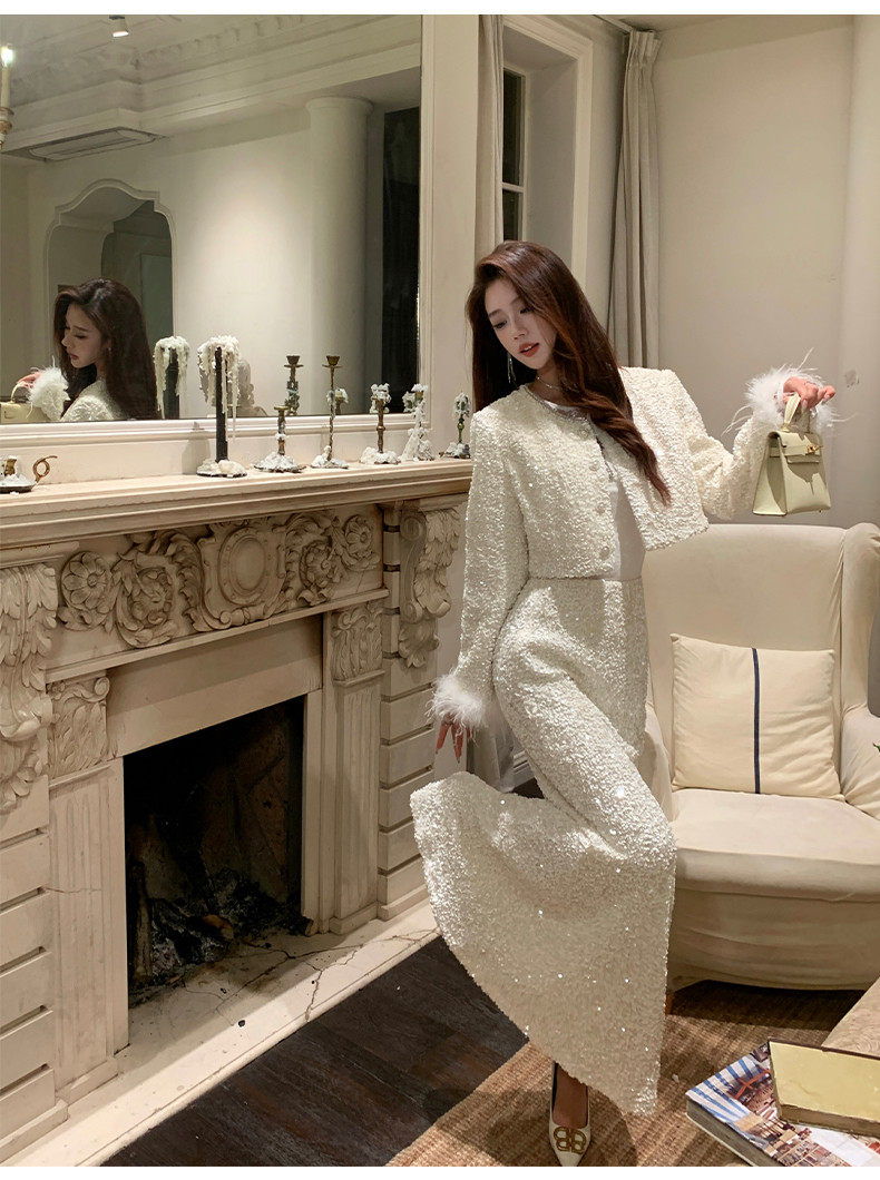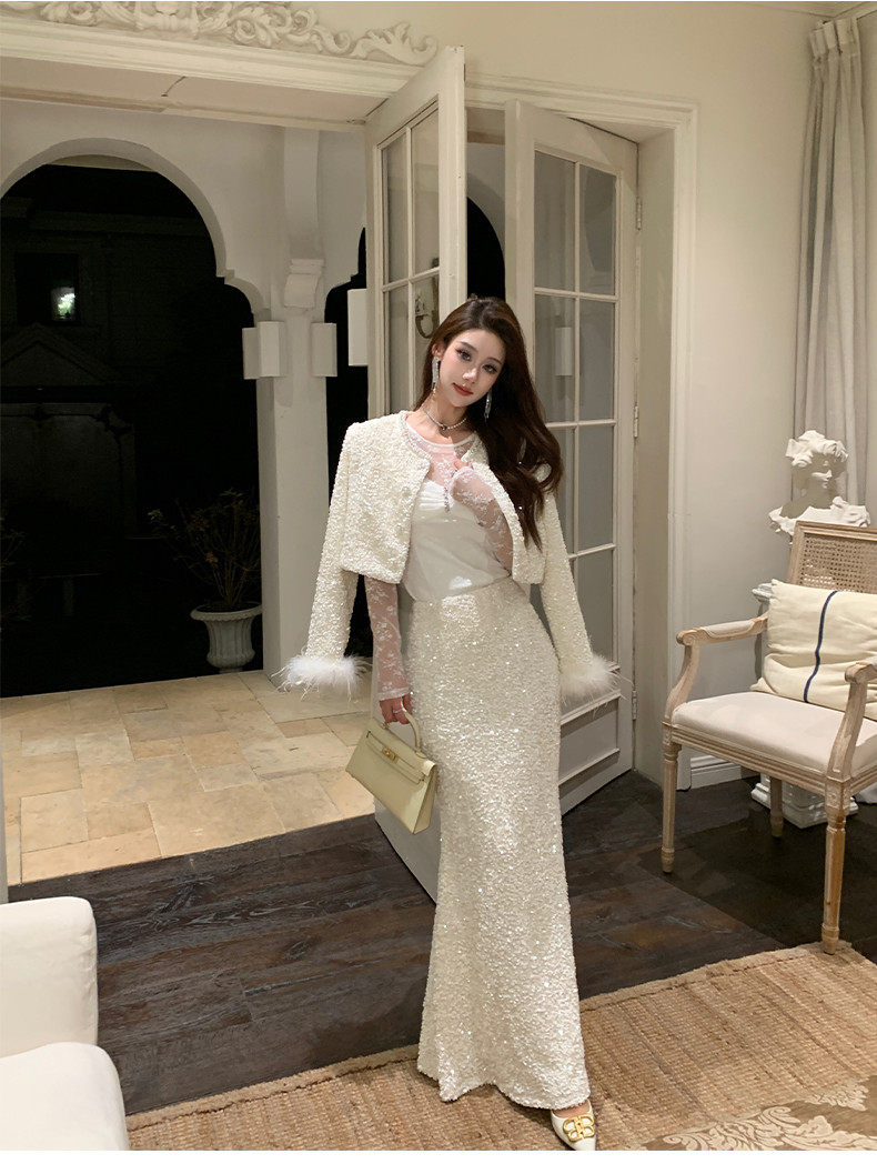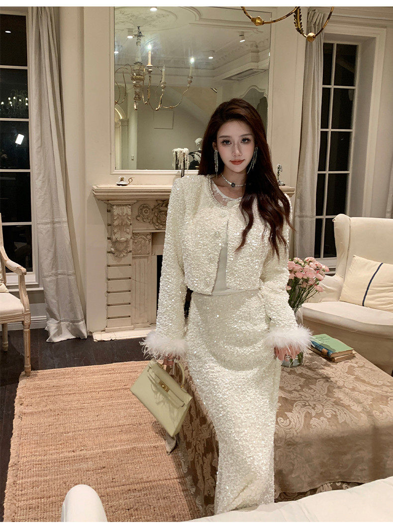 Hollinna Ostrich Feather Dress Evening Gown for Women Sequined Fishtail Skirt Autumn and Winter Light Luxury High-End Birthday Party Complete Set