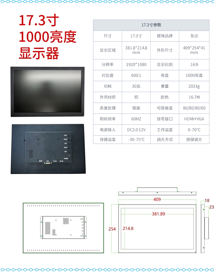 Color Classification 10.1 Inch 1000 Brightness Display Aluminum Case,10.1 Inch 2000 Brightness Display Aluminum Case,10.1 Inch 2000Cd with Touch,11.6-Inch 1000 Brightness Display Aluminum Case,12.1 Inch 1000 Brightness Display Sheet Metal,12.1 Inch 1000 Brightness Display,13.3-Inch 1000 Brightness Display Aluminum Case,13.3-Inch 2000 Brightness Industrial Monitor,14-Inch 1000 Brightness Monitor,15-Inch 1000Cd Industrial Monitor Sheet Metal,15.6 Inch 1000Cd Industrial Monitor 1080P,15.6-Inch 1000 Brightness 1080P Display,17.3-Inch 1000 Brightness Display Aluminum Case,18.5-Inch 1000Cd Monitor Sheet Metal Casing,21.5 Inch 1000 Brightness Commercial Display Aluminum,21.5inch Commercial Display 1500 Brightness,21.5 Inch 1000 Brightness Industrial Monitor Aluminum,21.5 Inch 2500Cd 24V Monitor,21.5 Inch 2500Cd 220V Monitor,32-Inch 2000 Brightness Ultra-Narrow Bezel Monitor,43-Inch 2500Cd High-Brightness Display