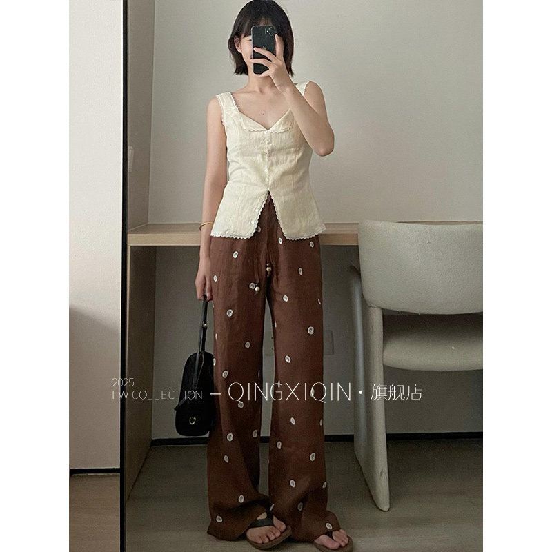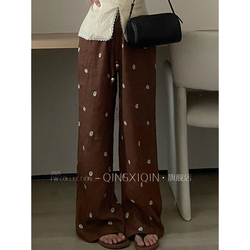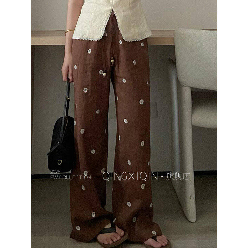 Ready to Ship~ Old Money Cashew Embroidery Linen Pants for Women, Summer Thin Style ◆ Loose Bf Style Lazy-Fit Slimming Wide-Leg Pants