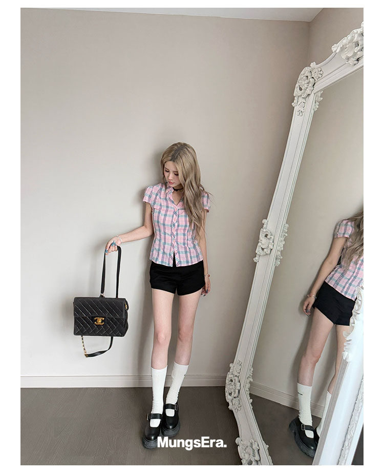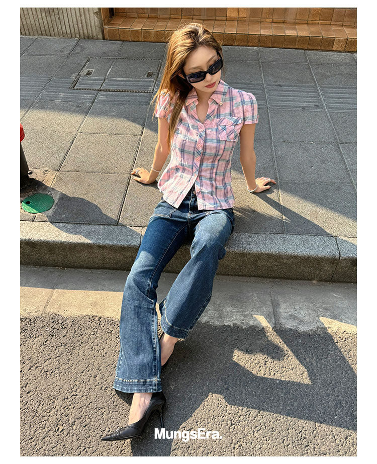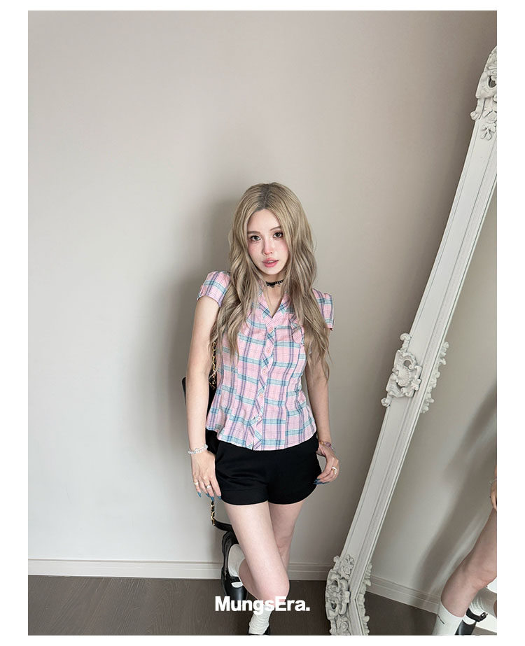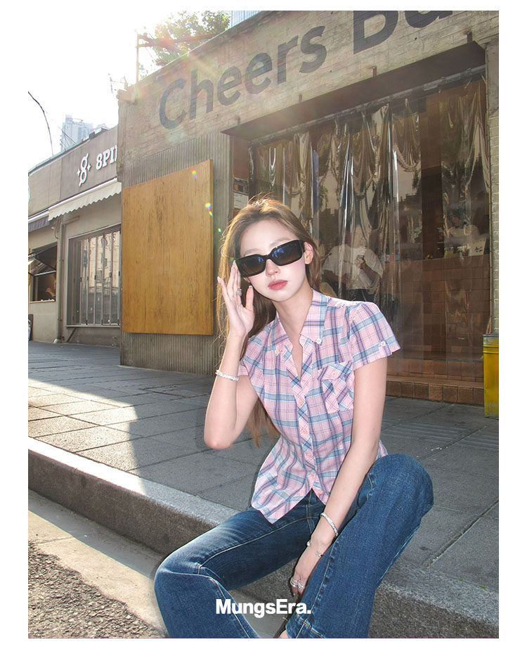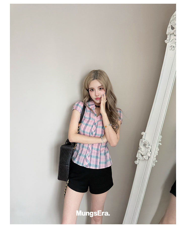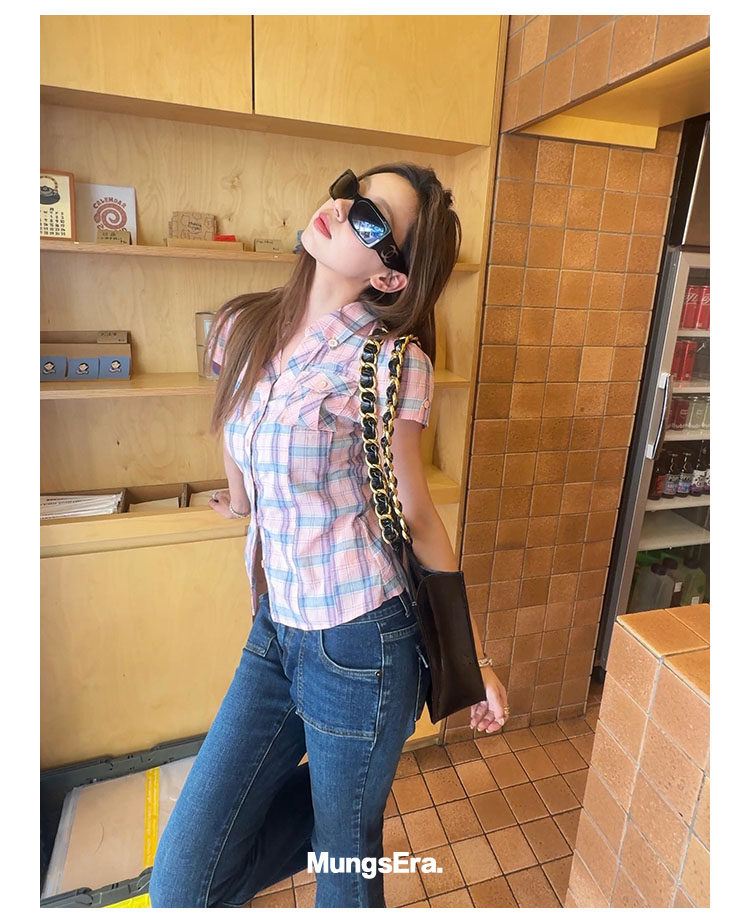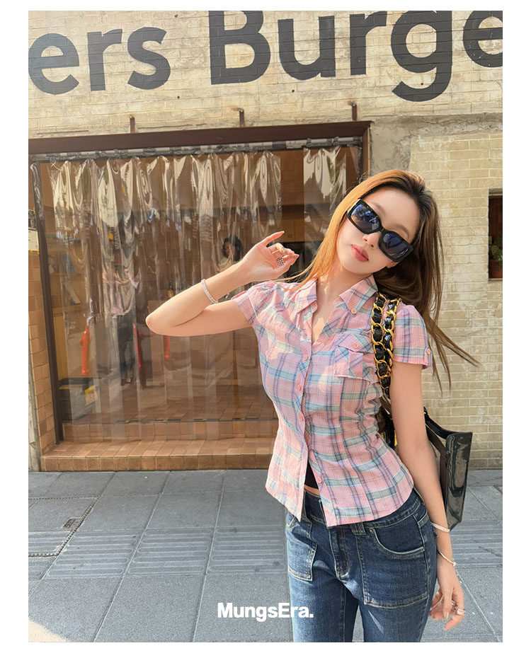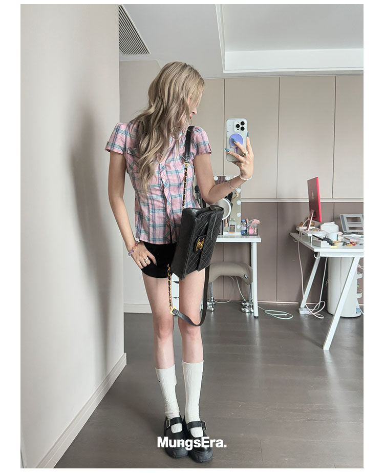Mungsera's Original Retro Plaid Cinched Waist Slim-Fit Shirt Plaid Short-Sleeve Shirt