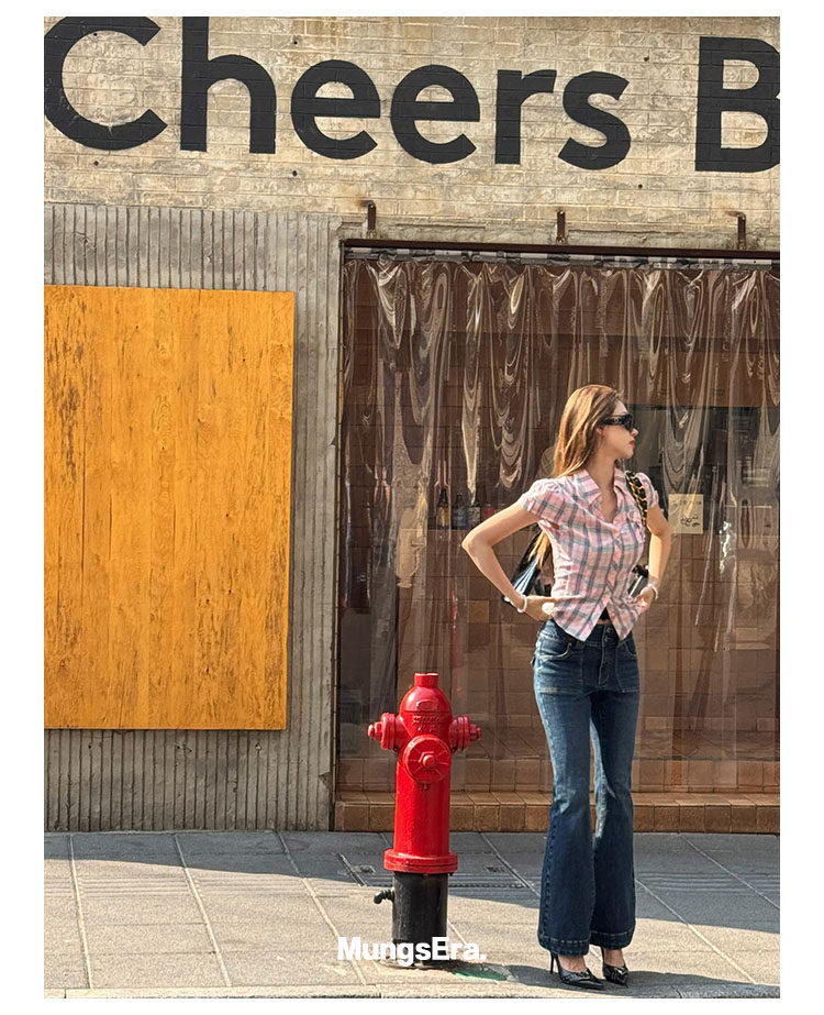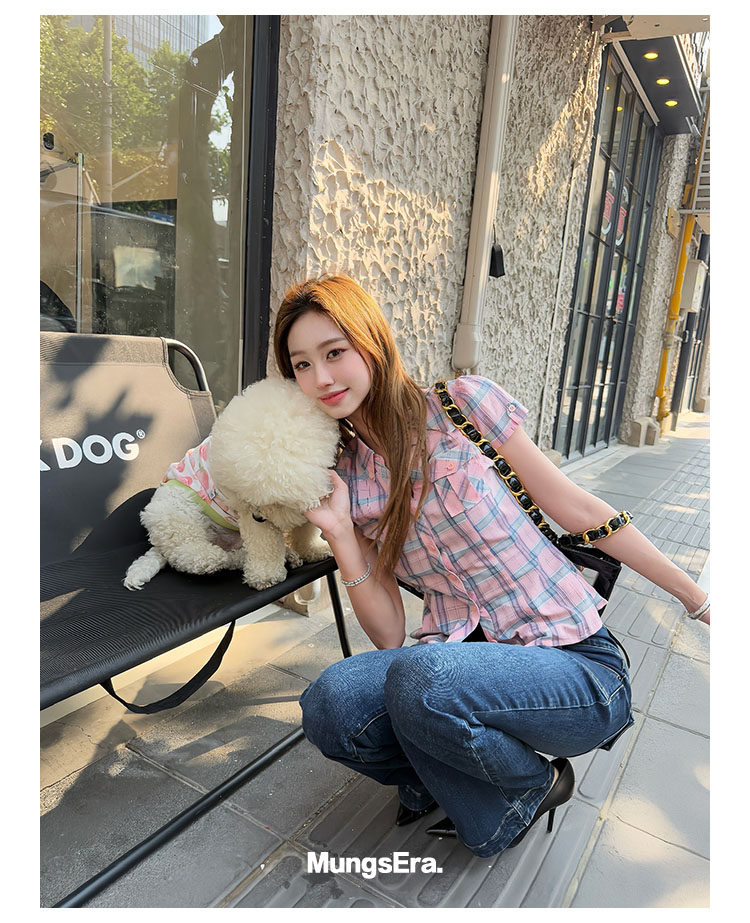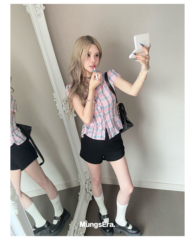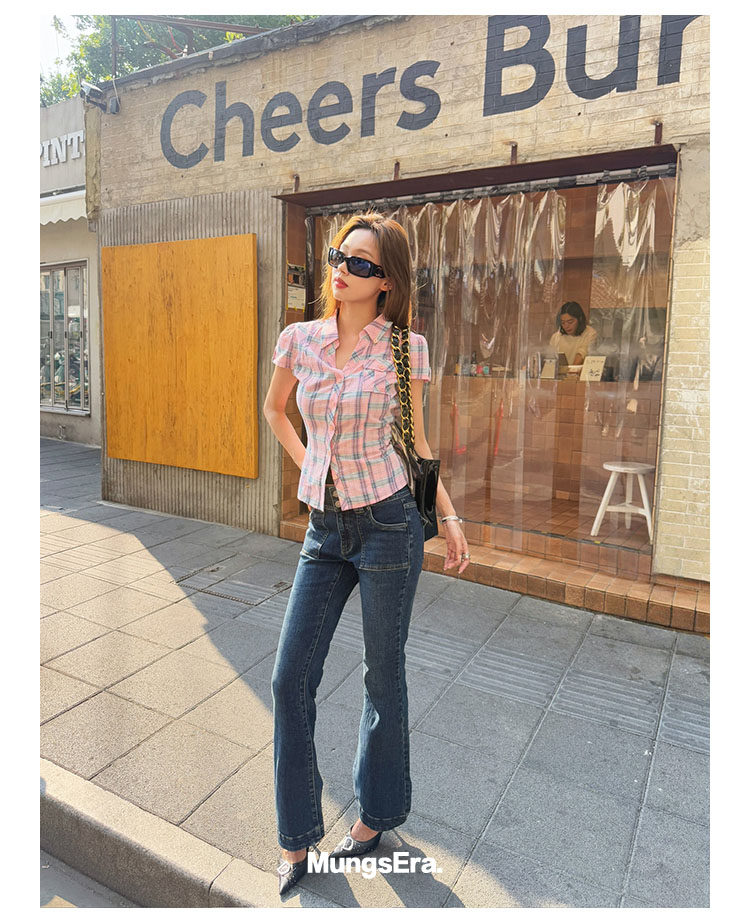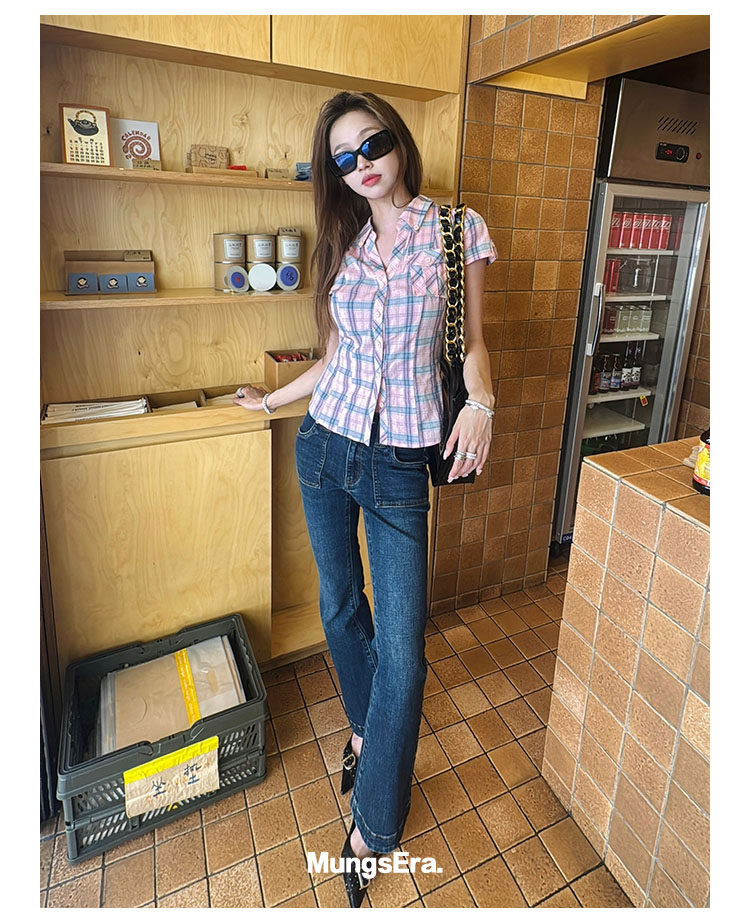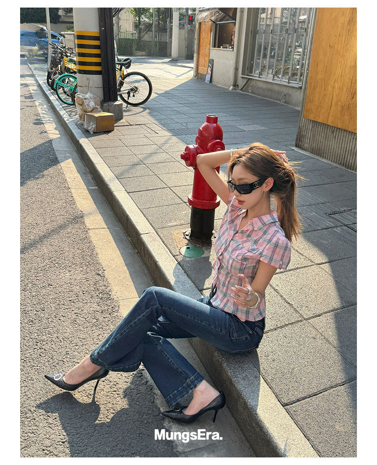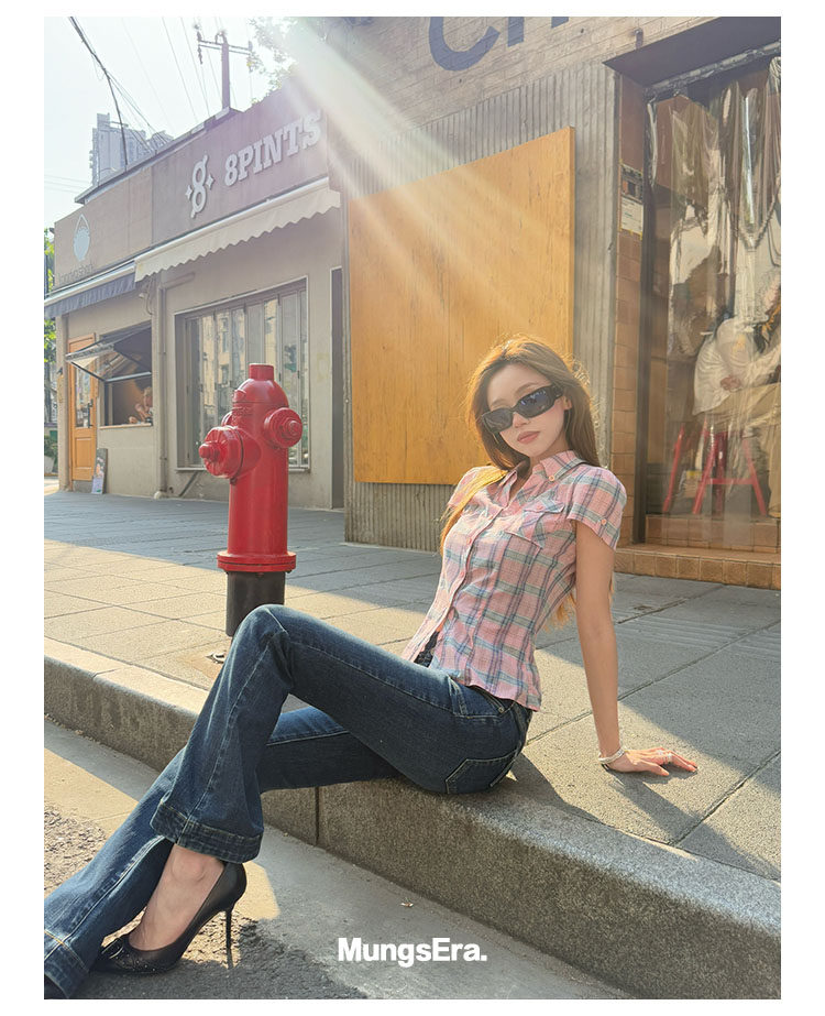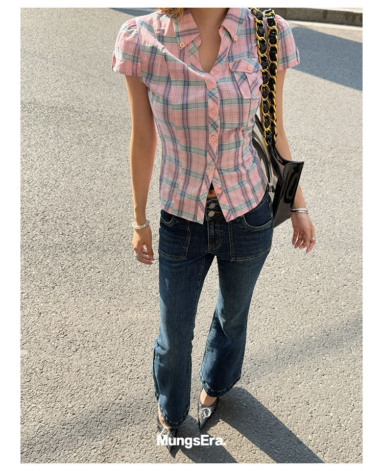 Mungsera's Original Retro Plaid Cinched Waist Slim-Fit Shirt Plaid Short-Sleeve Shirt
