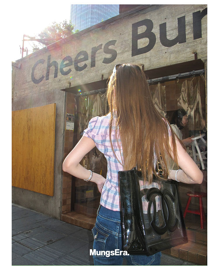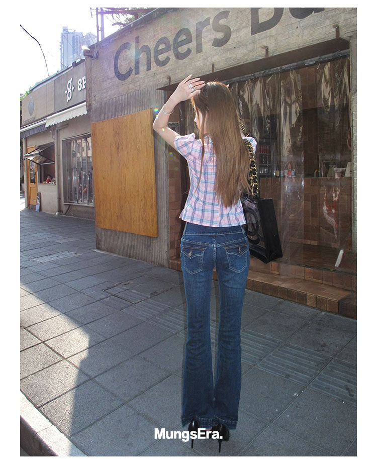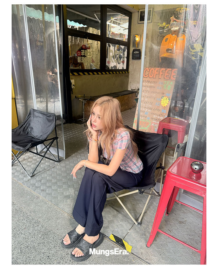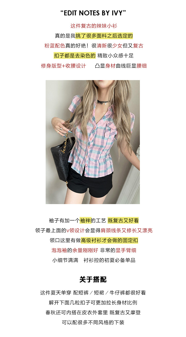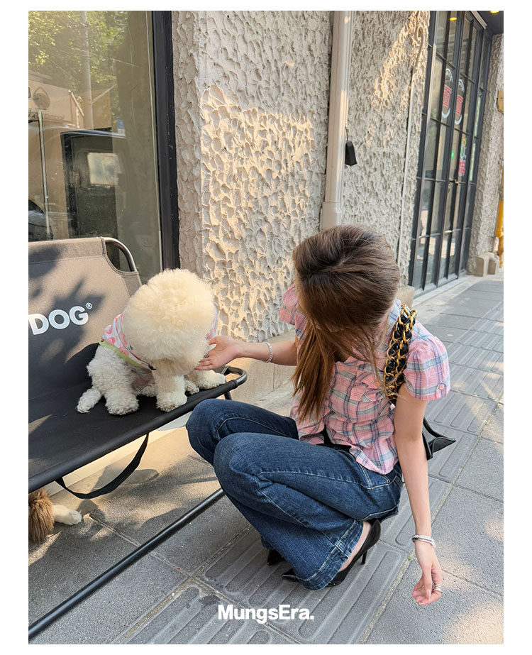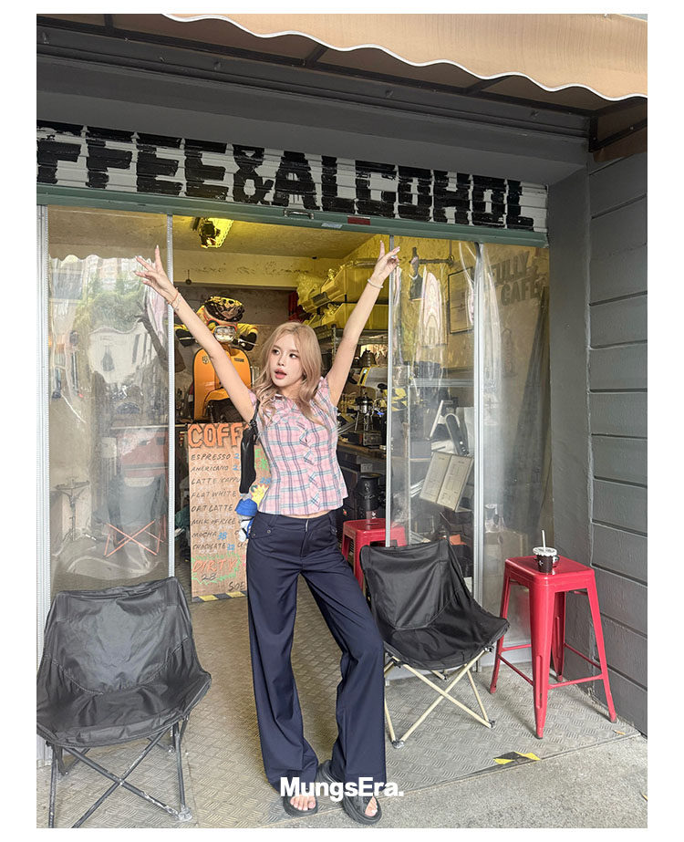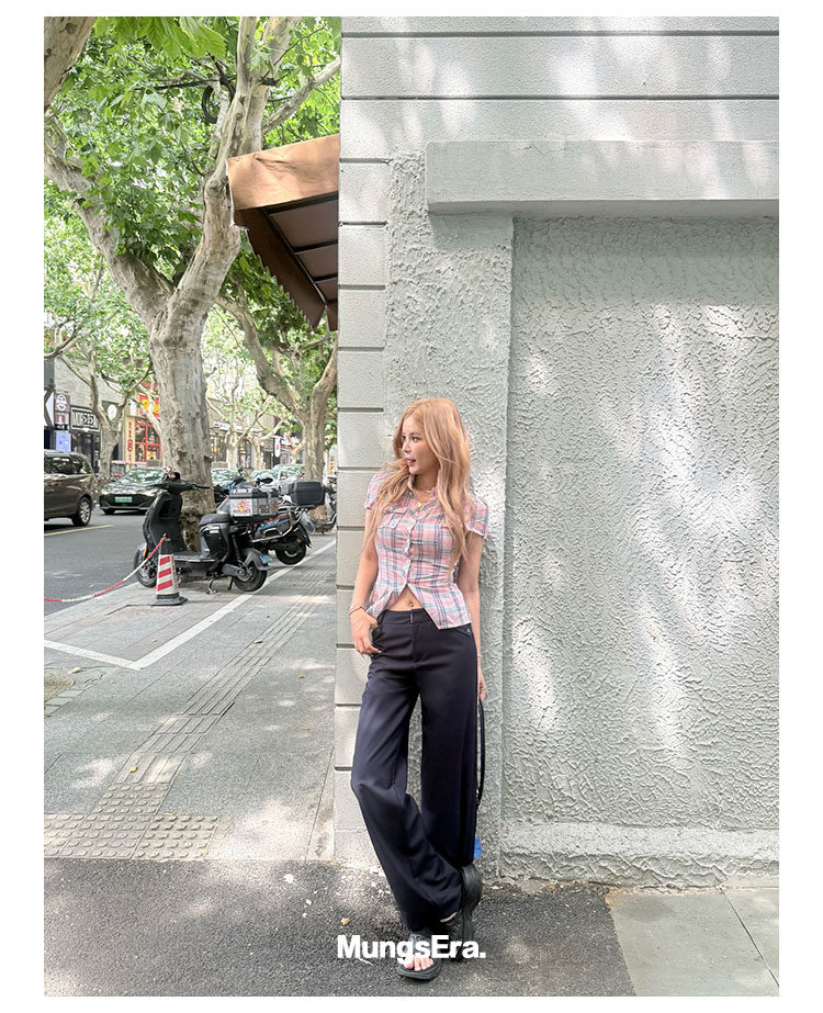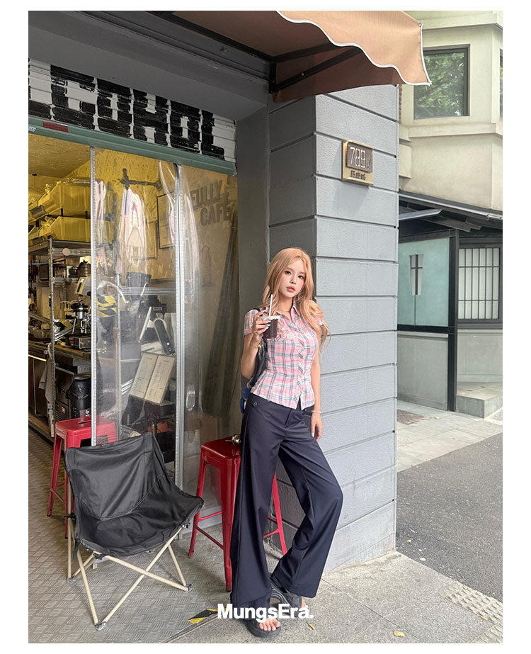 Mungsera's Original Retro Plaid Cinched Waist Slim-Fit Shirt Plaid Short-Sleeve Shirt