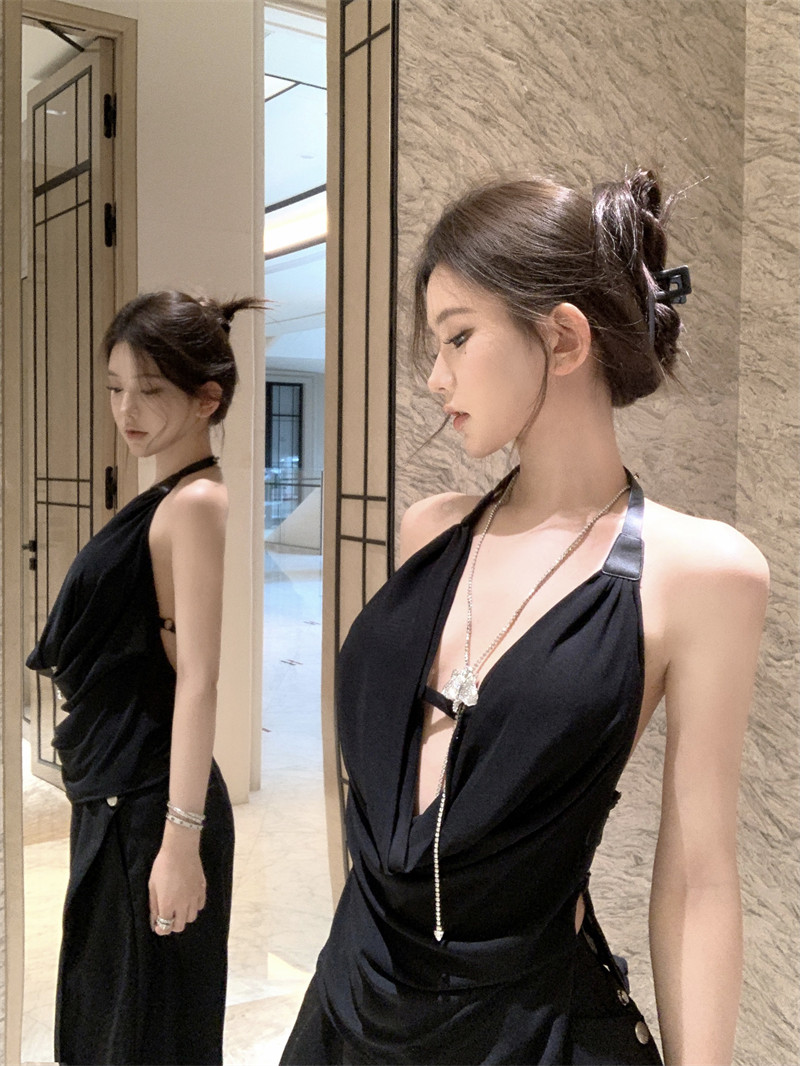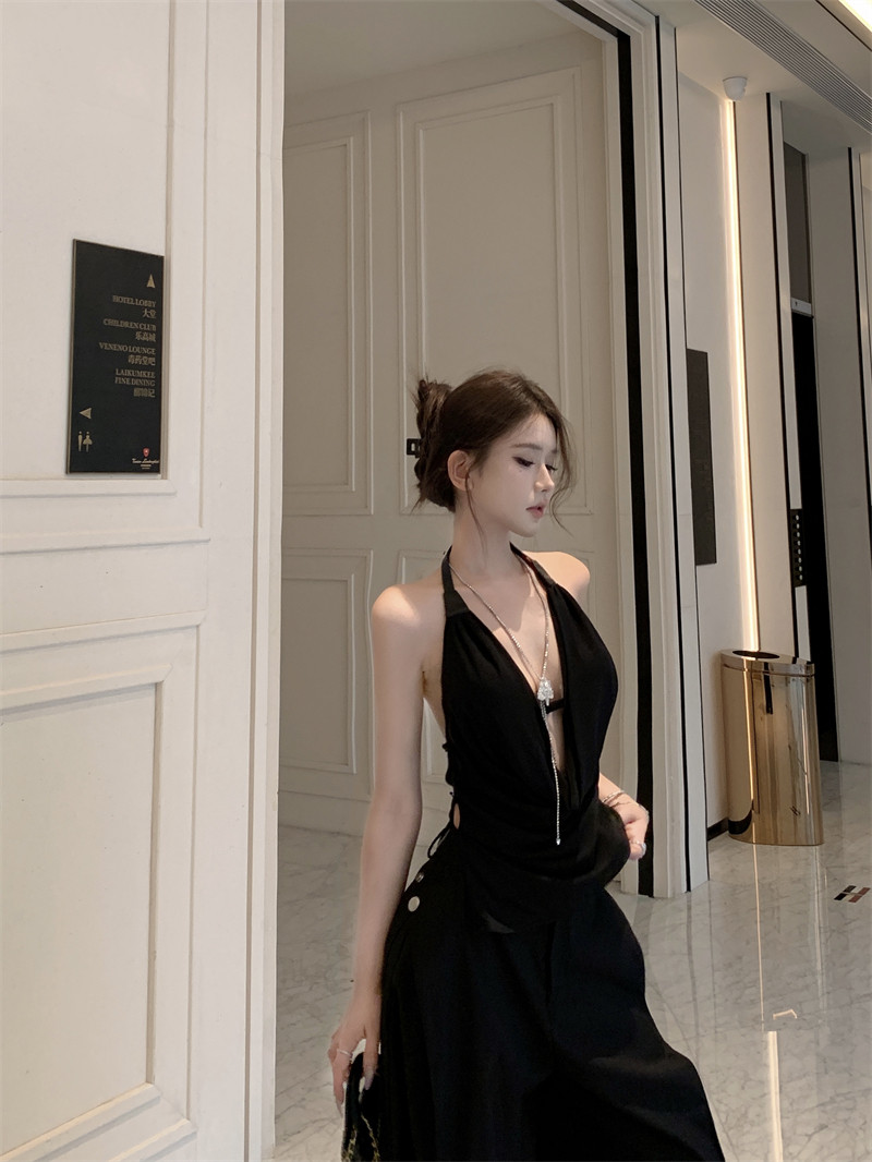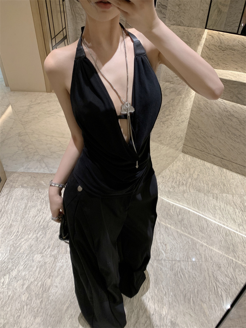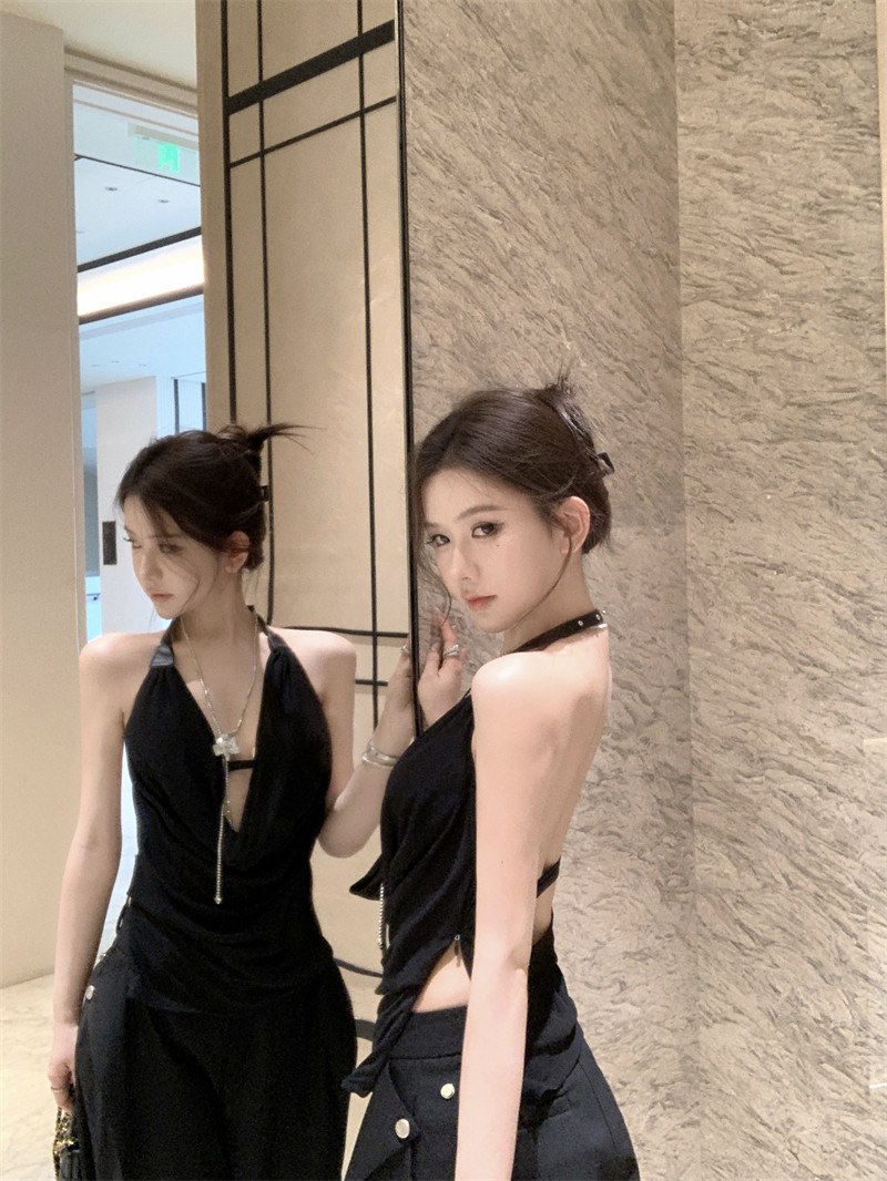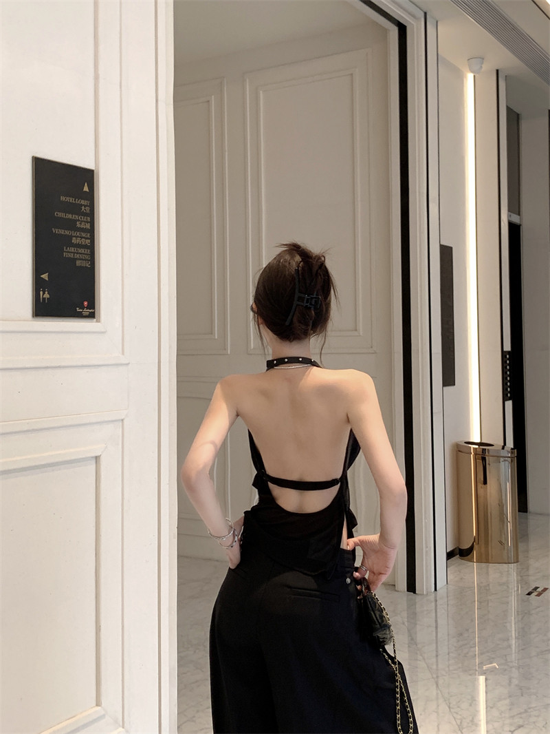 Black High-End Deep V Double-Layer Mesh Belt Halter Neck Sleeveless Tank Top with a Unique Design and Exposed Back