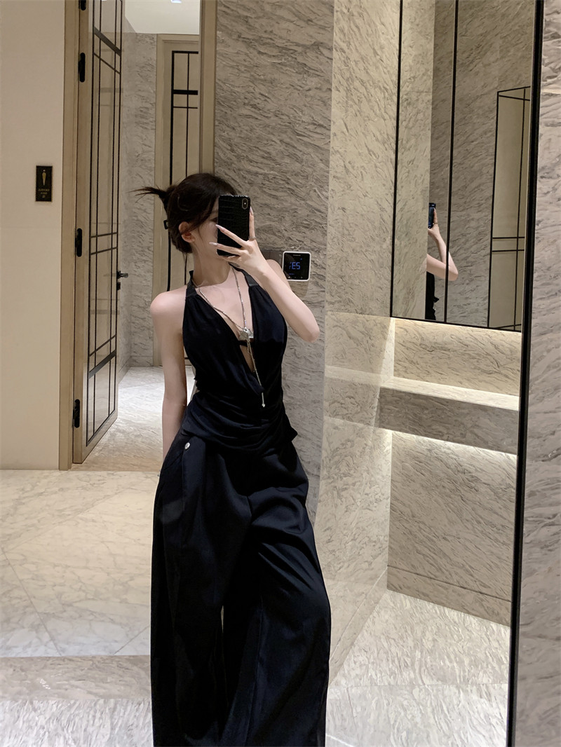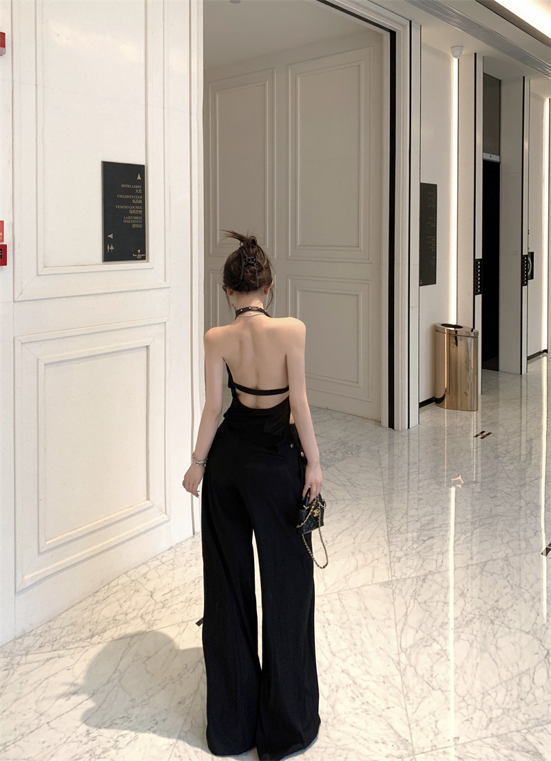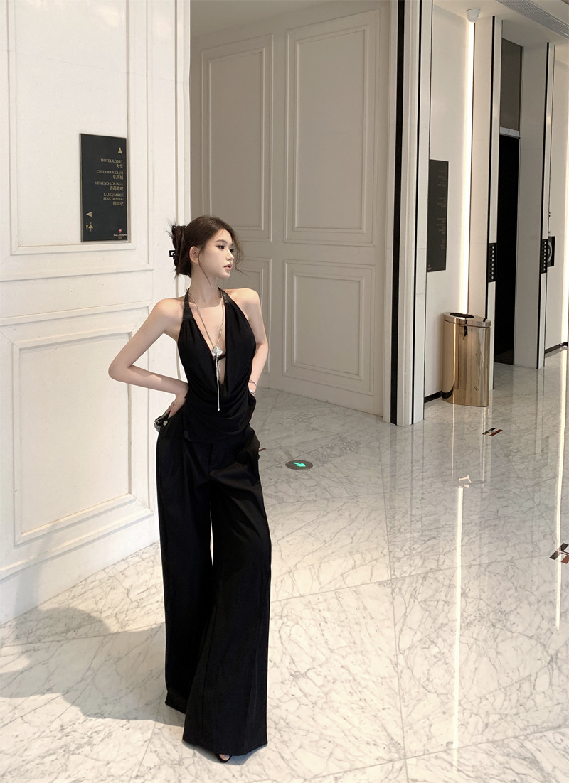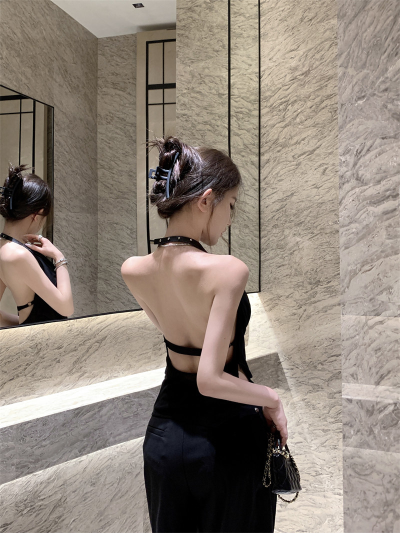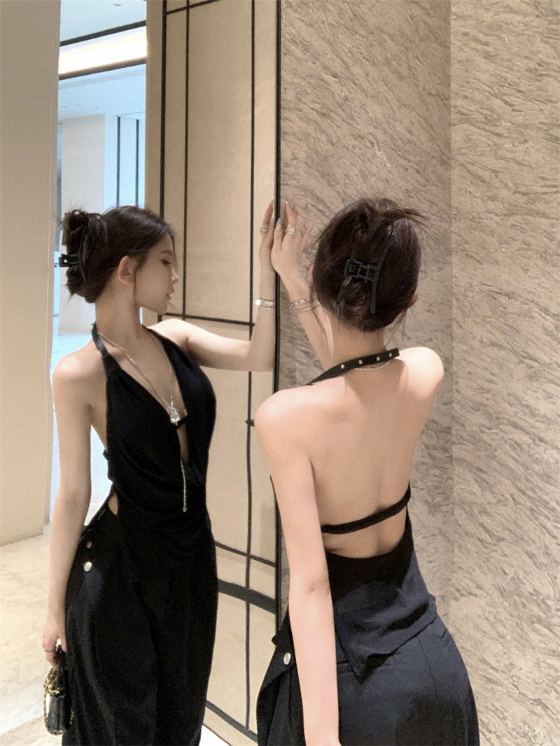 Black High-End Deep V Double-Layer Mesh Belt Halter Neck Sleeveless Tank Top with a Unique Design and Exposed Back