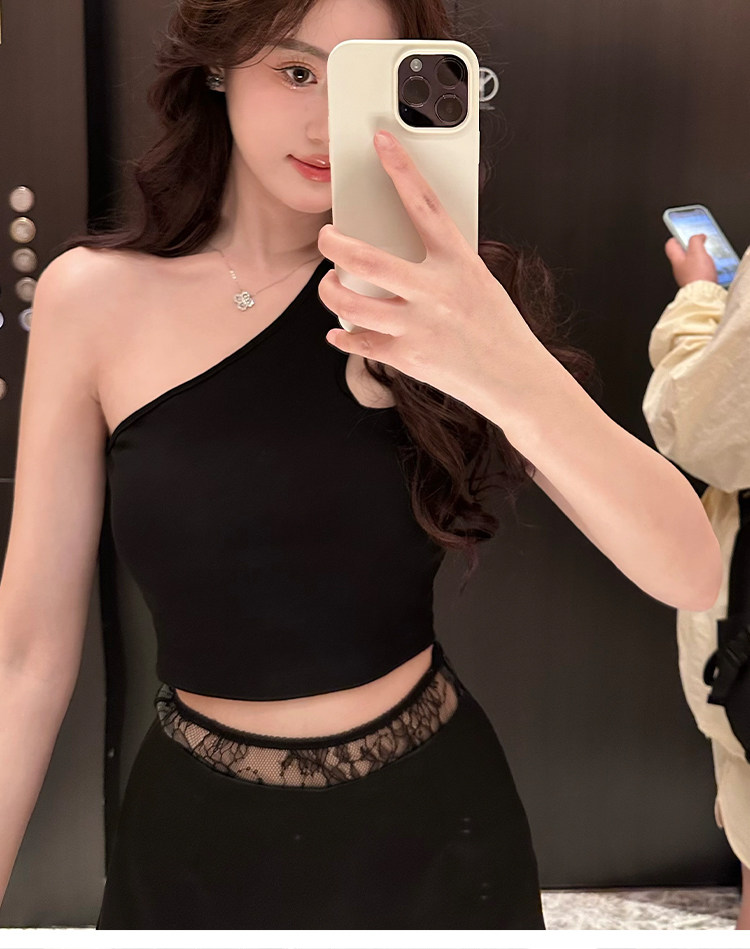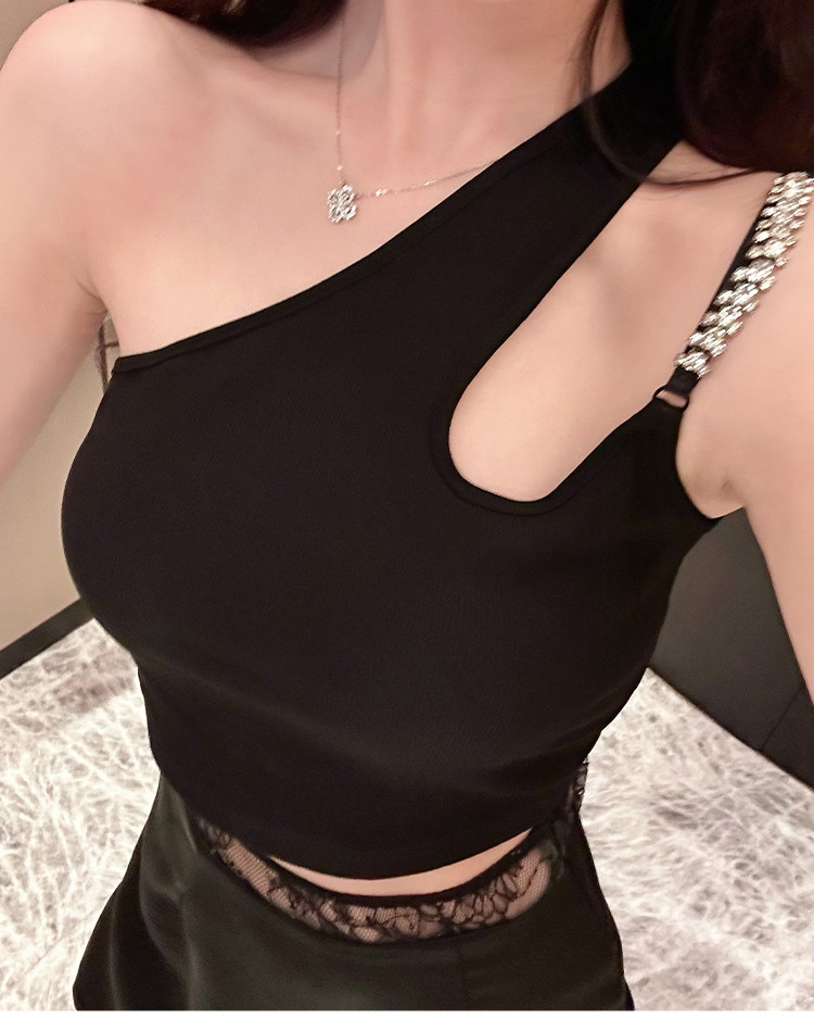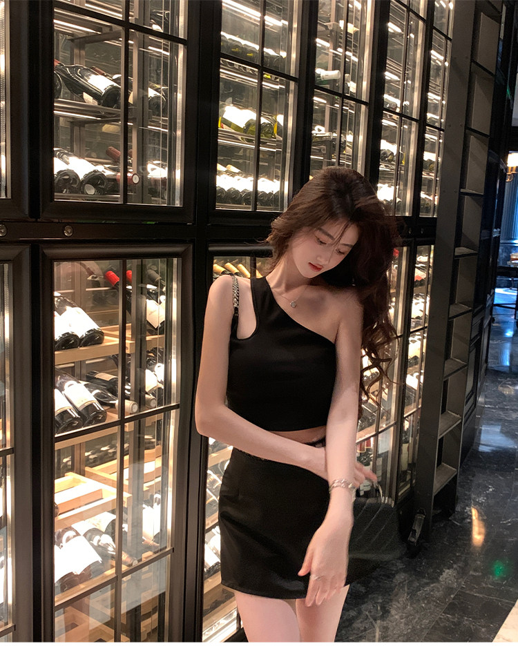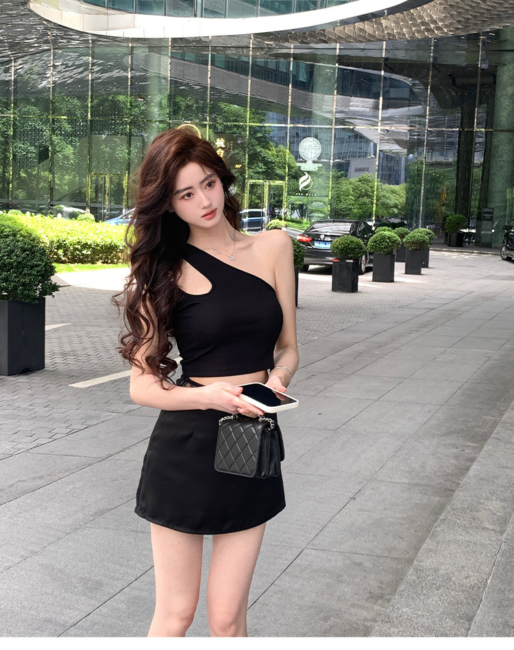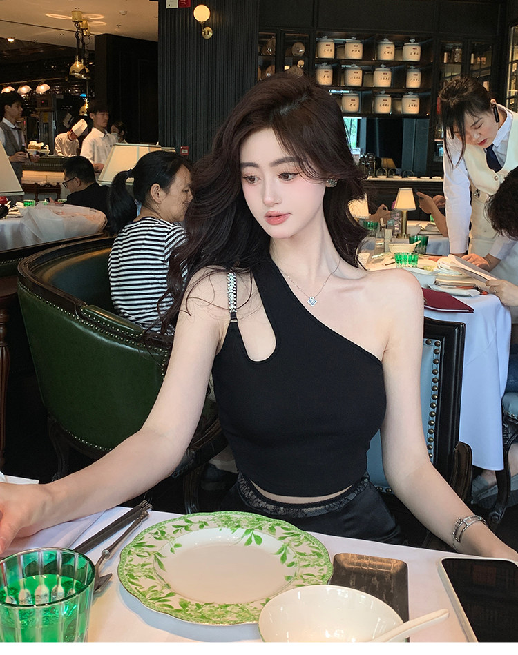 Hollin oblique shoulder sleeveless T-shirt women's summer waist slimming celebrity irregular bust sexy hot girl short top
