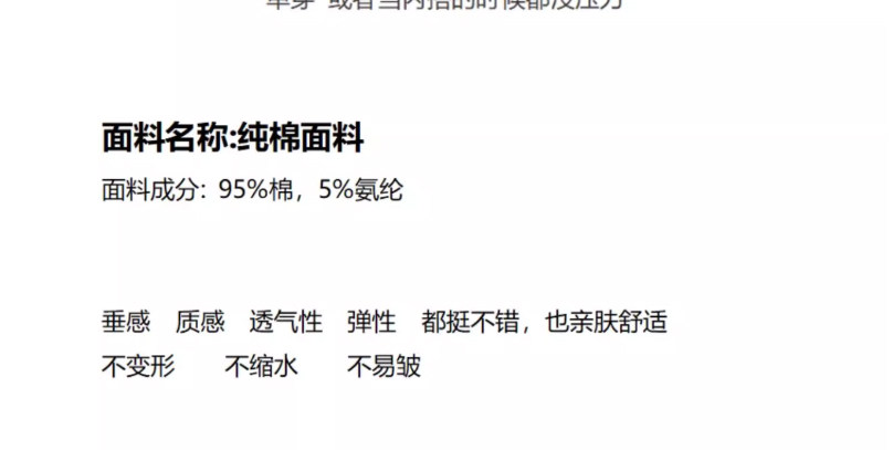 Material Composition 95% Cotton, 5% Polyurethane Elastic Fiber (Spandex)