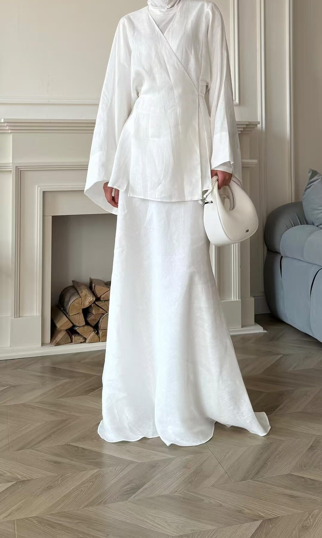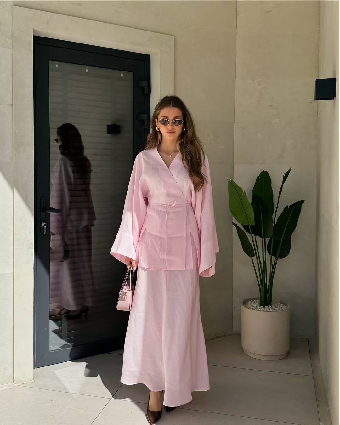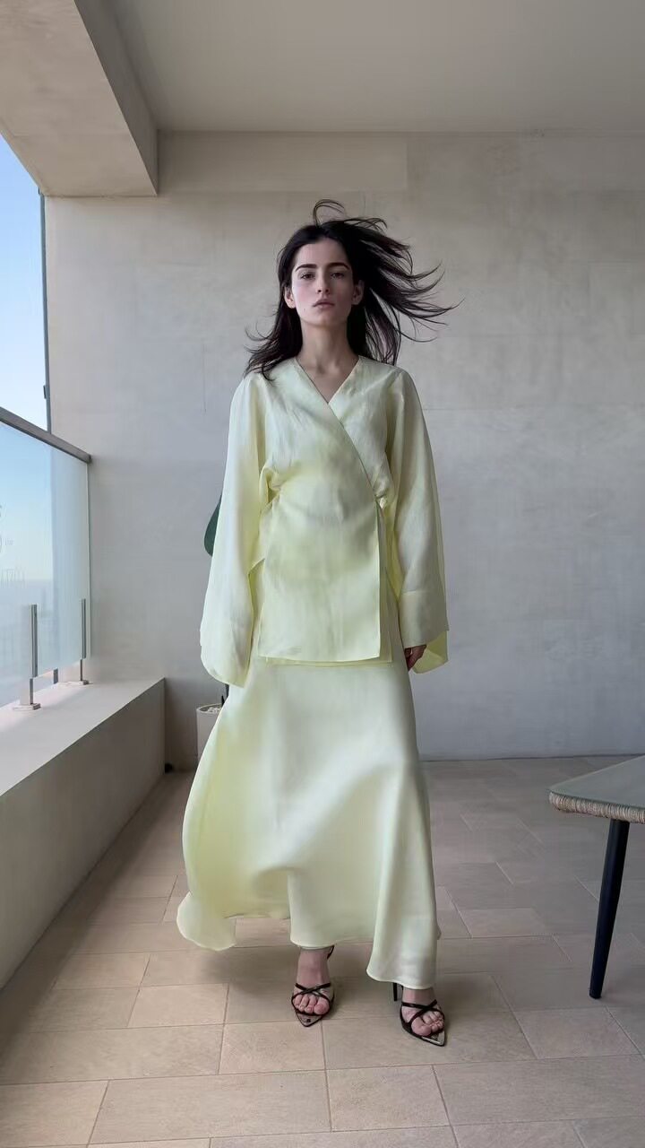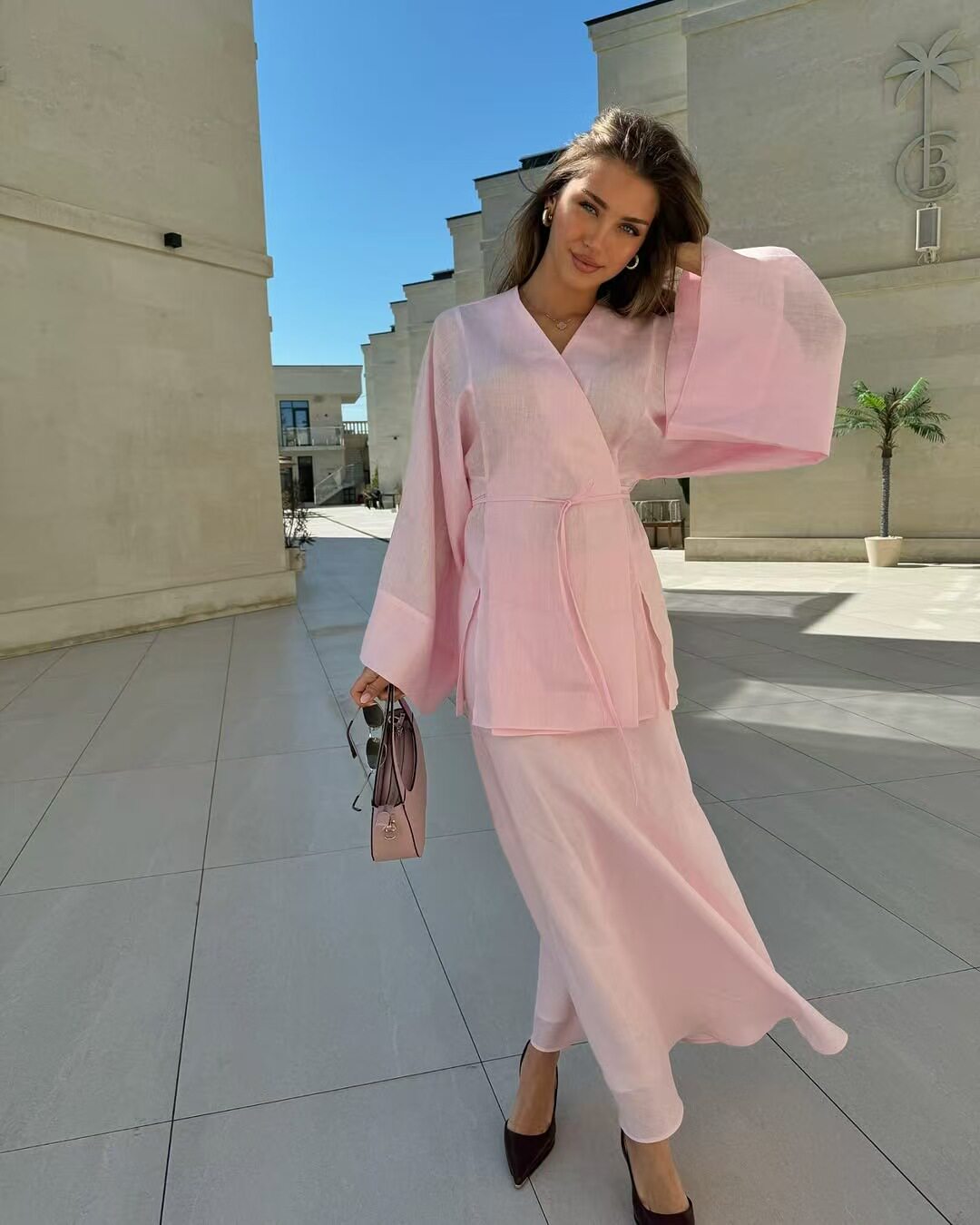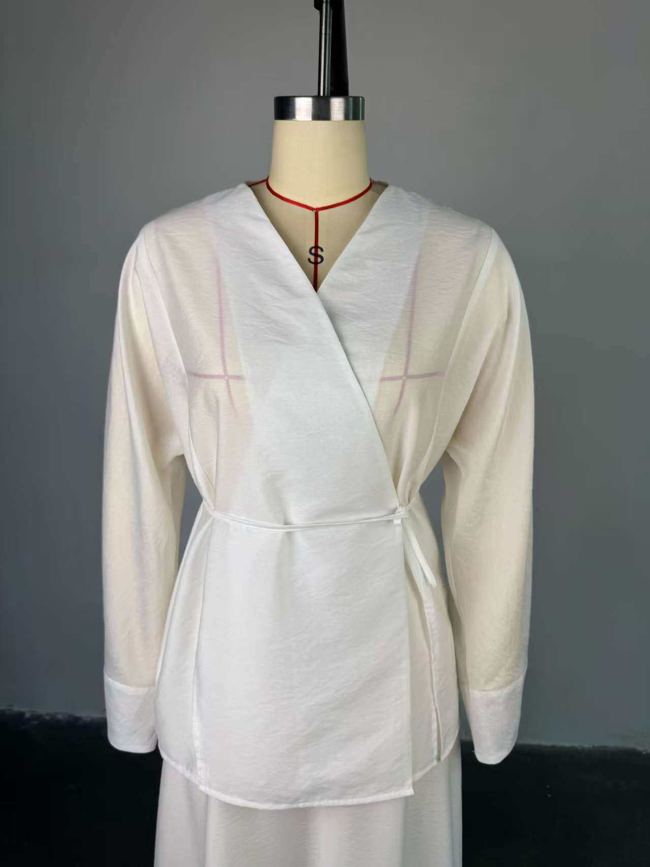 European and American New Style Solid Color V-Neck Tie-Up Cardigan Top and High-Waisted Skirt Set Shirt and Skirt Set