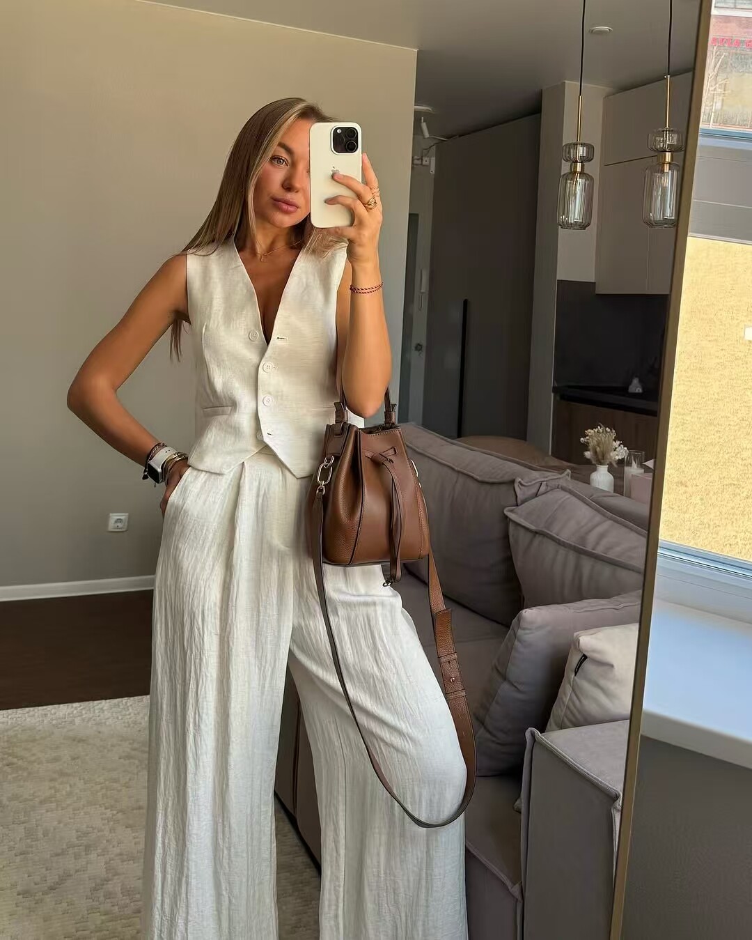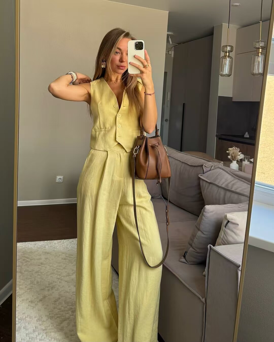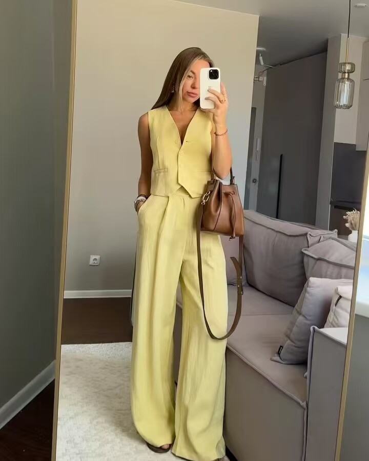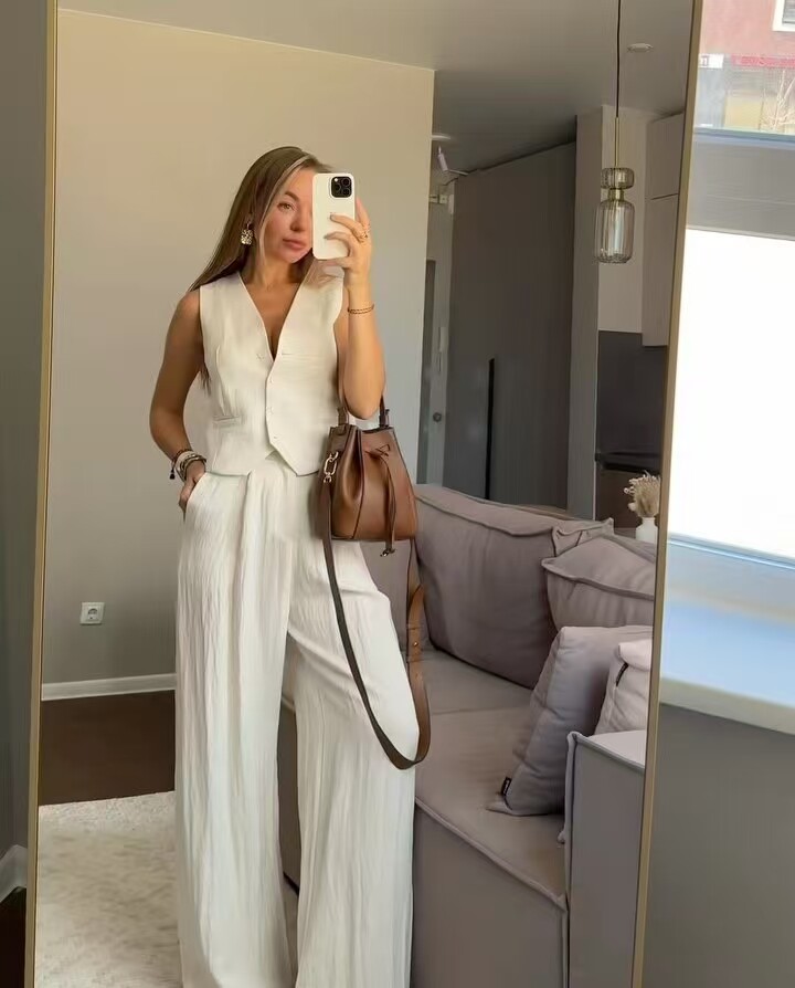 European and American Style Fashion V-Neck Cardigan Vest High-Waisted Wide-Leg Pants Suit V-Neck Top and Pants Suit