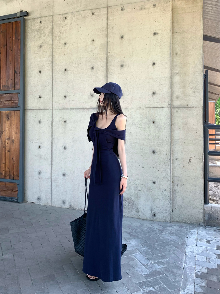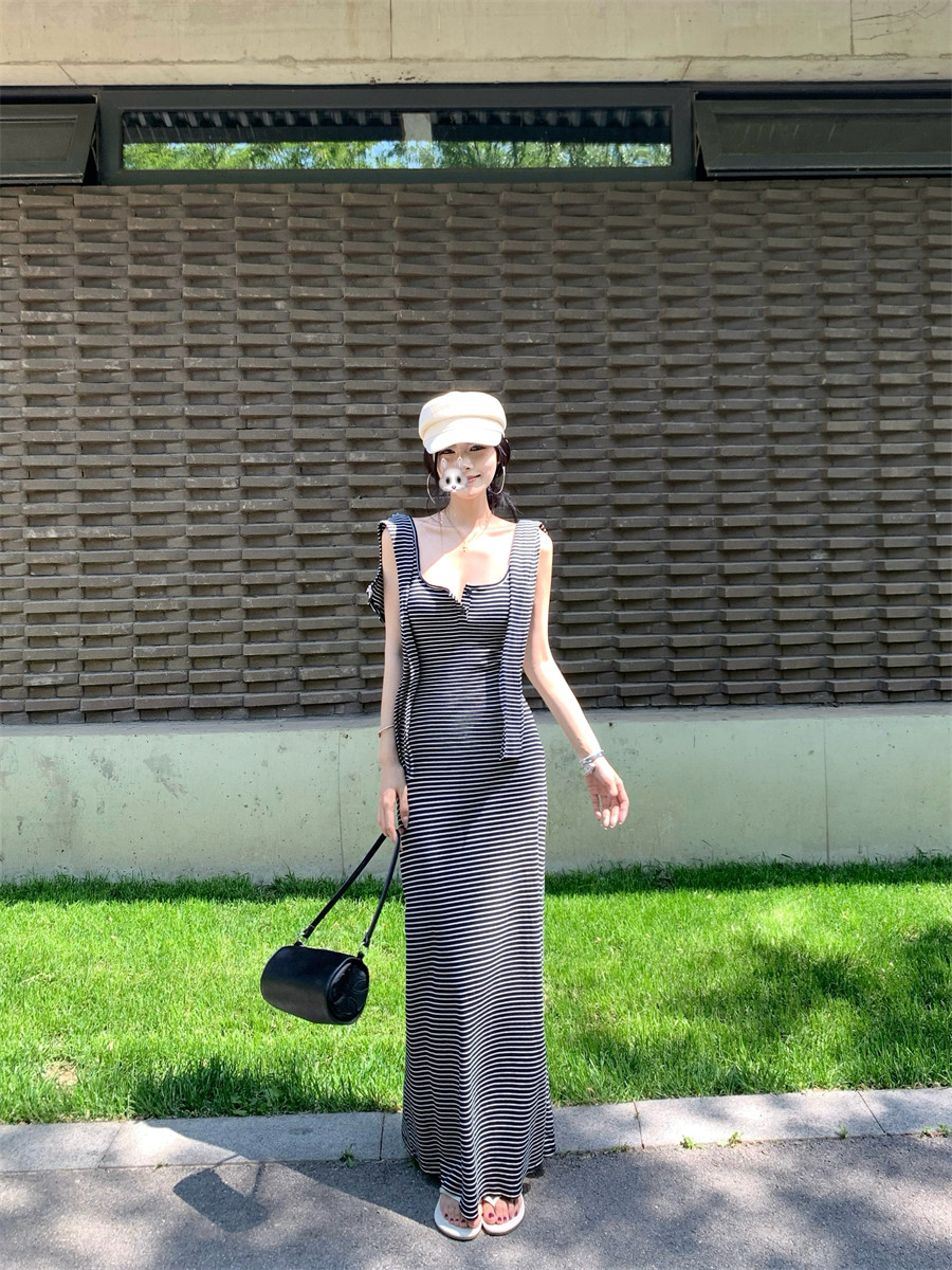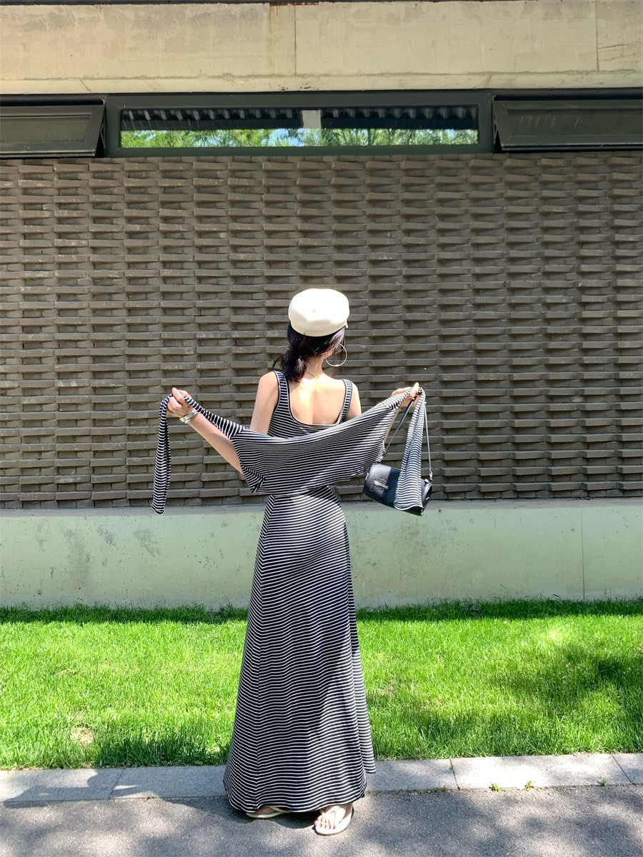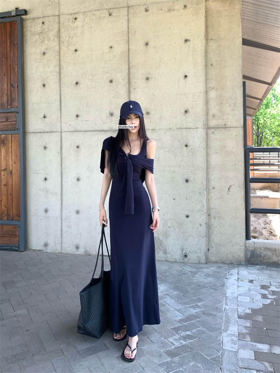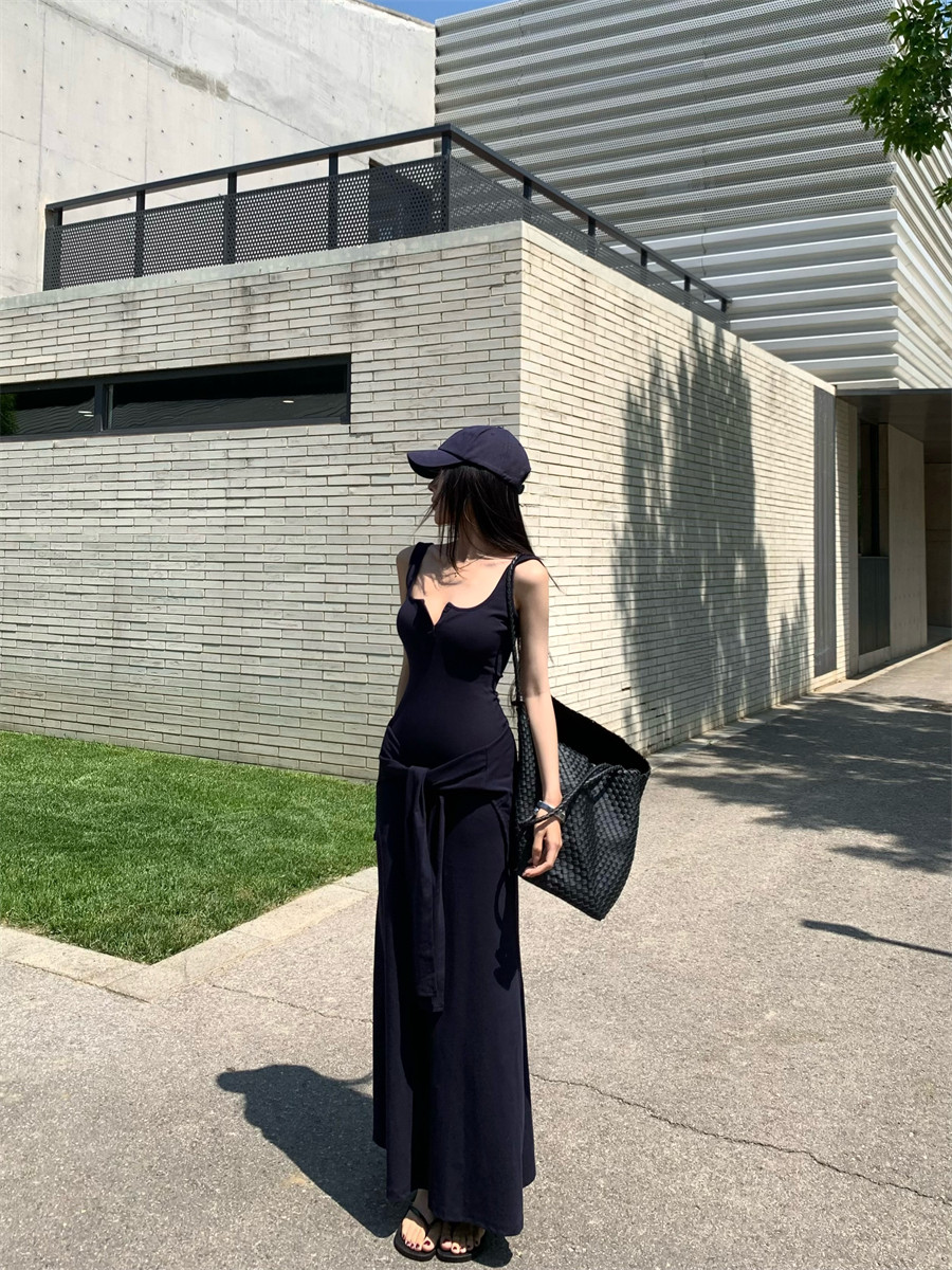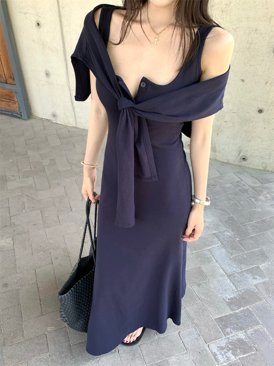 Light Mature Style, Intellectual Sister Vibe, Vest Dress, Two-Way Wear, Shawl, Casual Slim-Fit Dress with Chest Pads, Long Dress, Korean Style