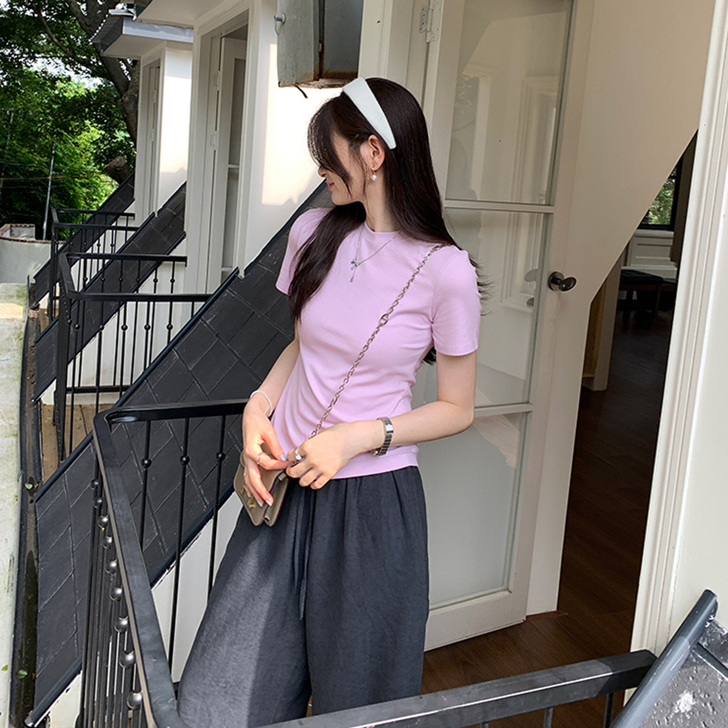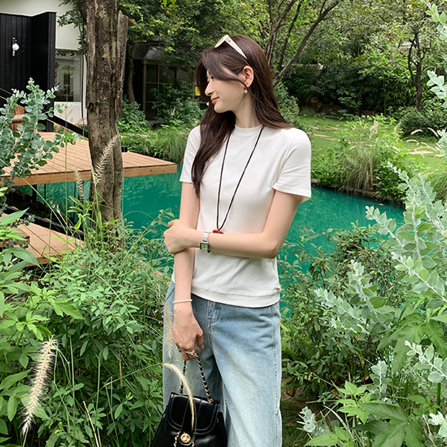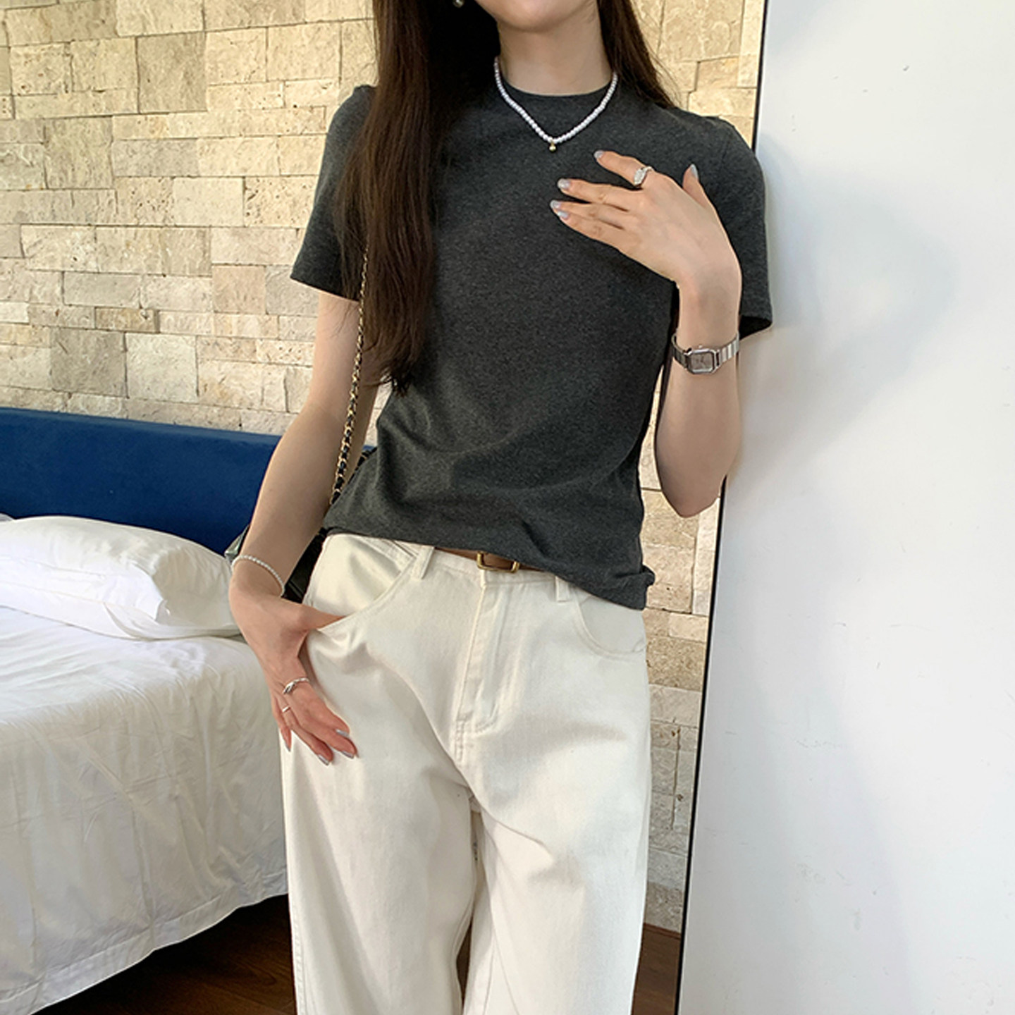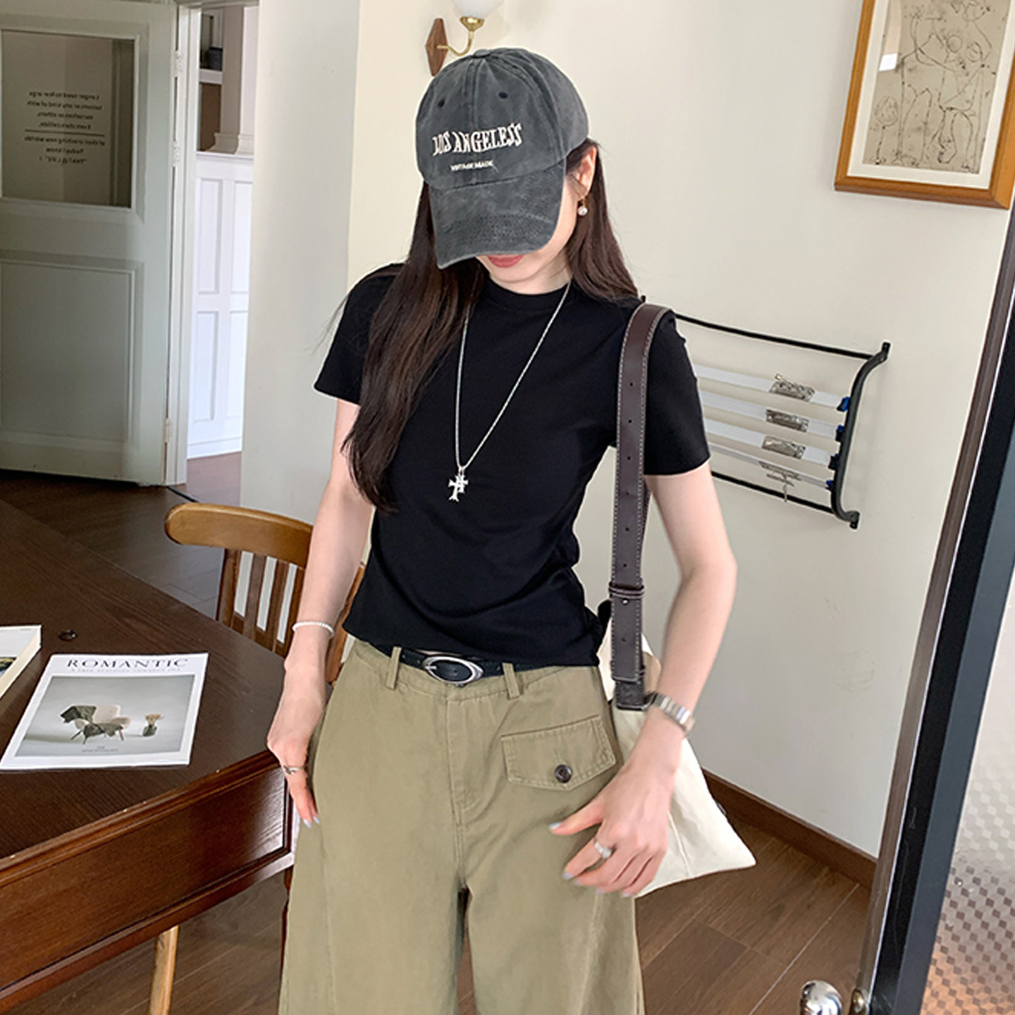 Korean Chic Unique Round Neck Short-Sleeved T-Shirt for Women, Summer 2025 New Style, Simple Regular Shoulder, Slimming and Stunning Top