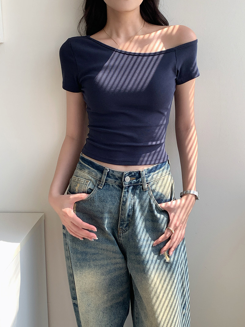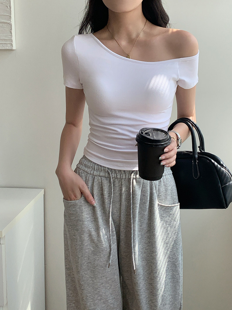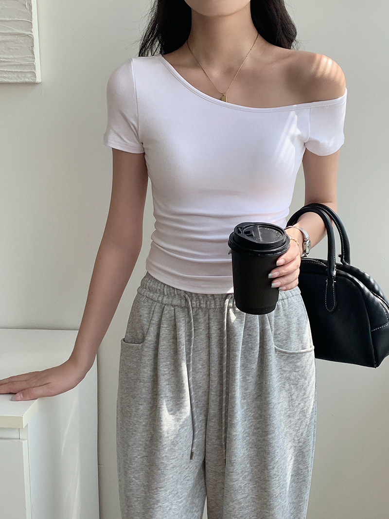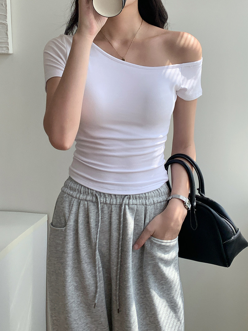 Off-Shoulder, One-Shoulder Neckline, Sexy, Off-The-Shoulder, Short-Sleeved T-Shirt for Women, Summer, Unique, with Chest Pads, Pure Lust Style, Hot Girl Short Top
