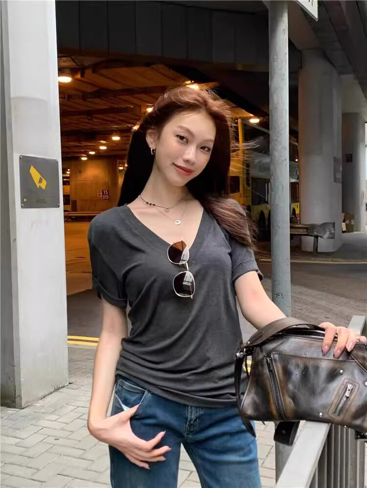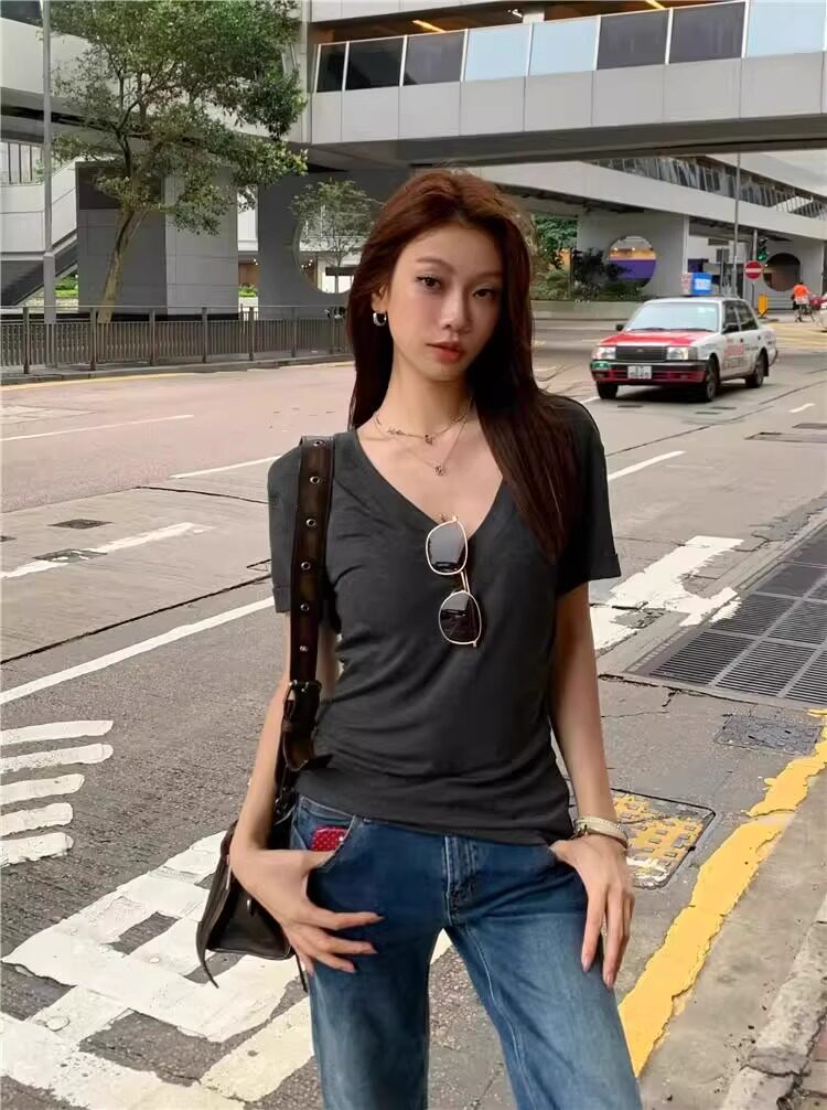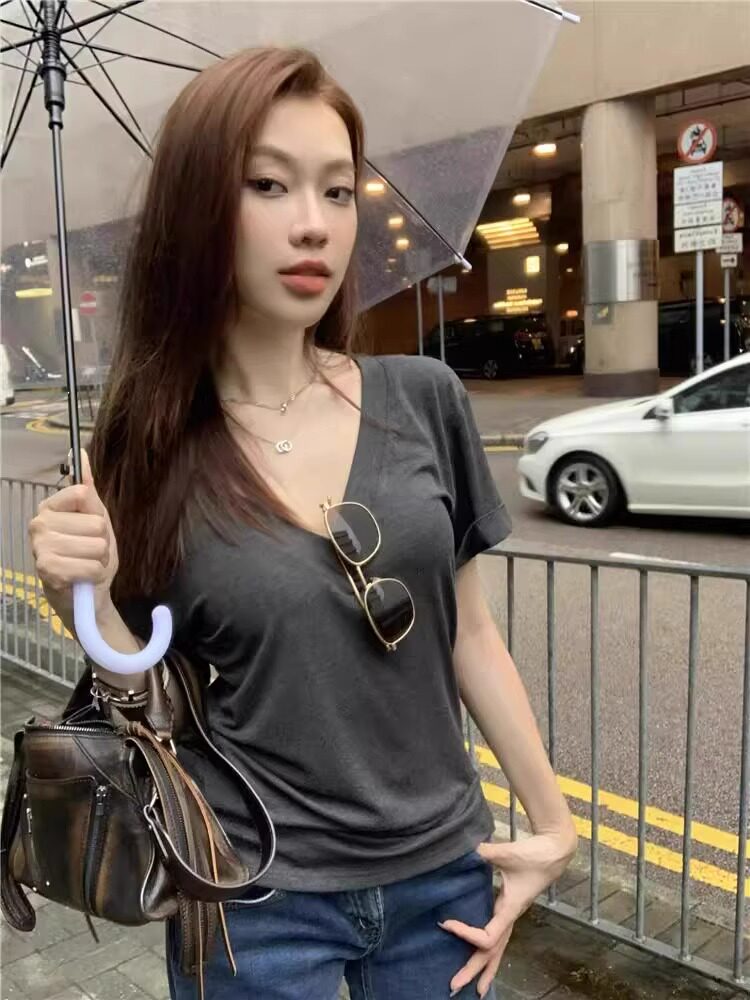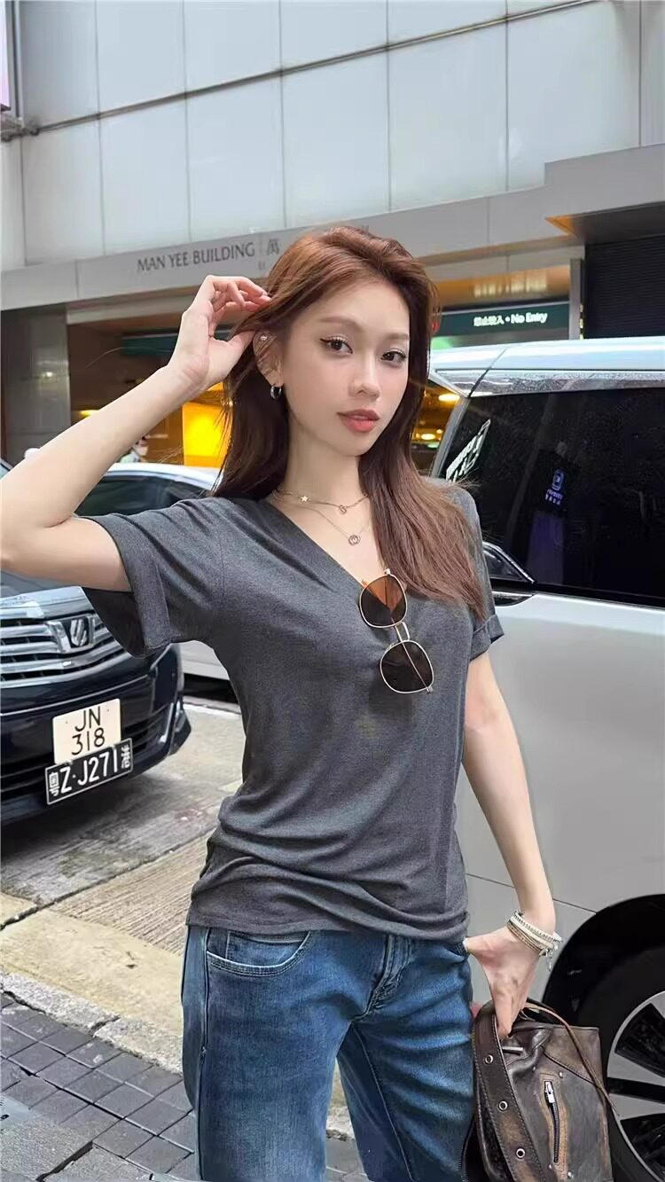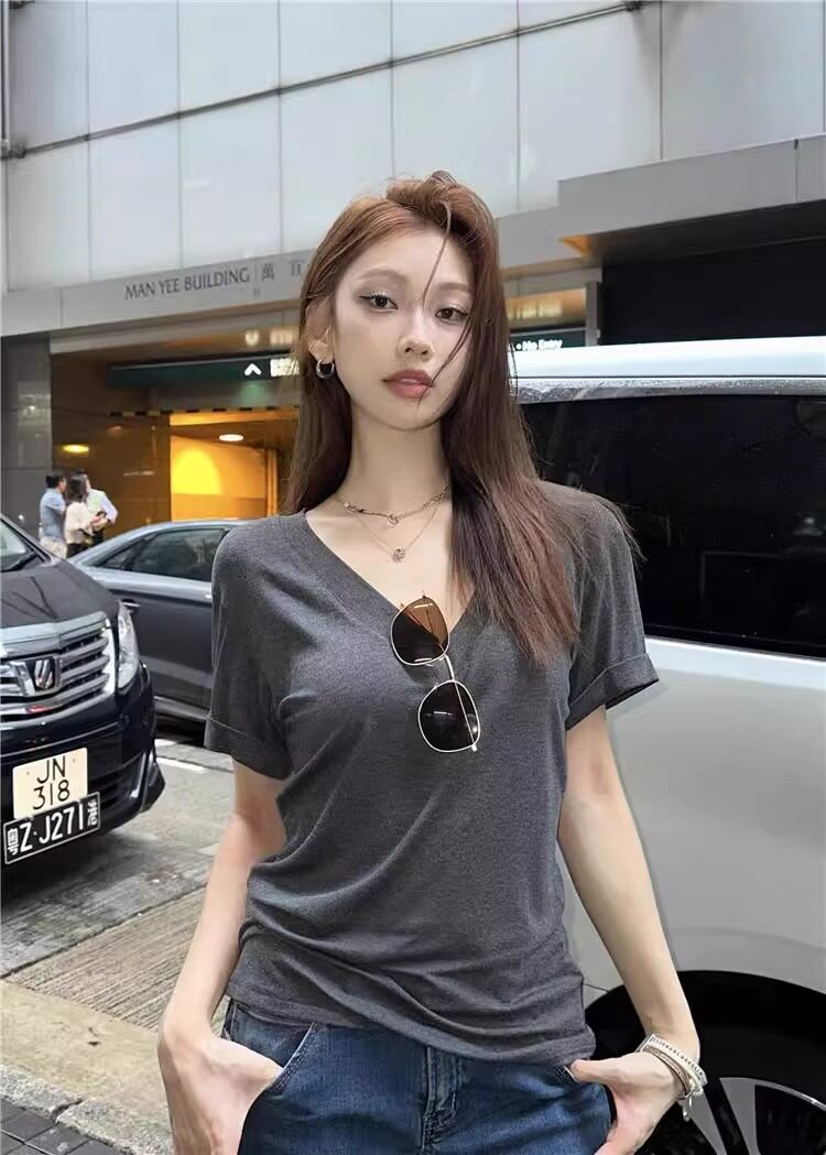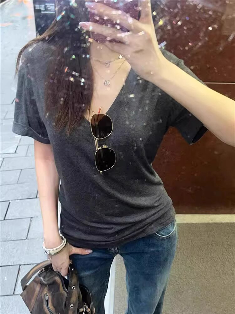 Lazy and Relaxed Gray V-Neck Short-Sleeved T-Shirt for Women Summer 2025 New Normcore Style Casual Simple Slimming Look Top