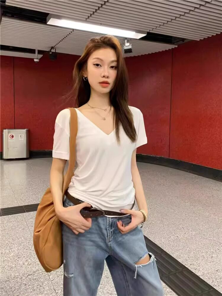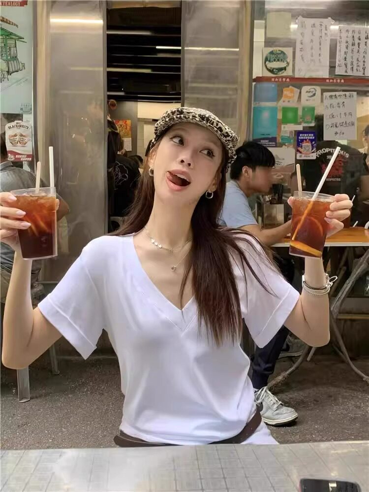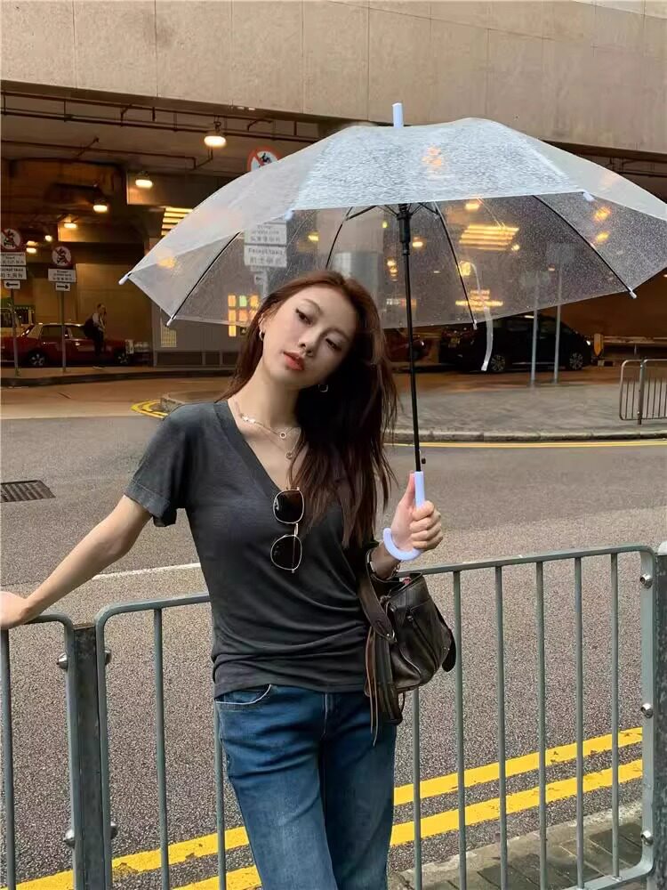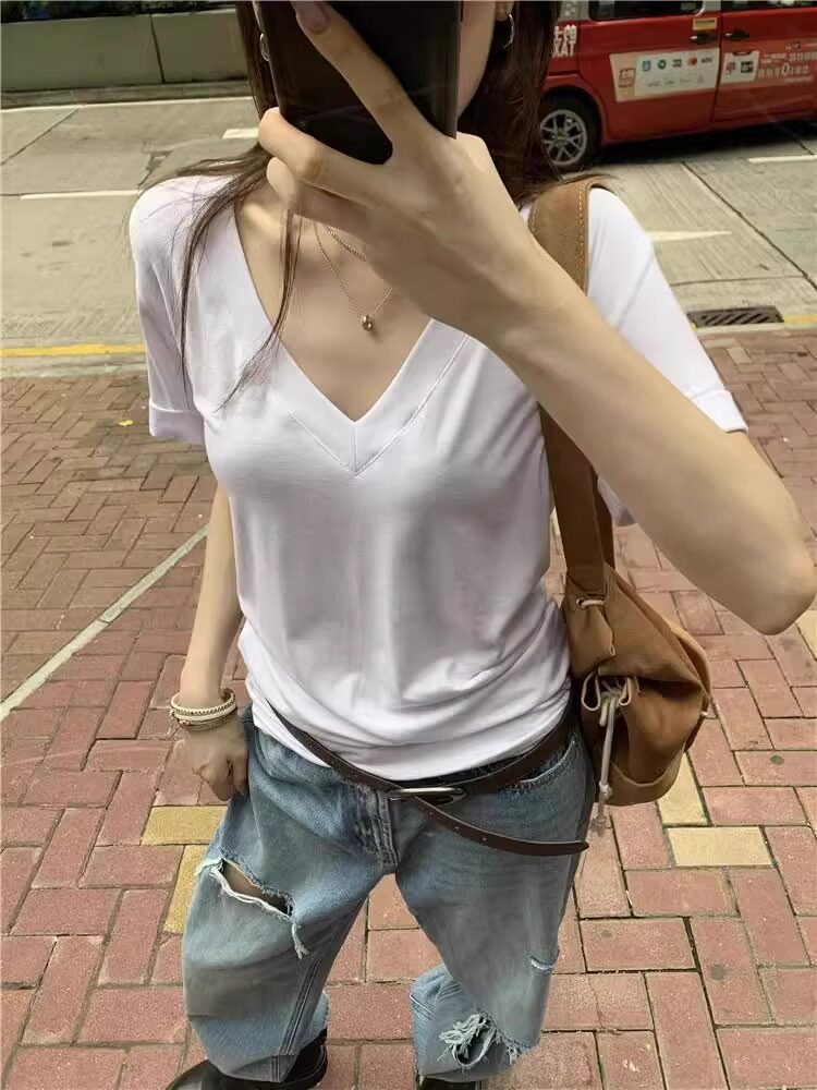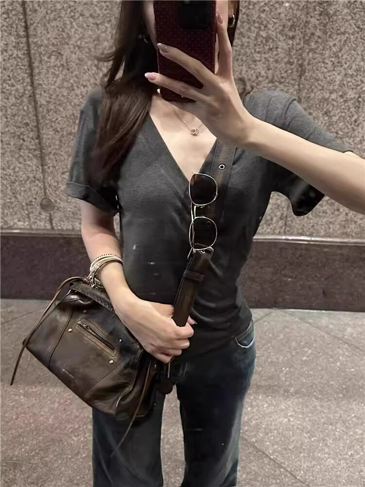 Lazy and Relaxed Gray V-Neck Short-Sleeved T-Shirt for Women Summer 2025 New Normcore Style Casual Simple Slimming Look Top