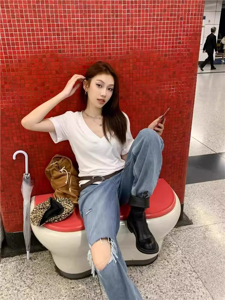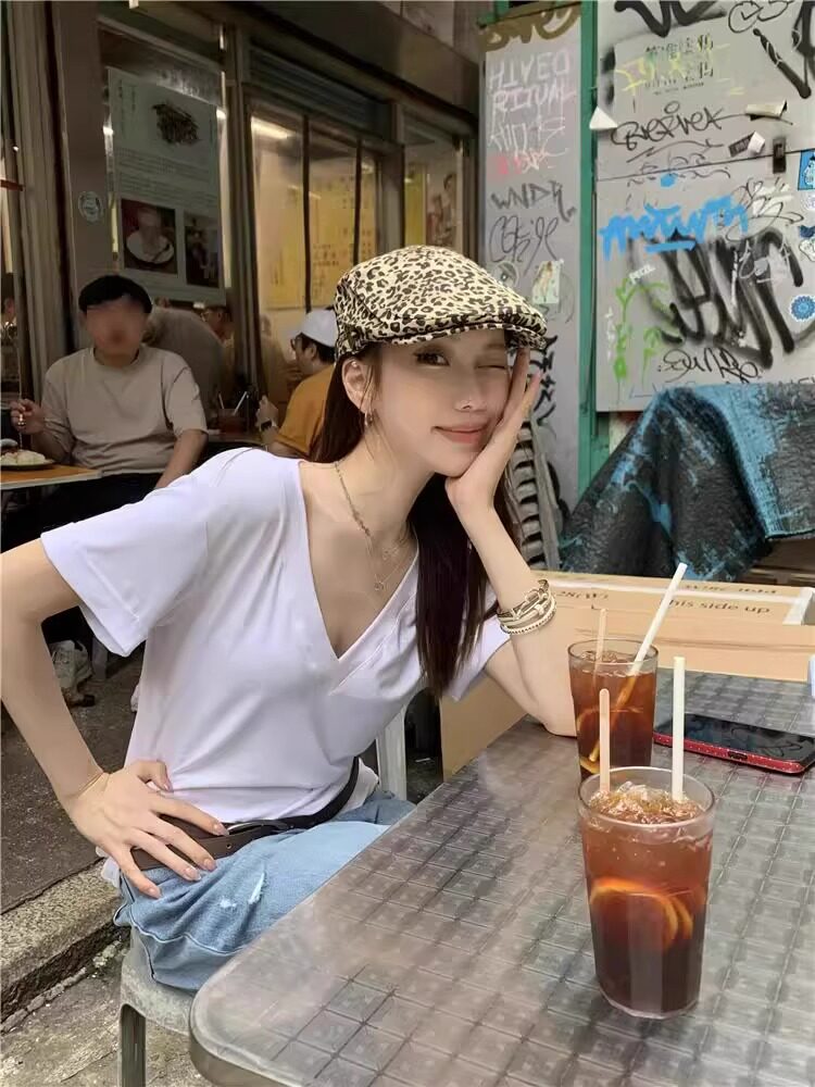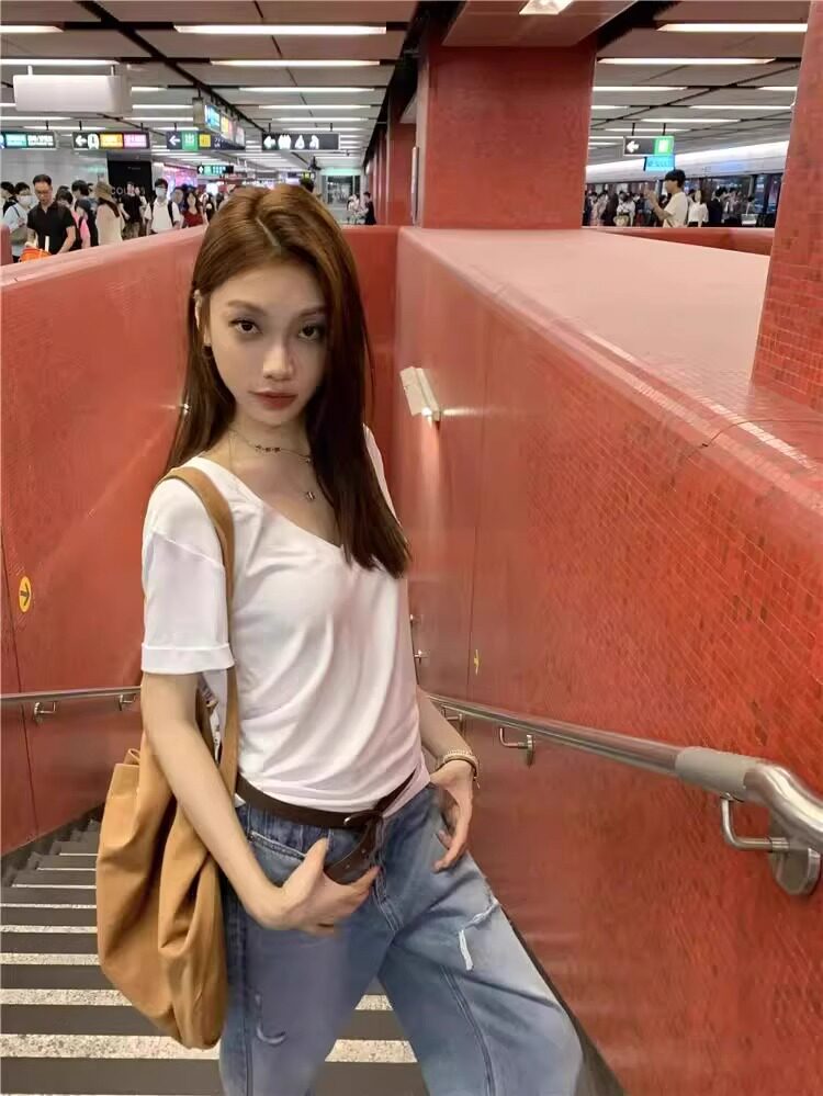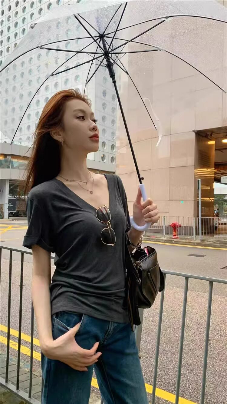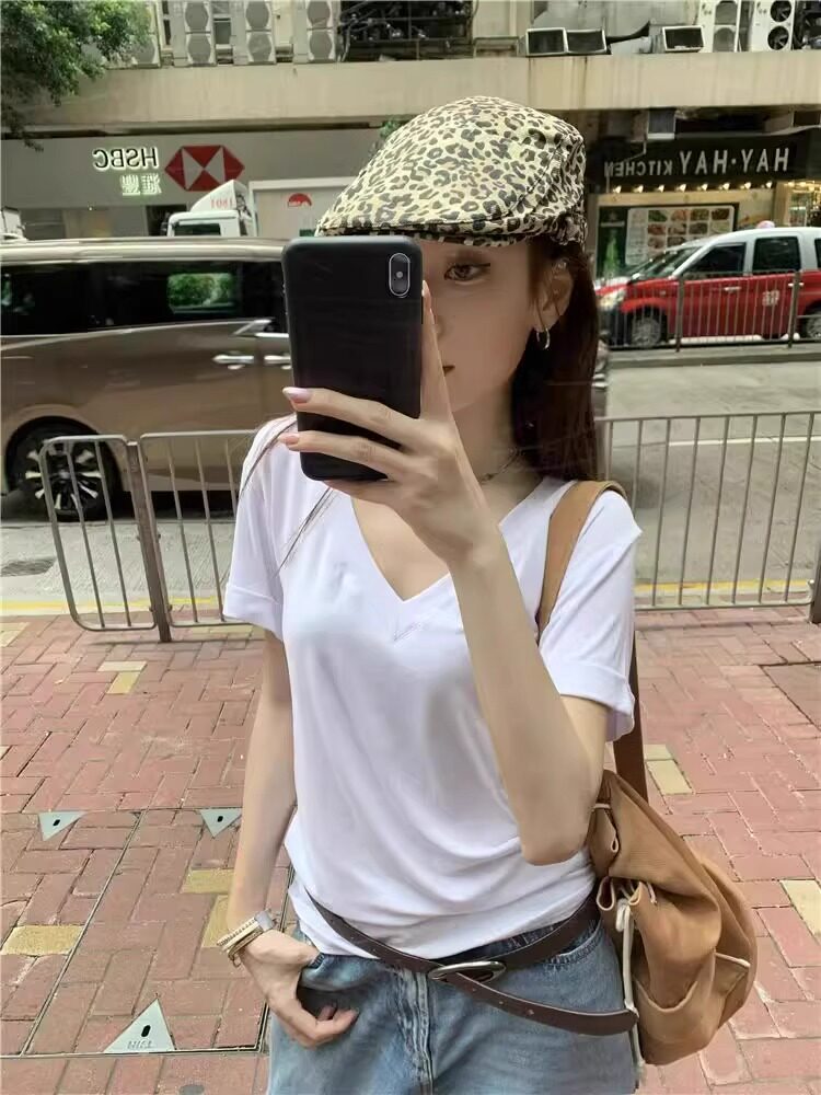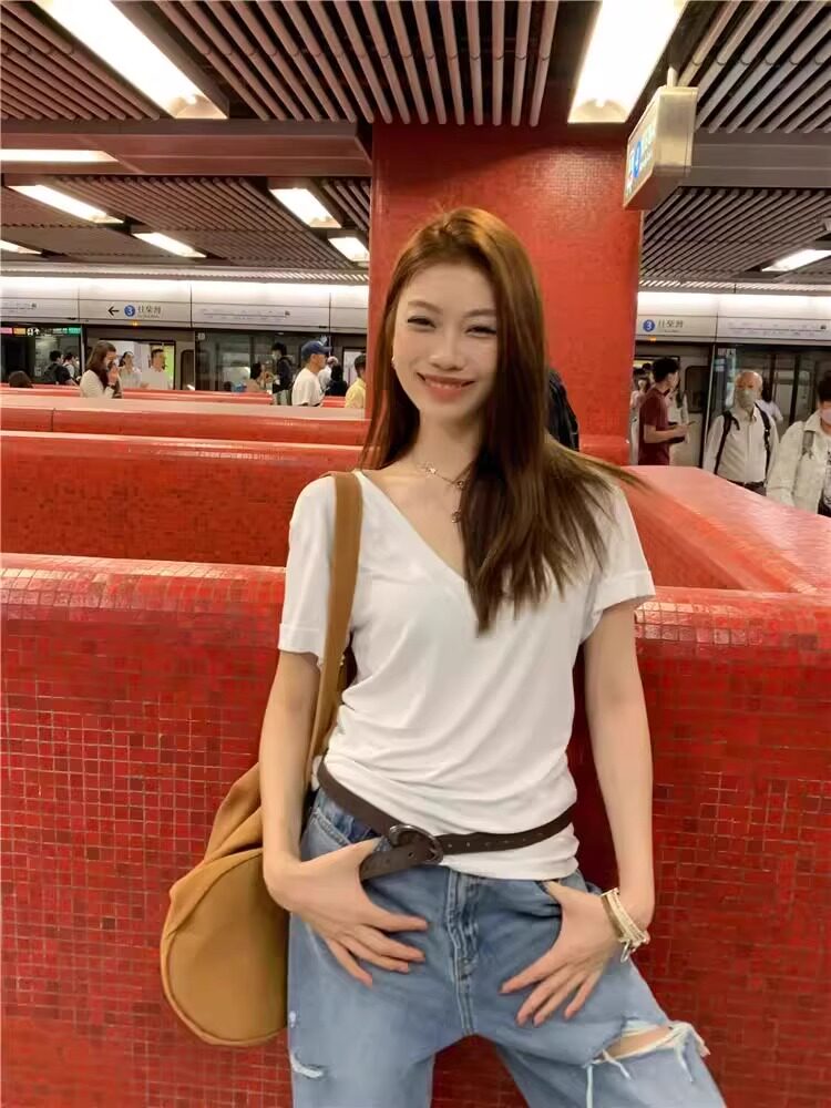 Lazy and Relaxed Gray V-Neck Short-Sleeved T-Shirt for Women Summer 2025 New Normcore Style Casual Simple Slimming Look Top