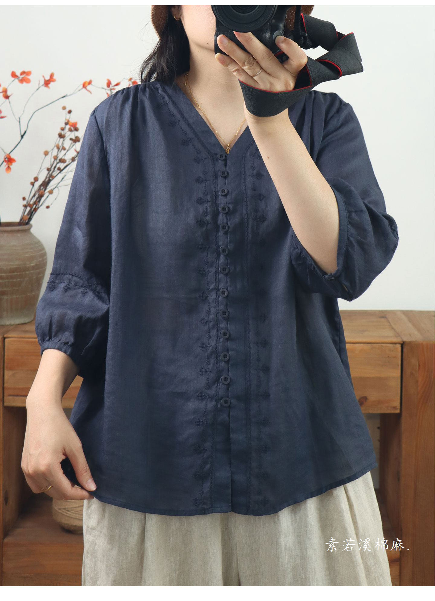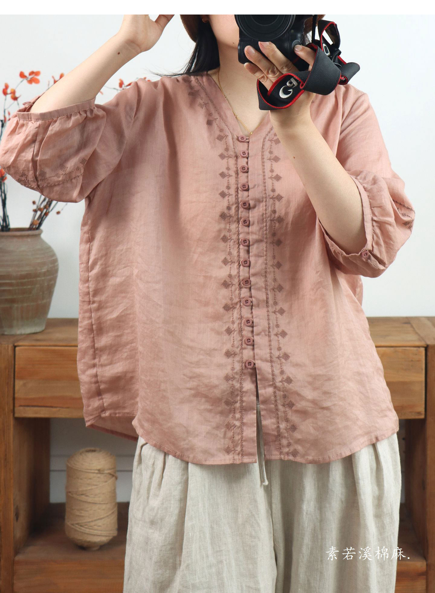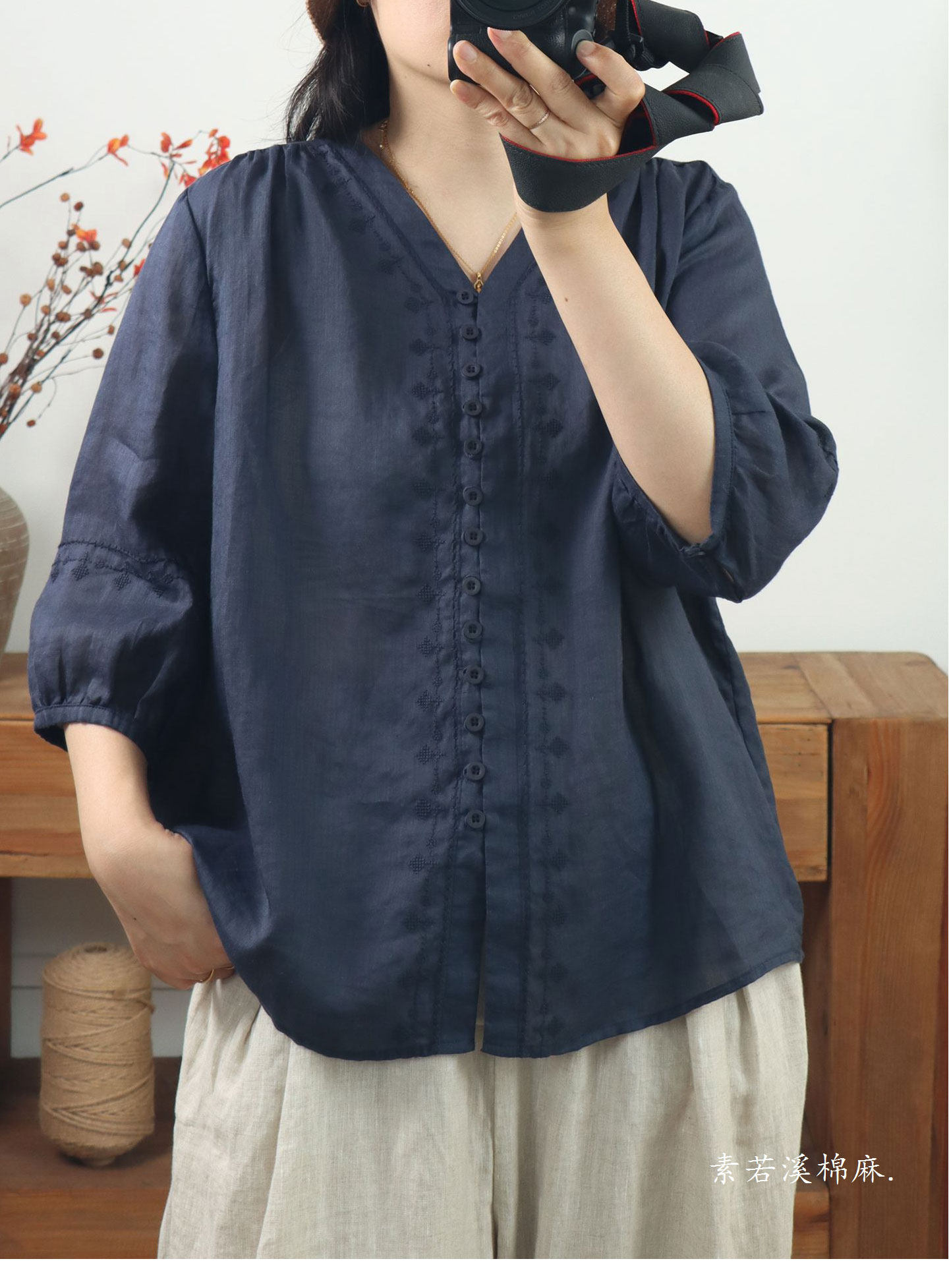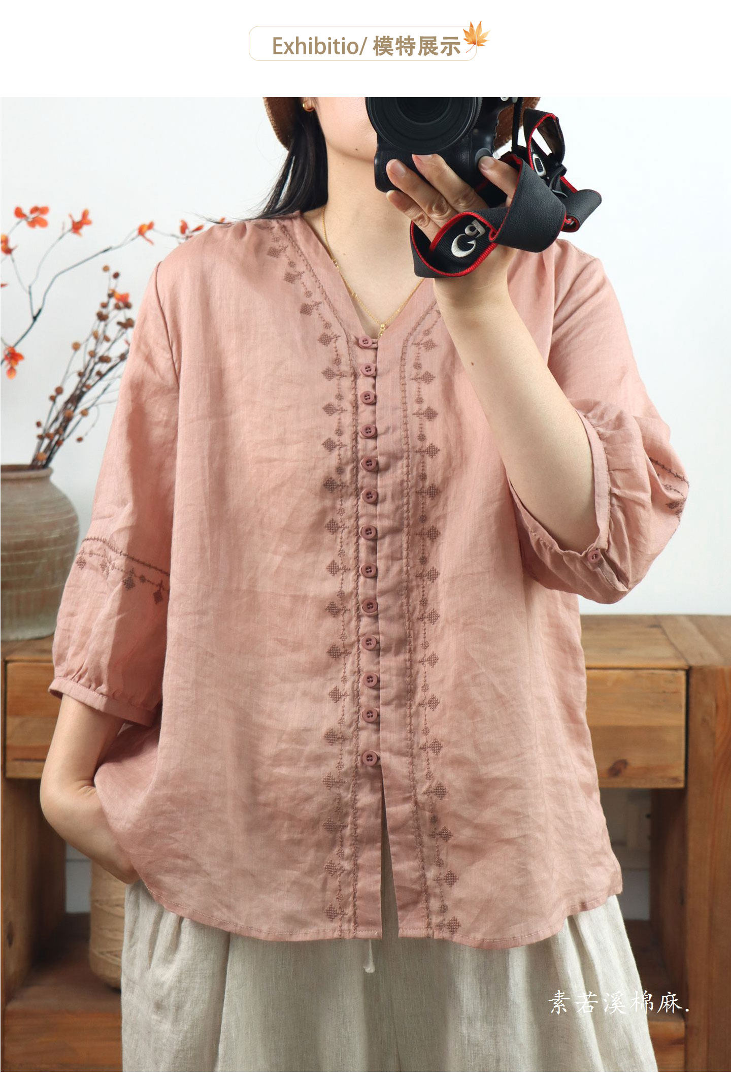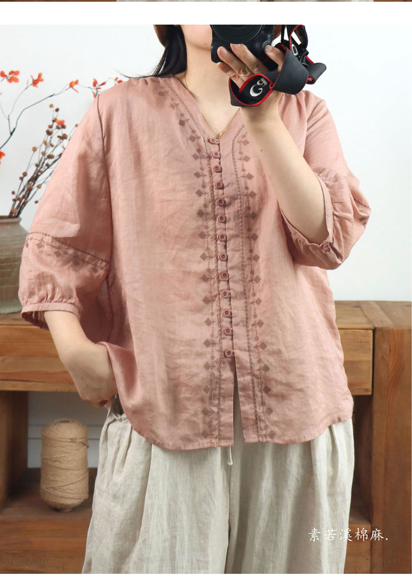 Elegant Ramie Embroidered Three-Quarter Sleeve V-Neck Shirt for Women, Summer Loose Large Size Vintage Artistic Button-Up Top 2552