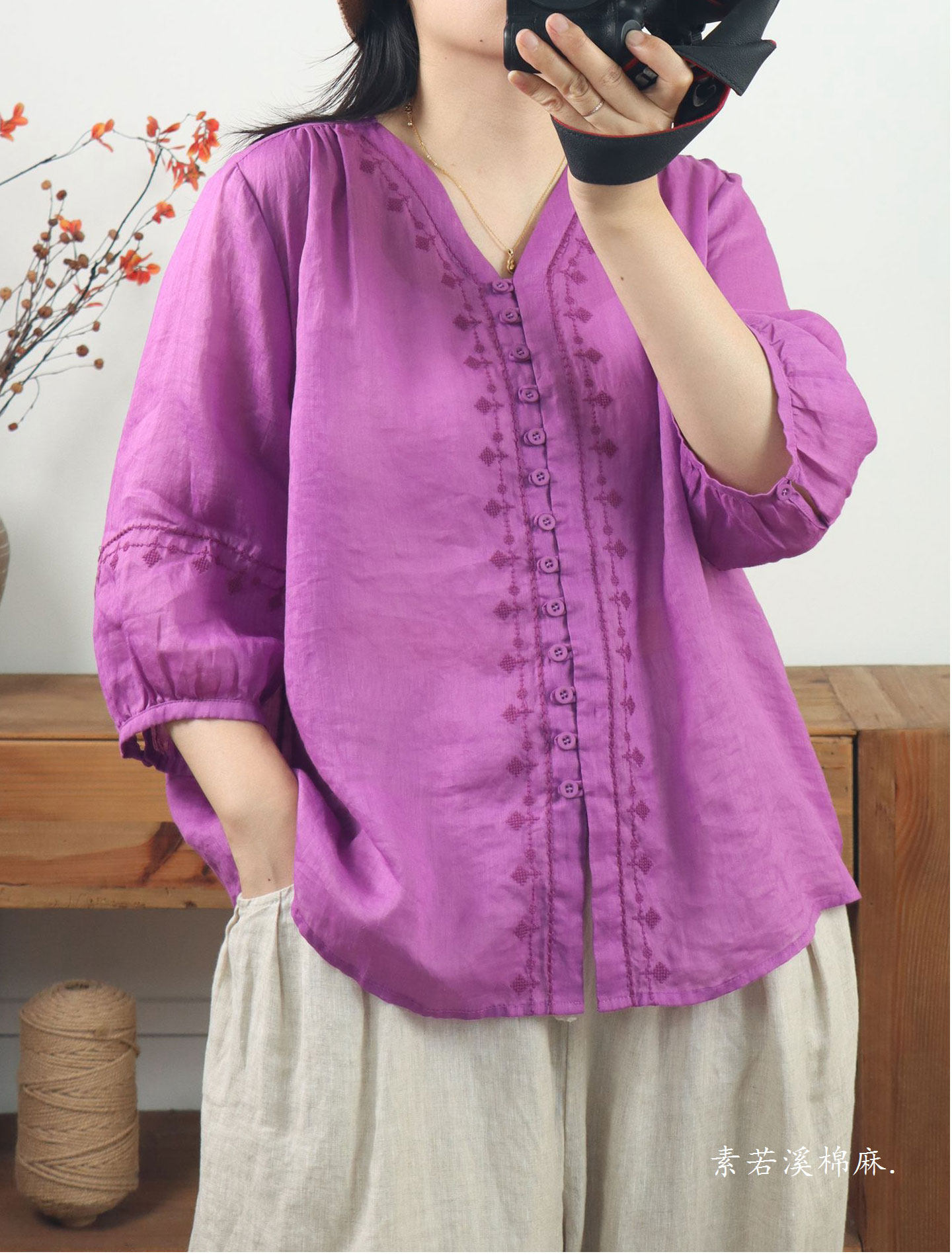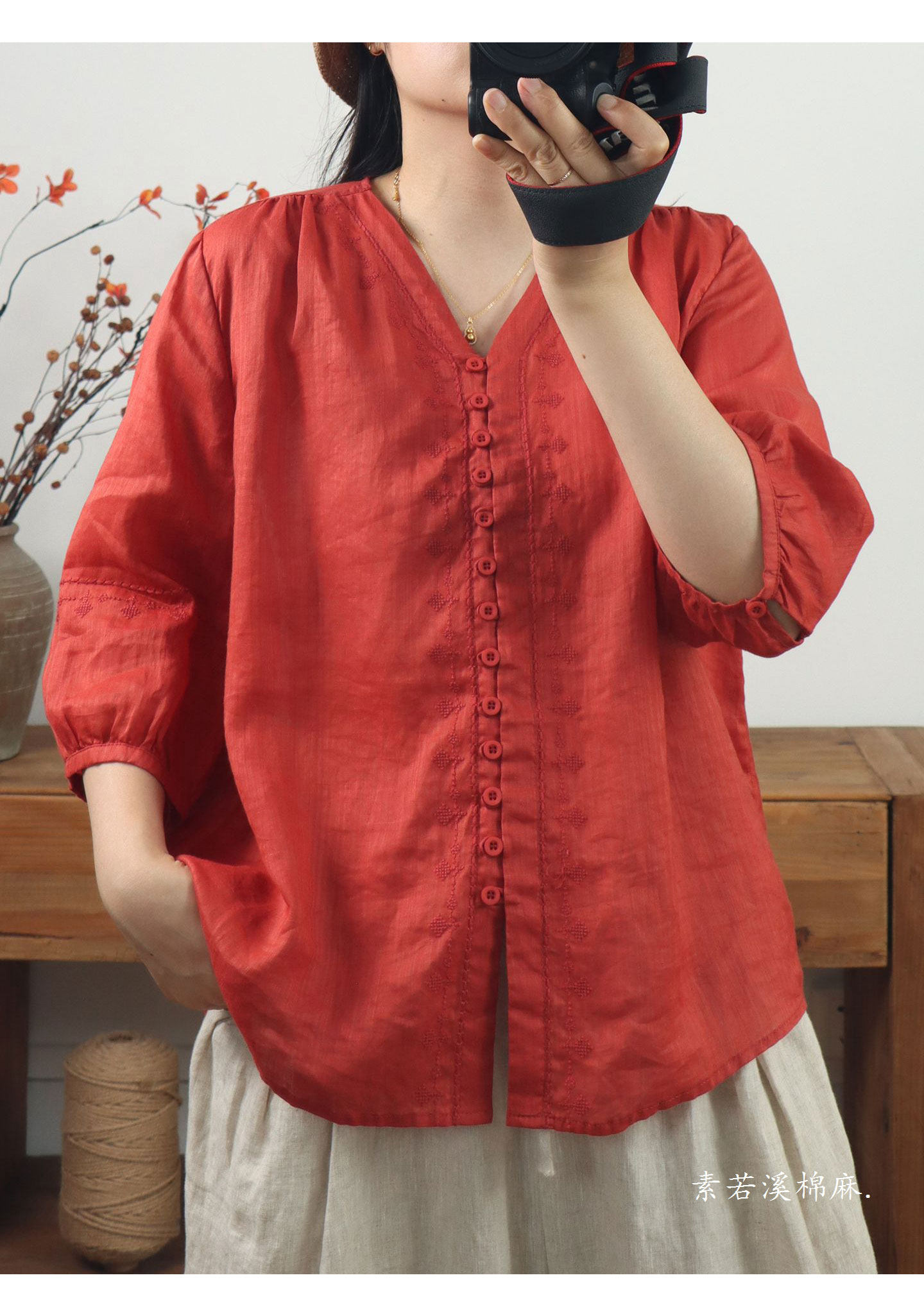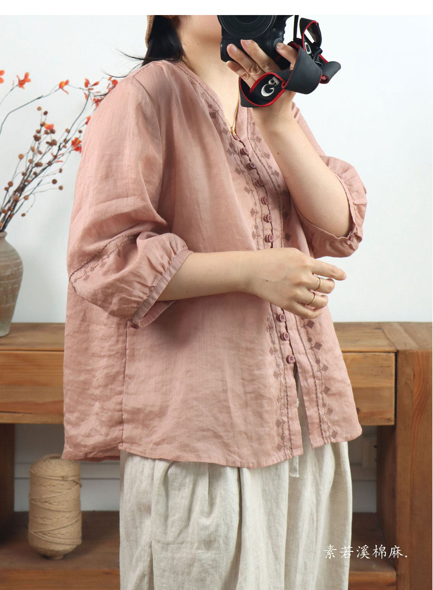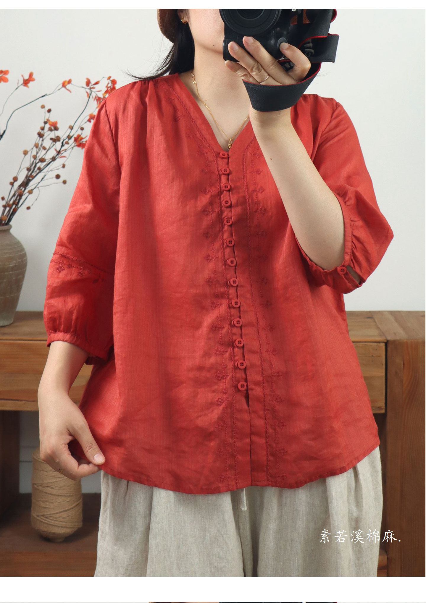 Elegant Ramie Embroidered Three-Quarter Sleeve V-Neck Shirt for Women, Summer Loose Large Size Vintage Artistic Button-Up Top 2552