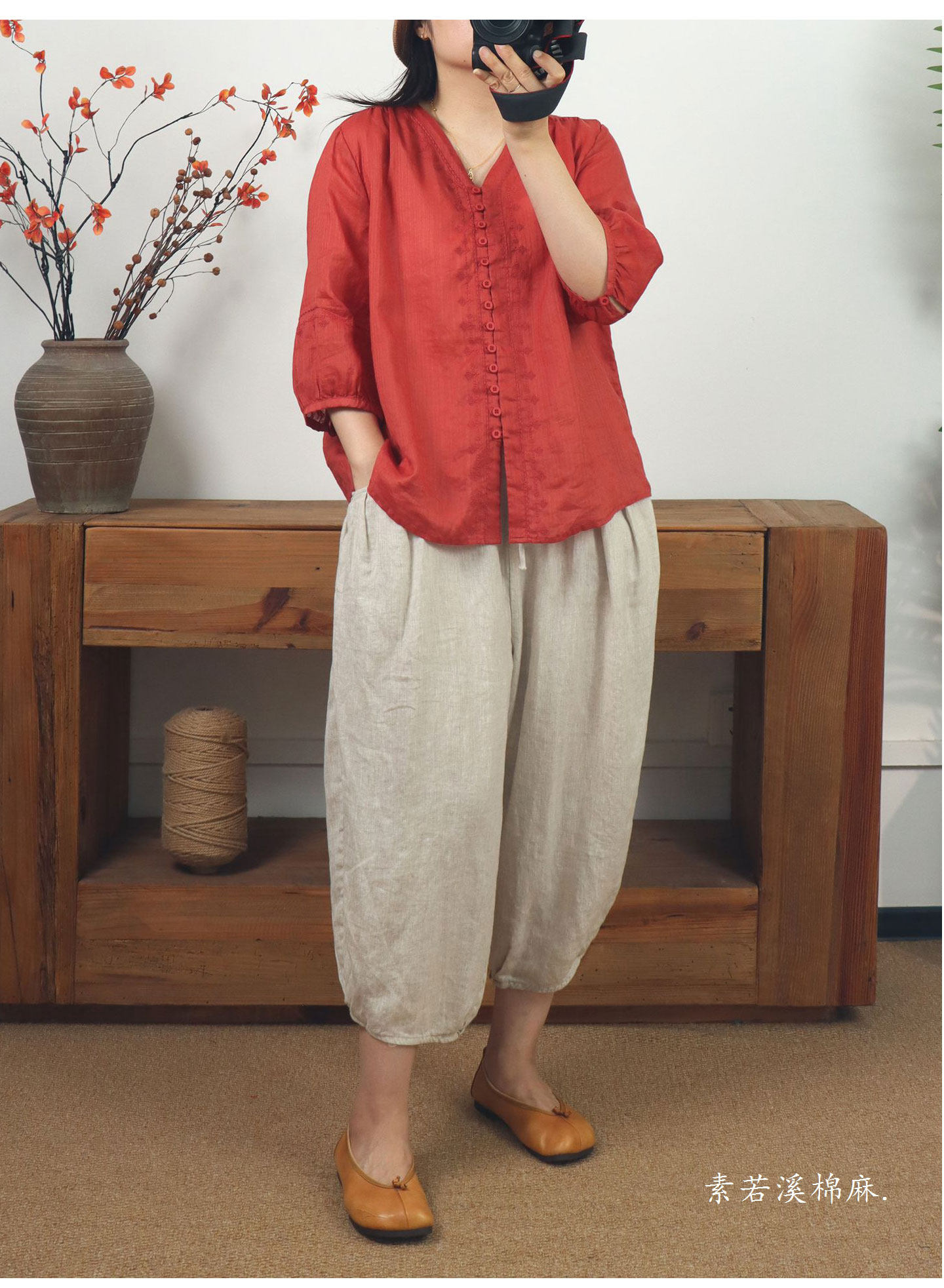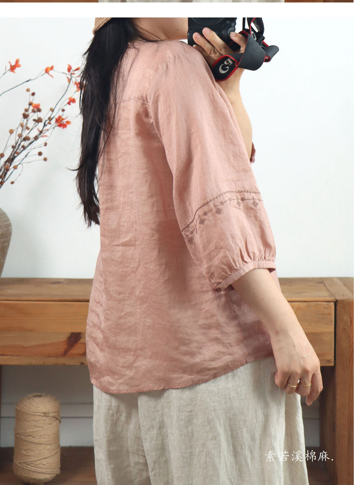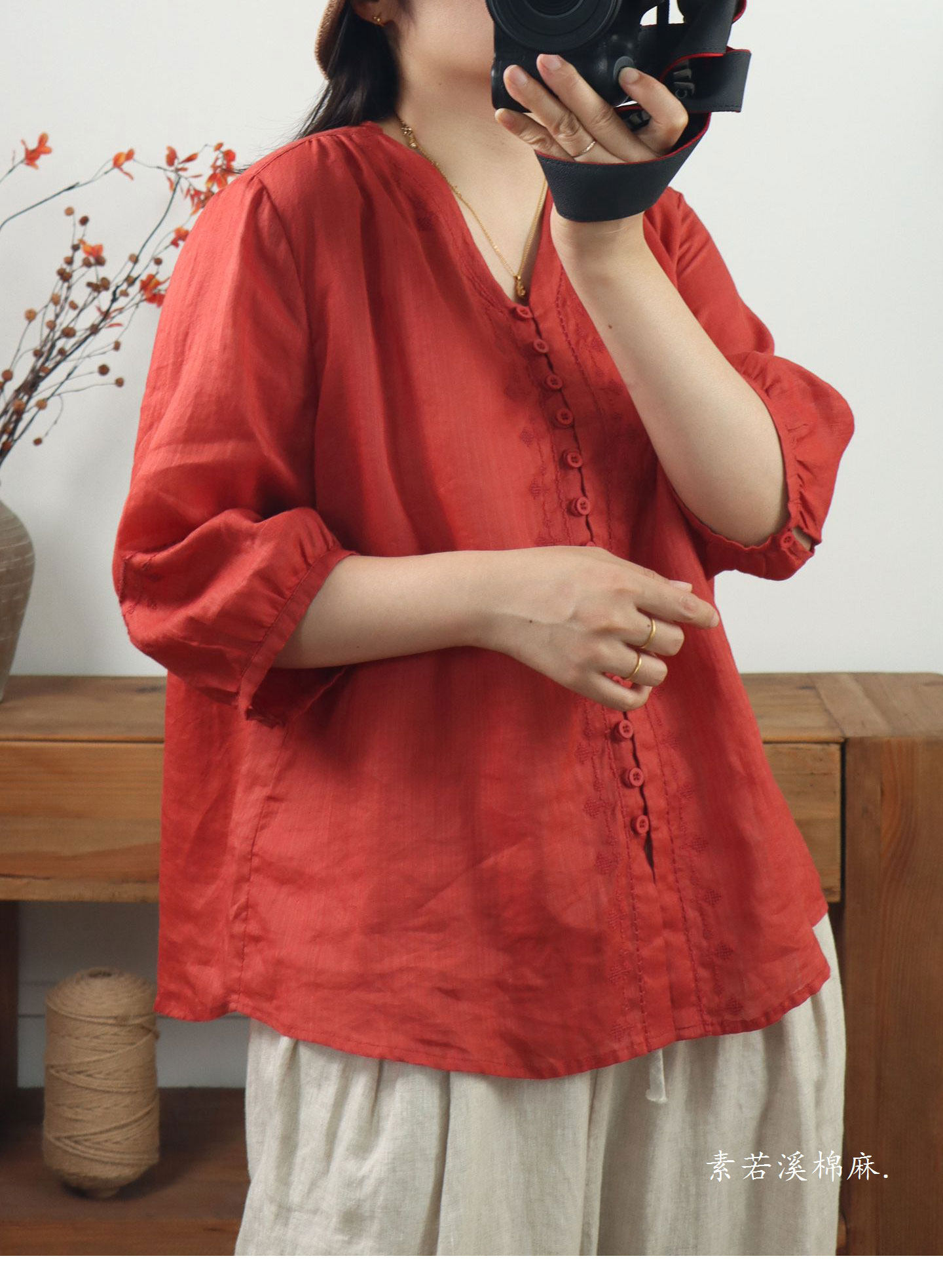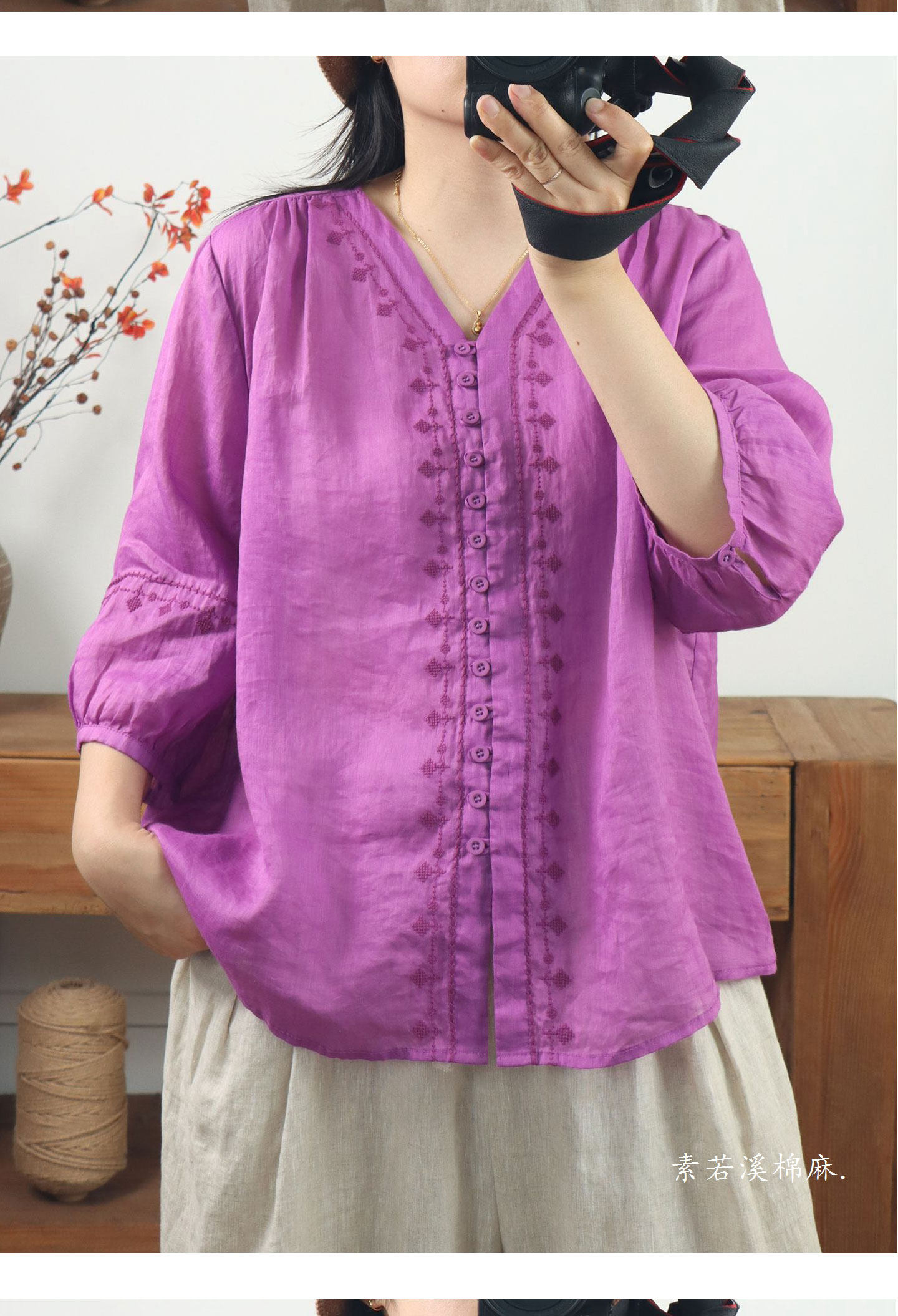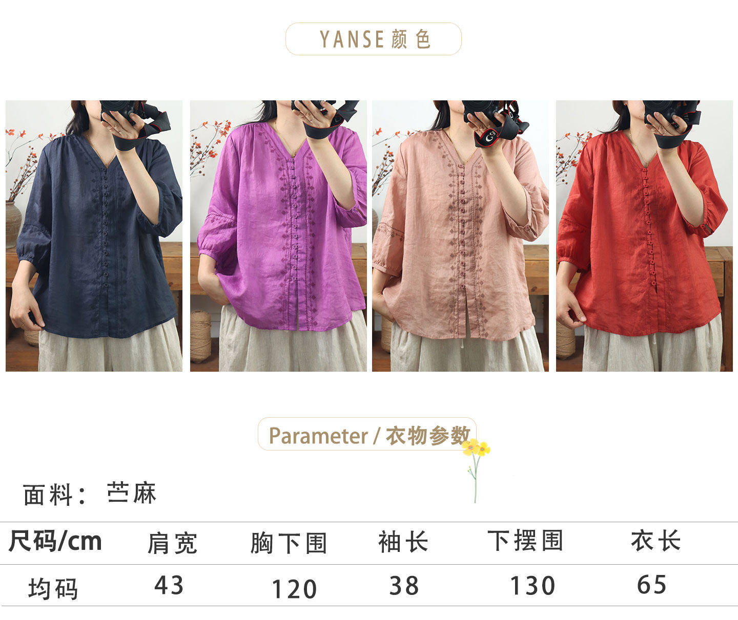 Elegant Ramie Embroidered Three-Quarter Sleeve V-Neck Shirt for Women, Summer Loose Large Size Vintage Artistic Button-Up Top 2552