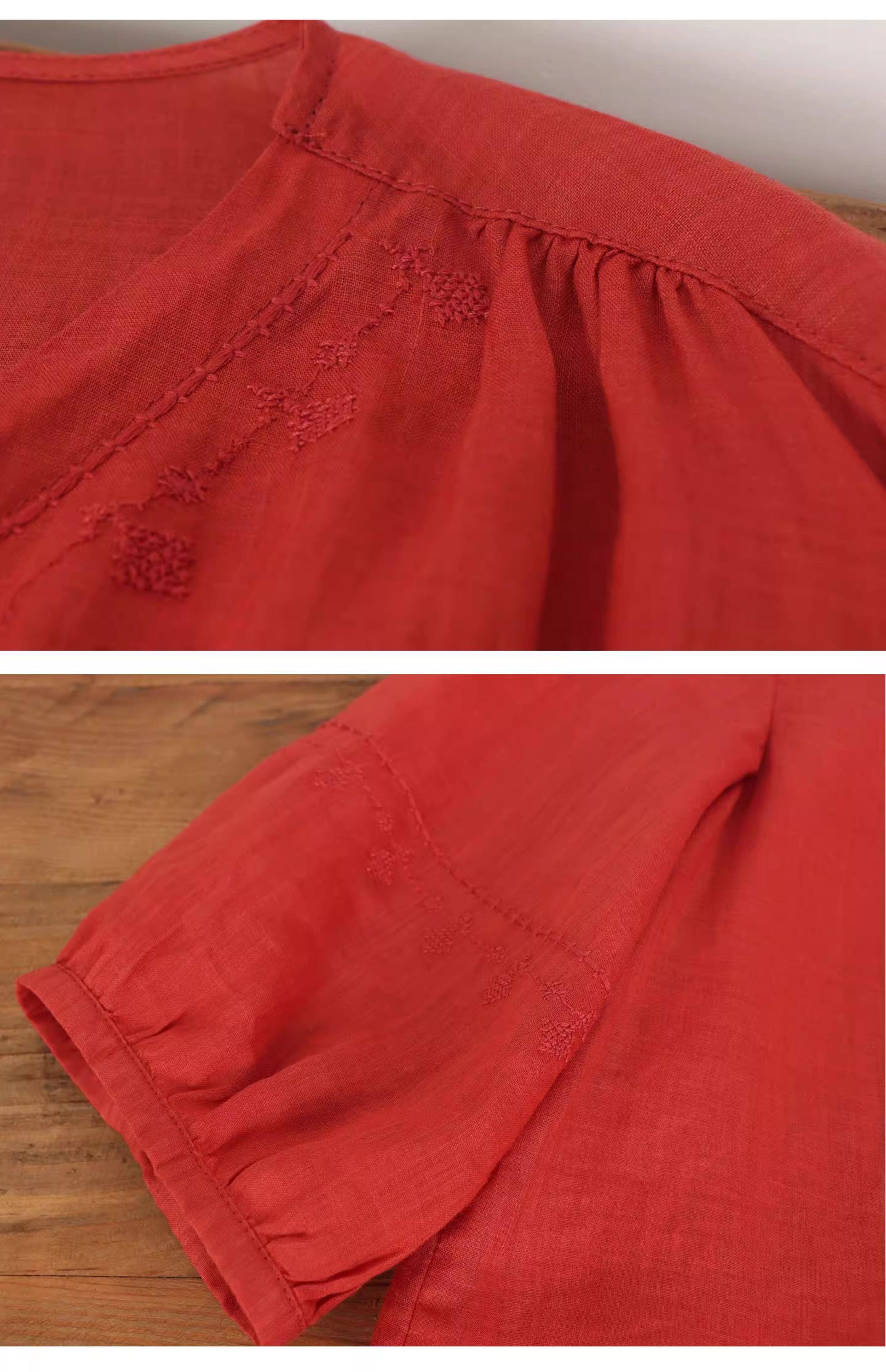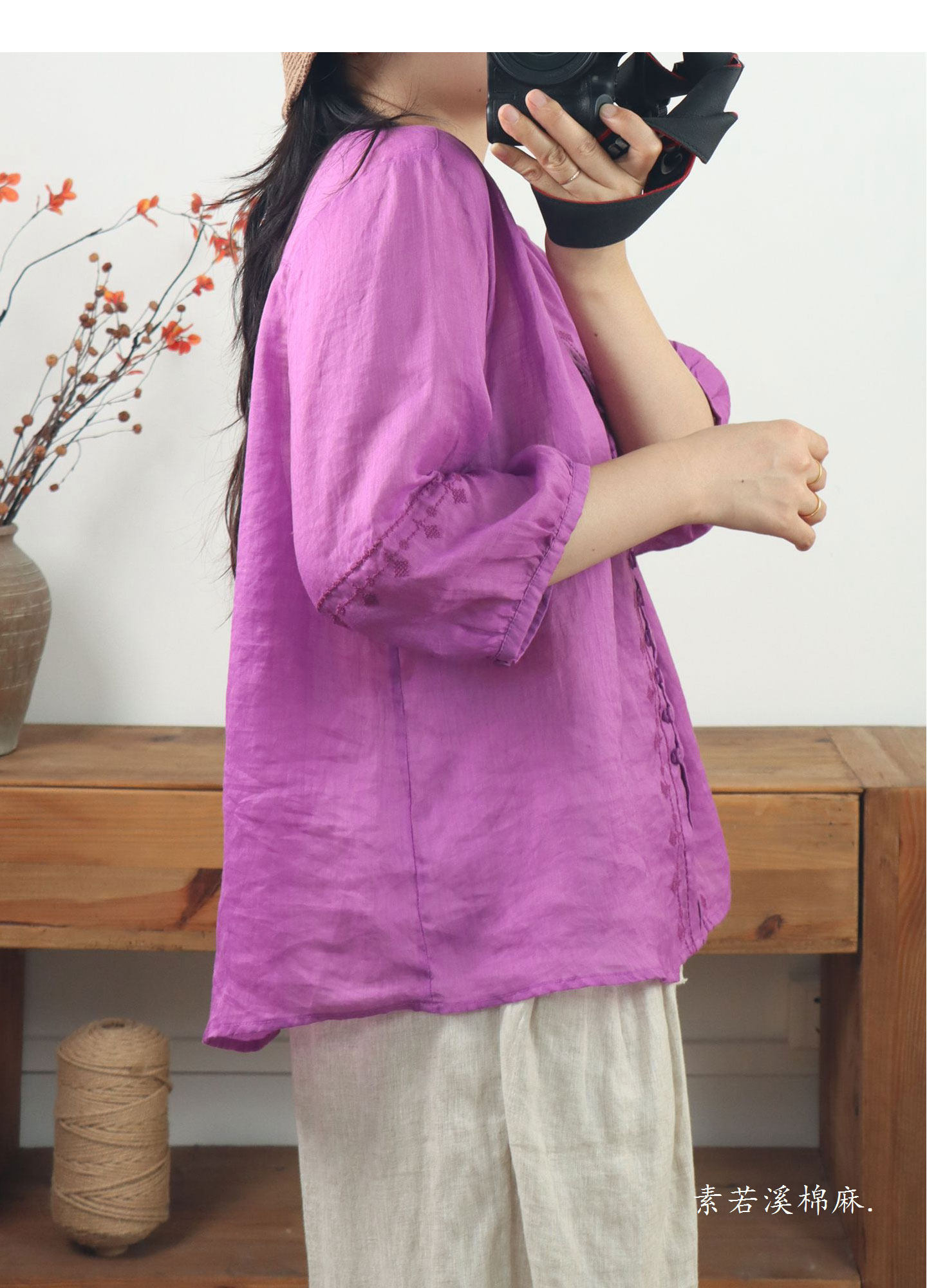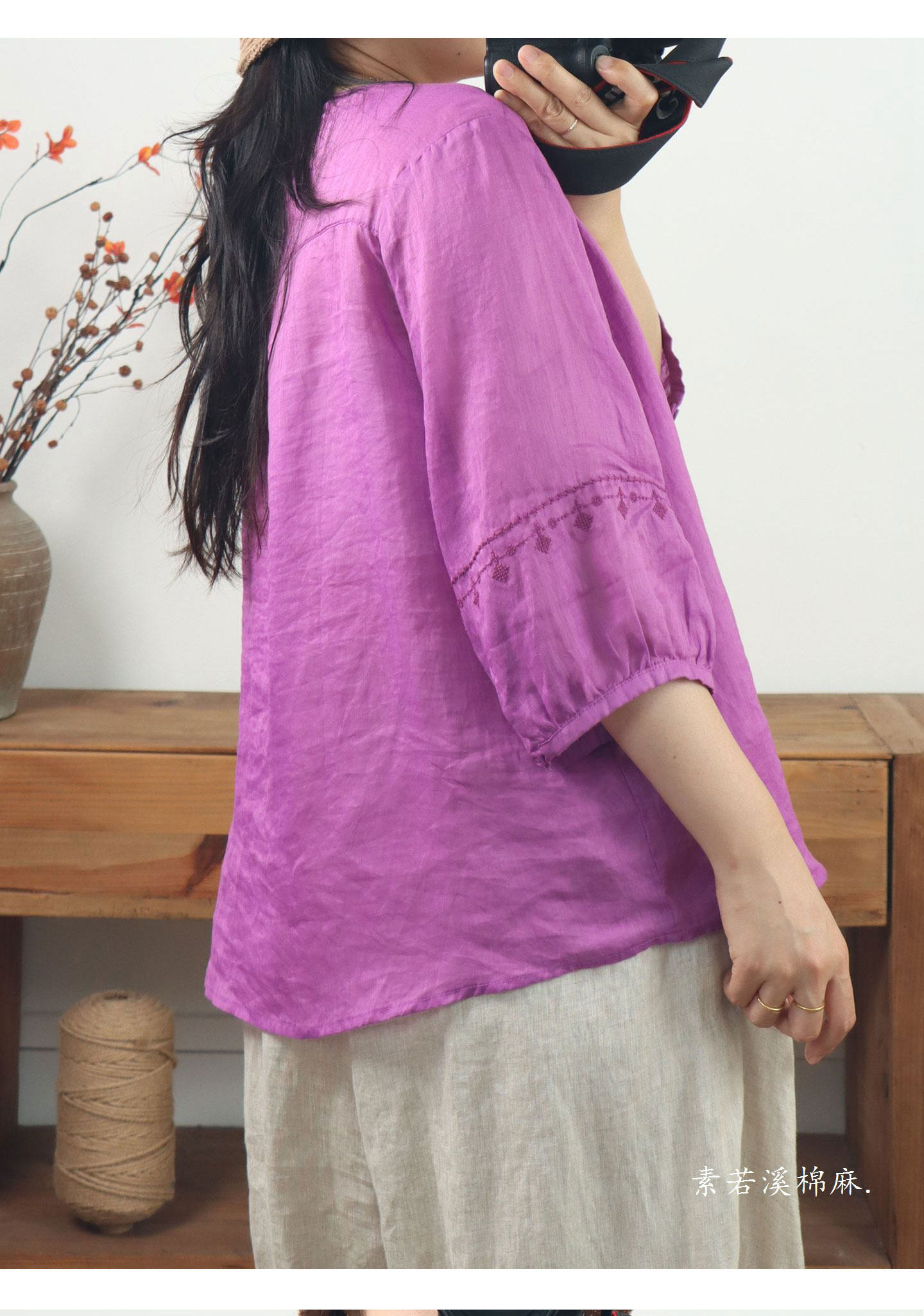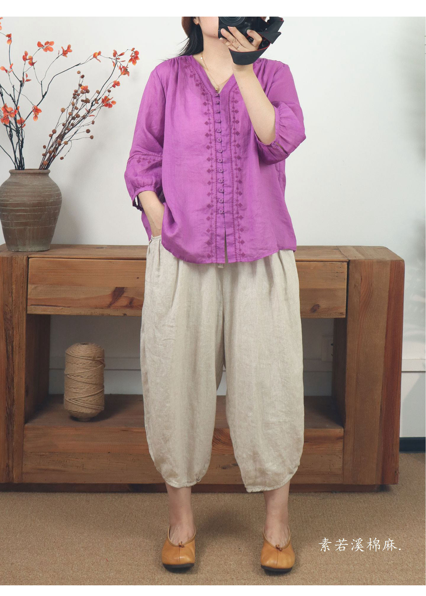 Elegant Ramie Embroidered Three-Quarter Sleeve V-Neck Shirt for Women, Summer Loose Large Size Vintage Artistic Button-Up Top 2552