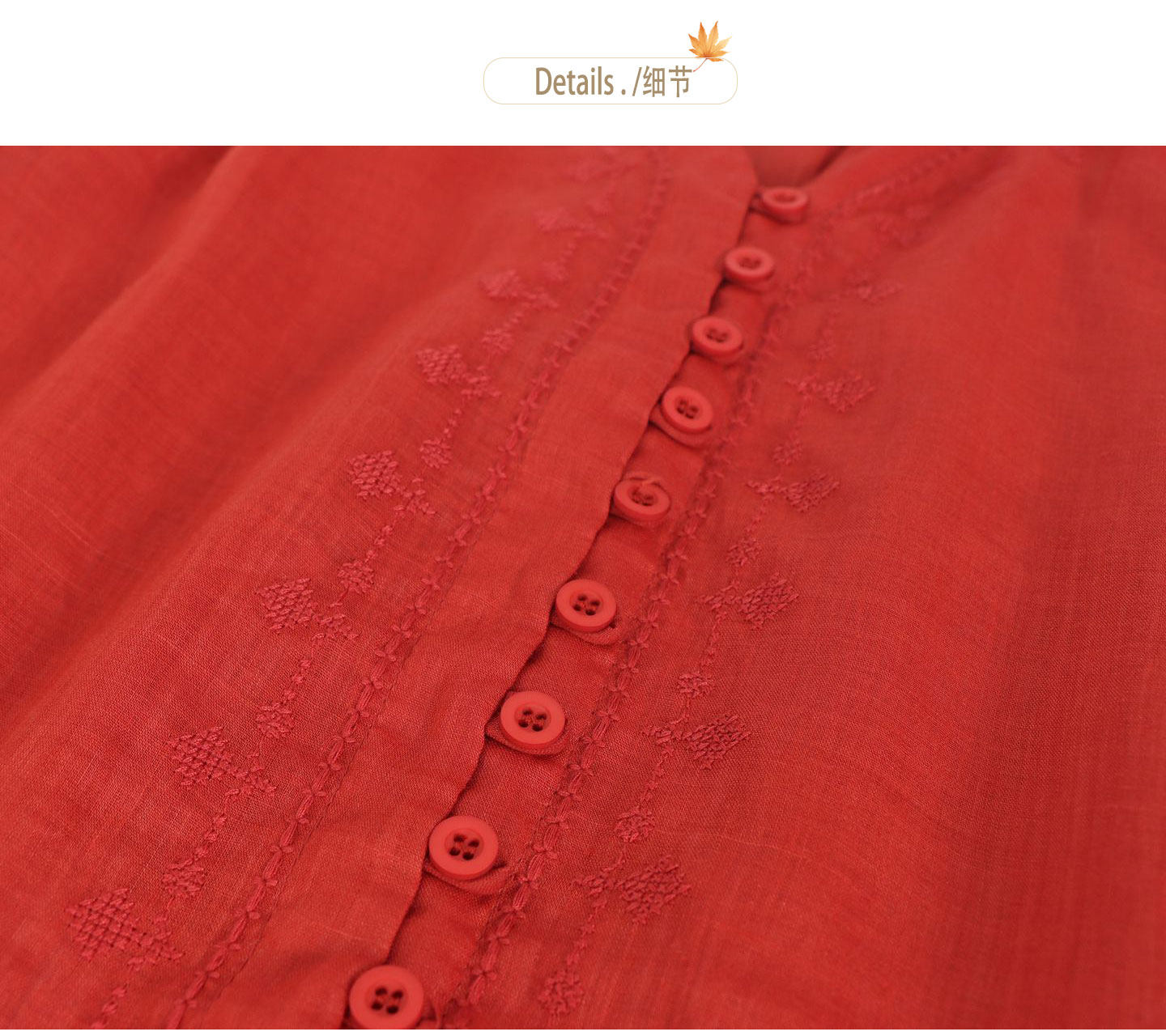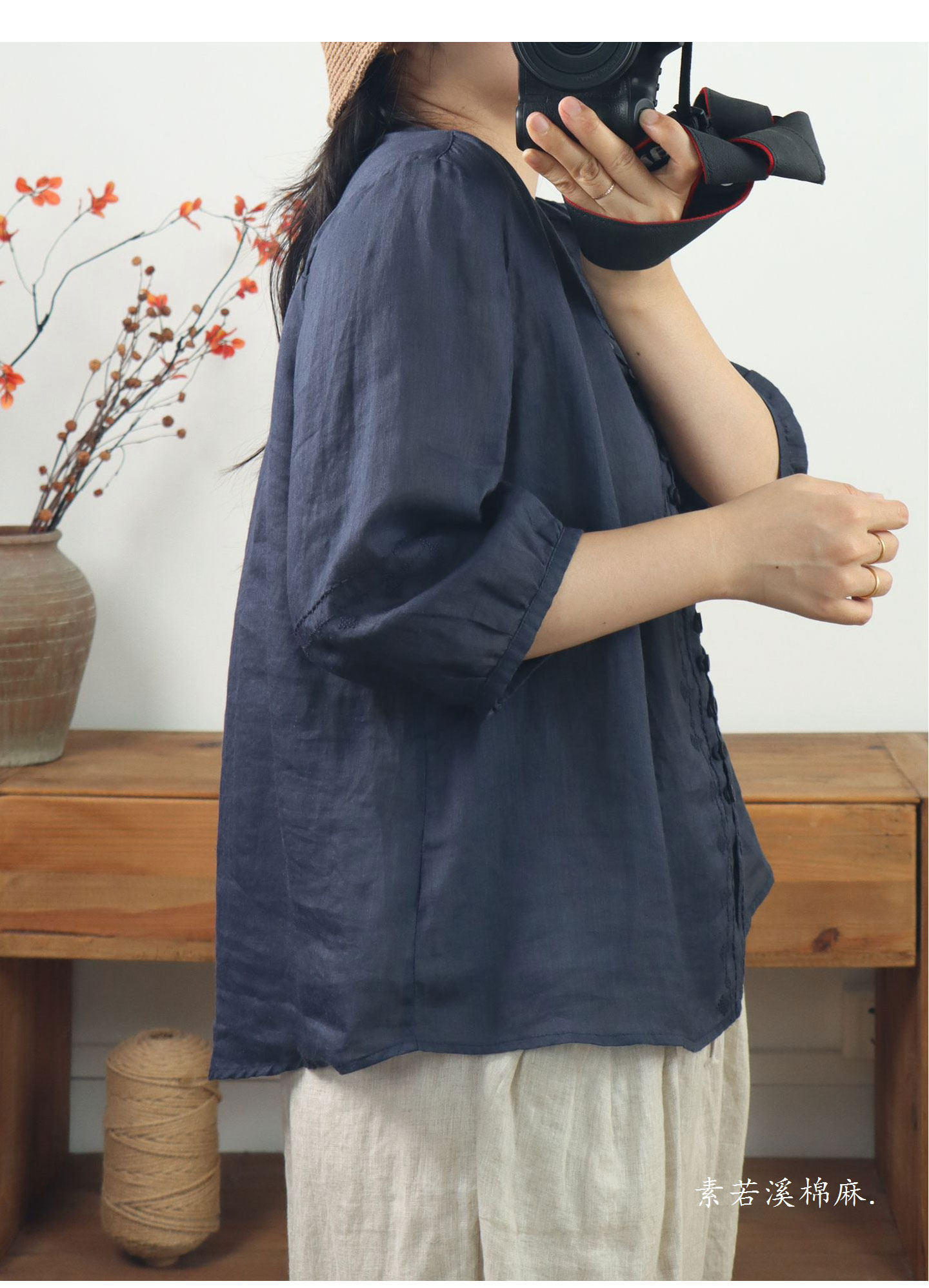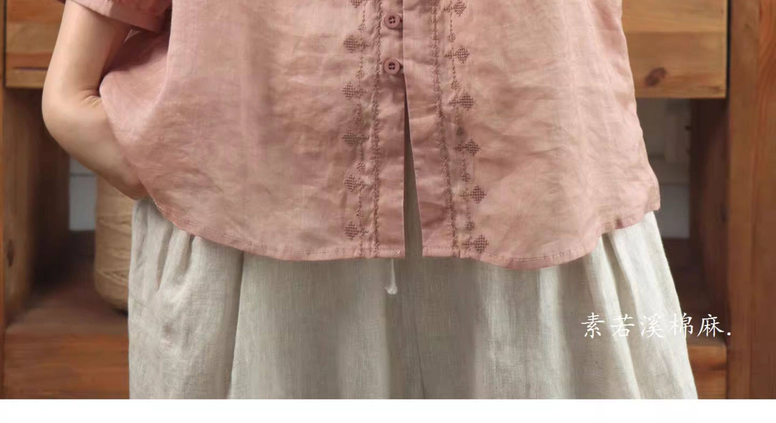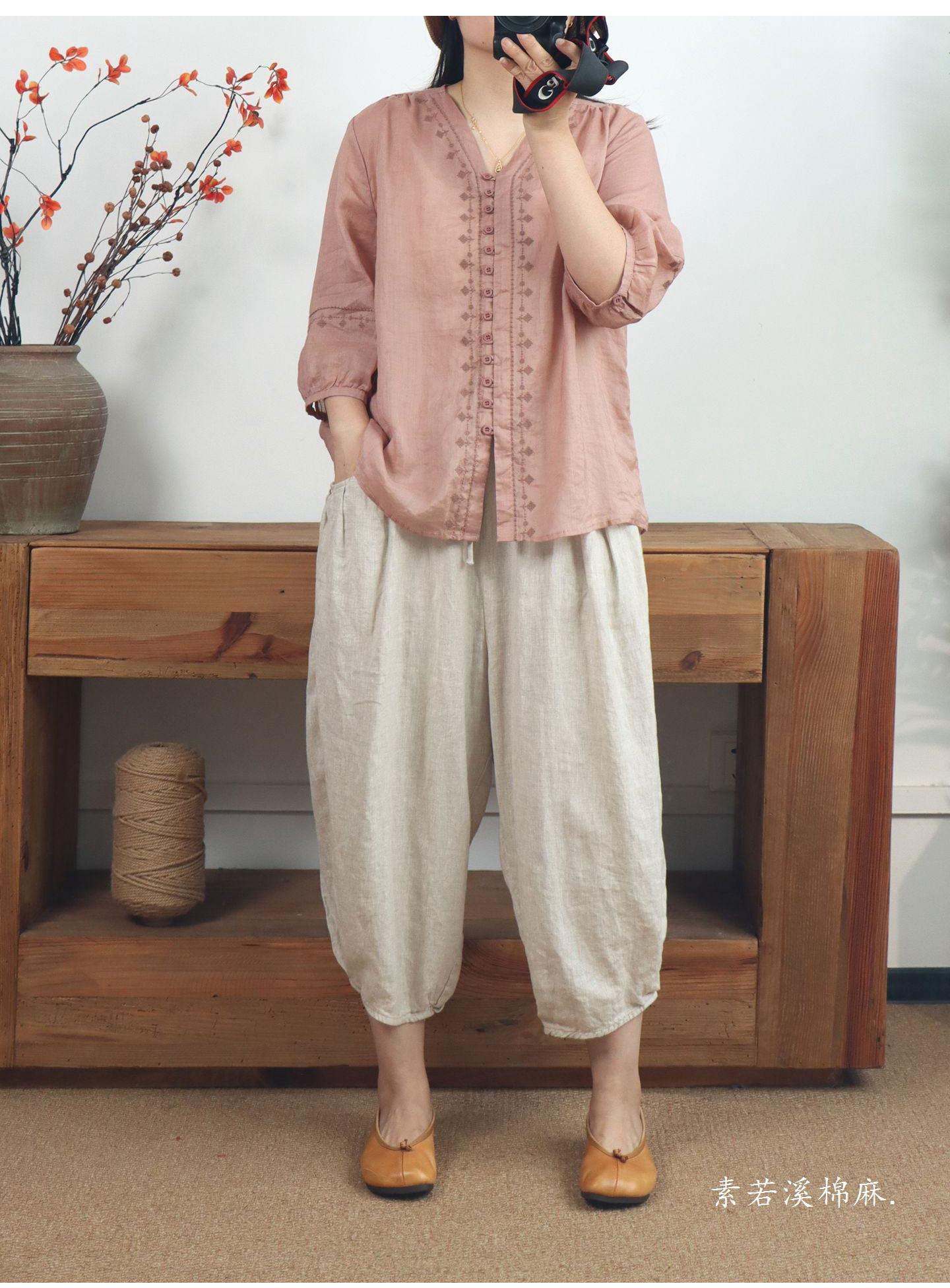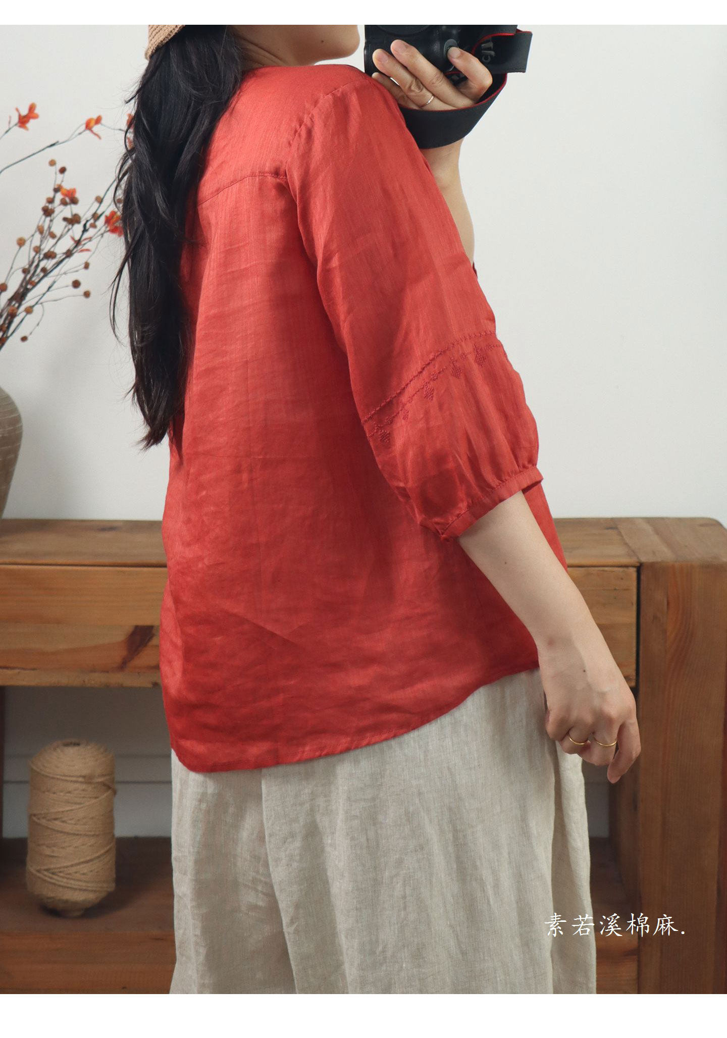 Elegant Ramie Embroidered Three-Quarter Sleeve V-Neck Shirt for Women, Summer Loose Large Size Vintage Artistic Button-Up Top 2552
