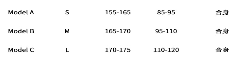 China (cm) 160-165/84-86 165-170 / 88-90 167-172 / 92-96 168-173 / 98-102 170-176 / 106-110