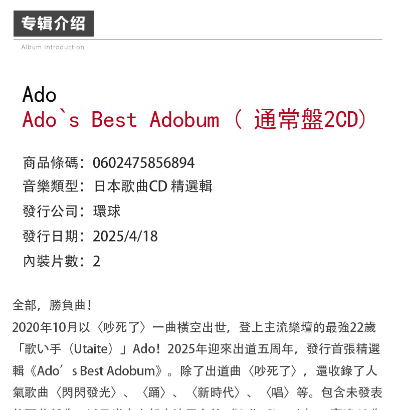 Spot official genuine ADO album Ado's Best Adobum regular disk 2CD + small card code
