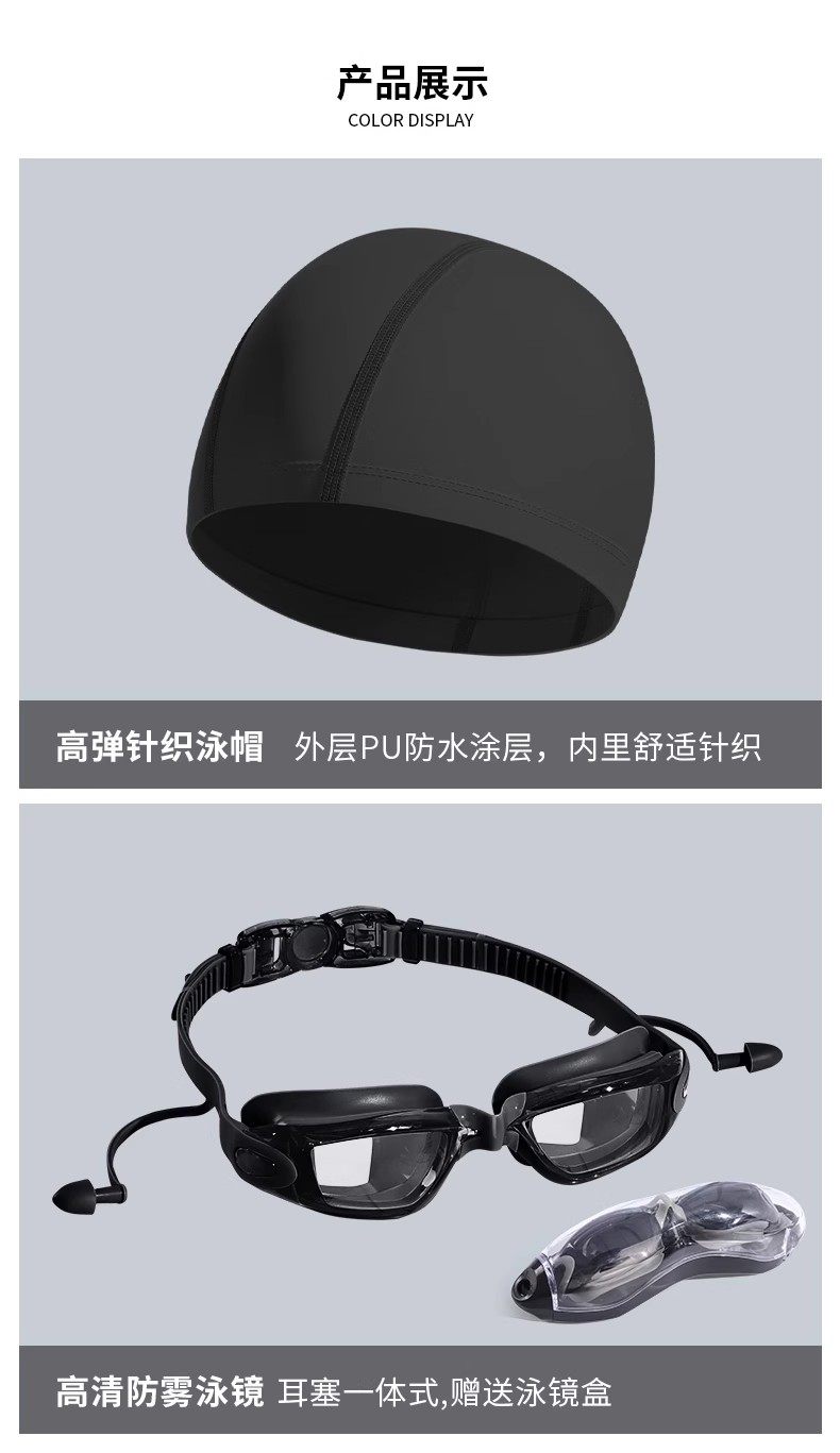 Sort by color Black two-piece swimsuit + swimming trunks, loose style,Gray two-piece swimsuit + swimming trunks, loose style,Black four-piece suit + swimming trunks + swimming cap + swimming goggles,Grey four-piece swimsuit + swimming trunk + swimming cap + swimming goggles,Gray and black four-piece set, swimsuit + swimming trunks + swimming cap + swimming goggles