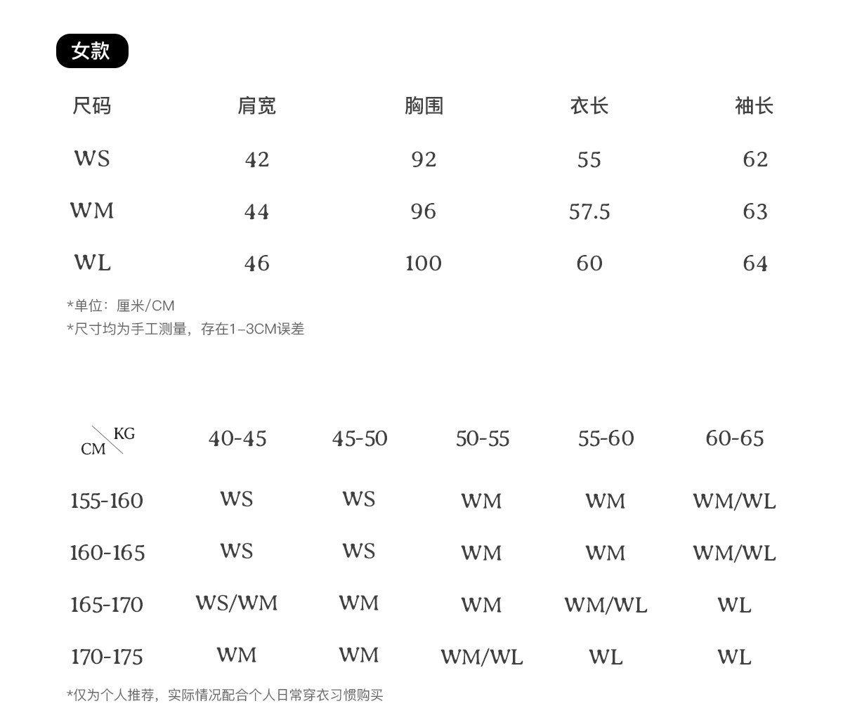 China (cm) 160-165/84-86 165-170 / 88-90 167-172 / 92-96 168-173 / 98-102 170-176 / 106-110