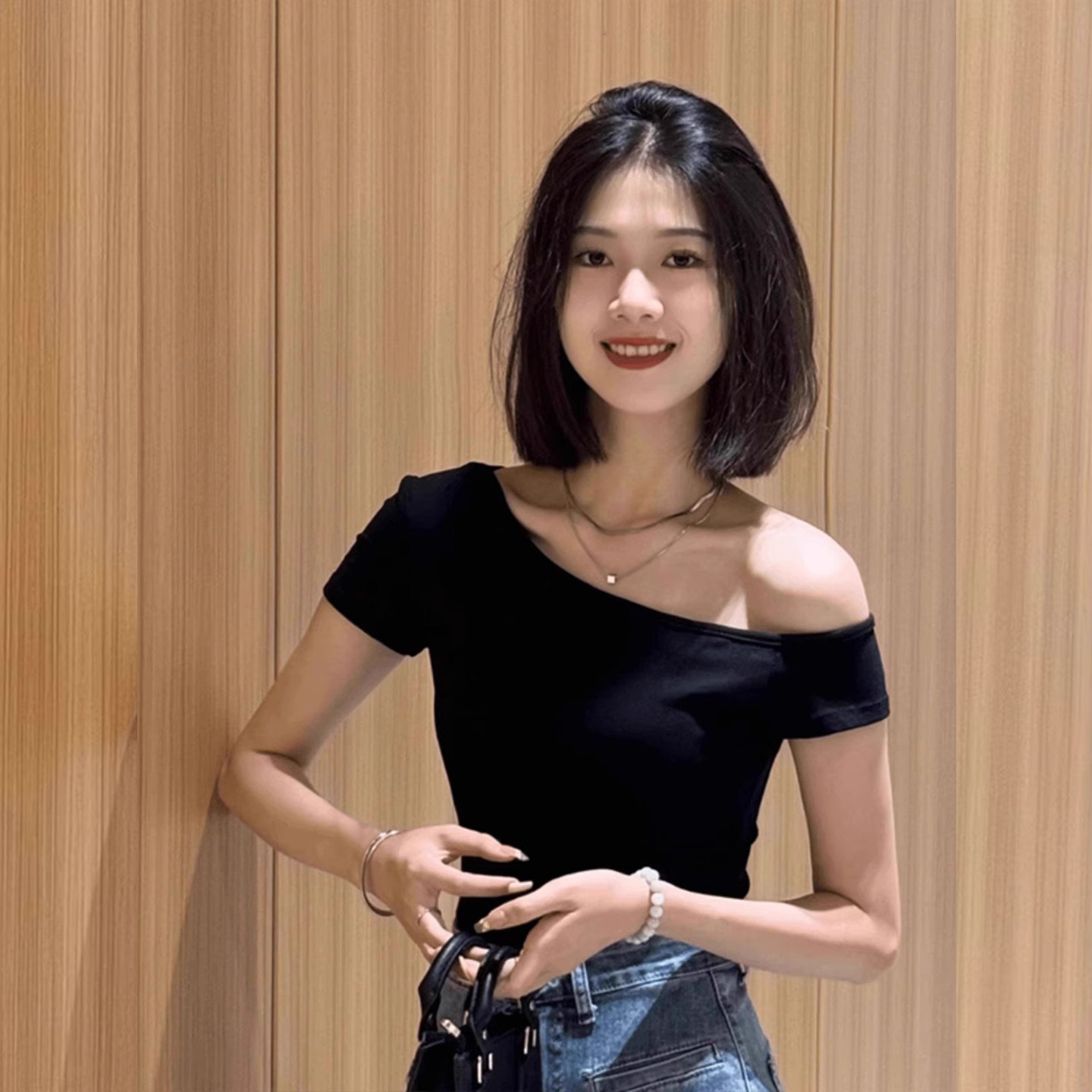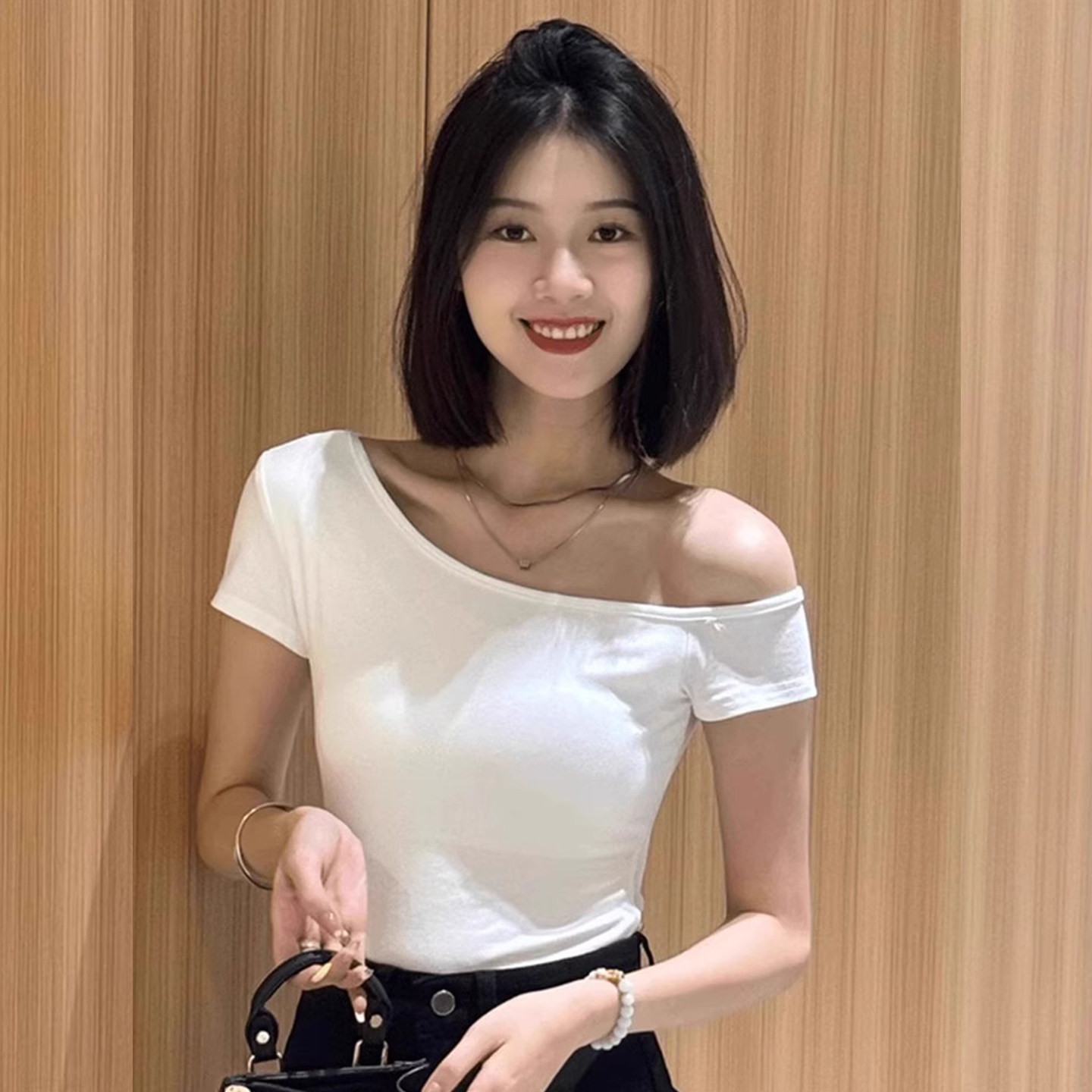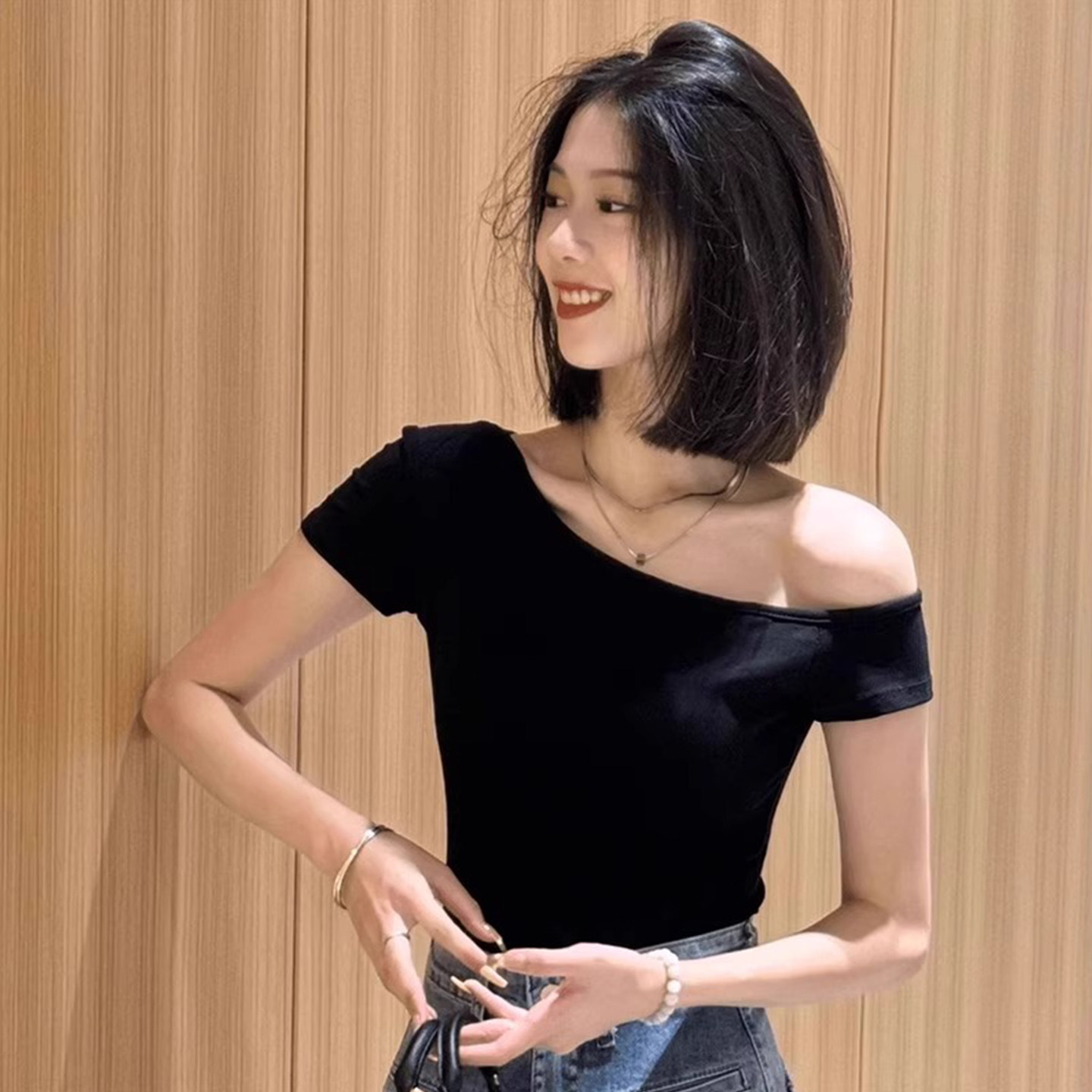 Off-Shoulder Padded Short-Sleeve T-Shirt for Women, Summer 2025 New Design, Slim-Fit, Short Top