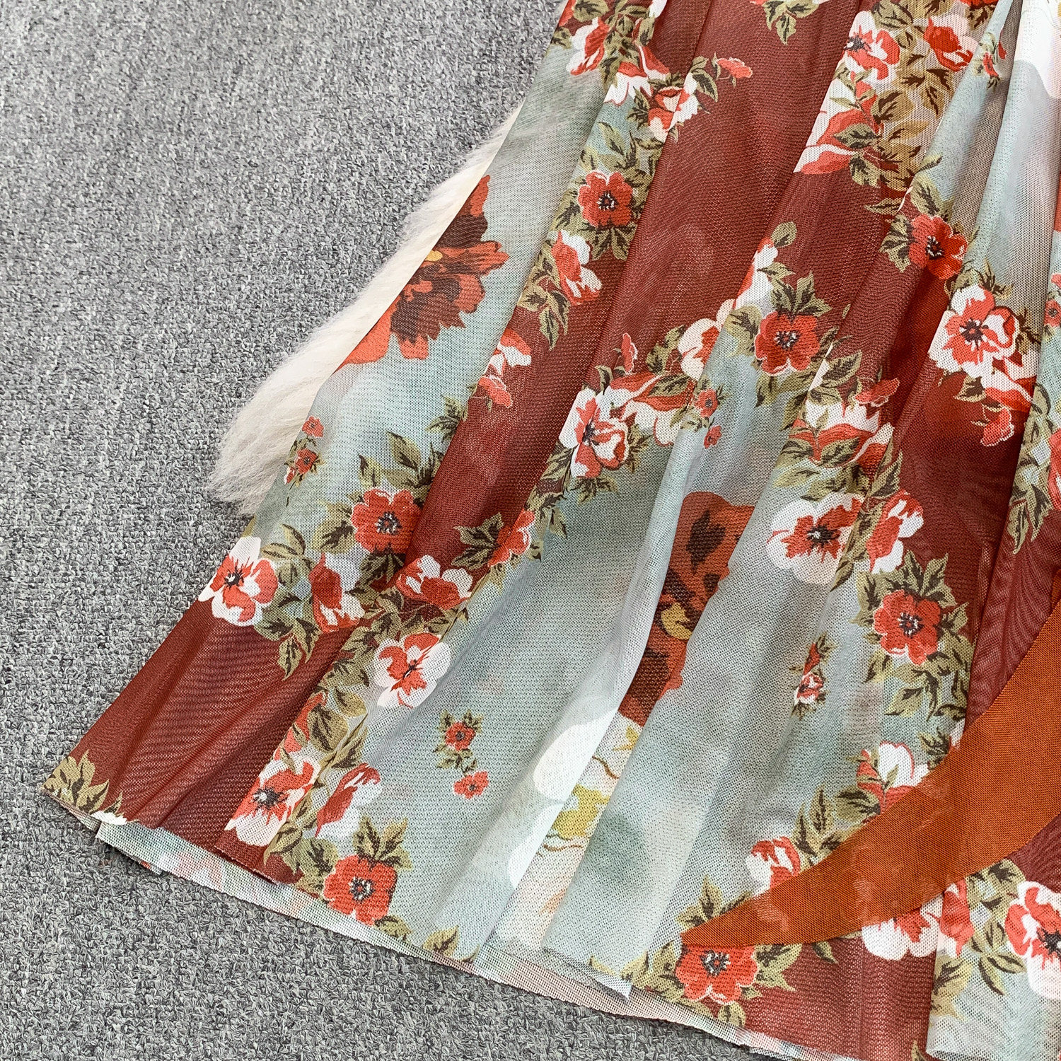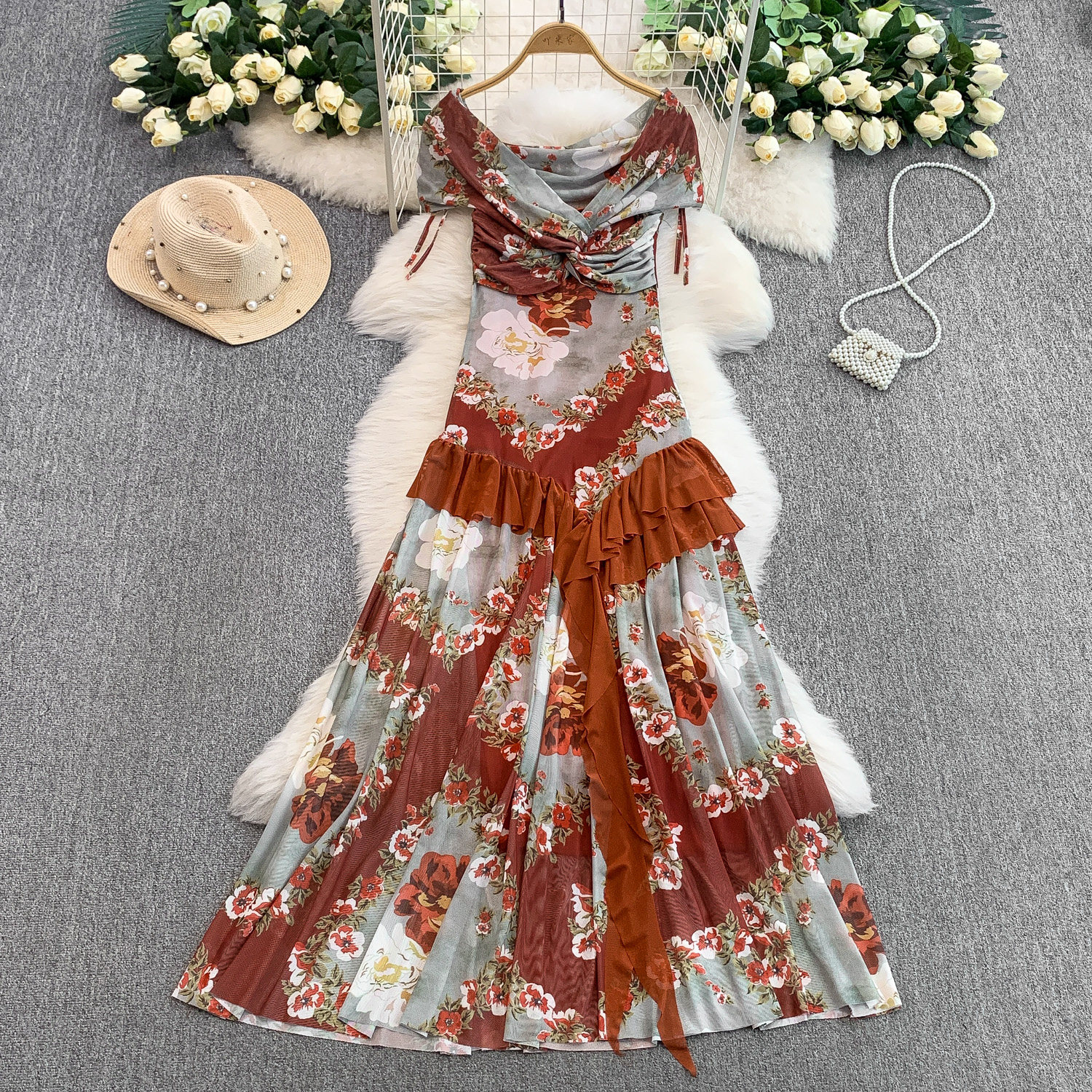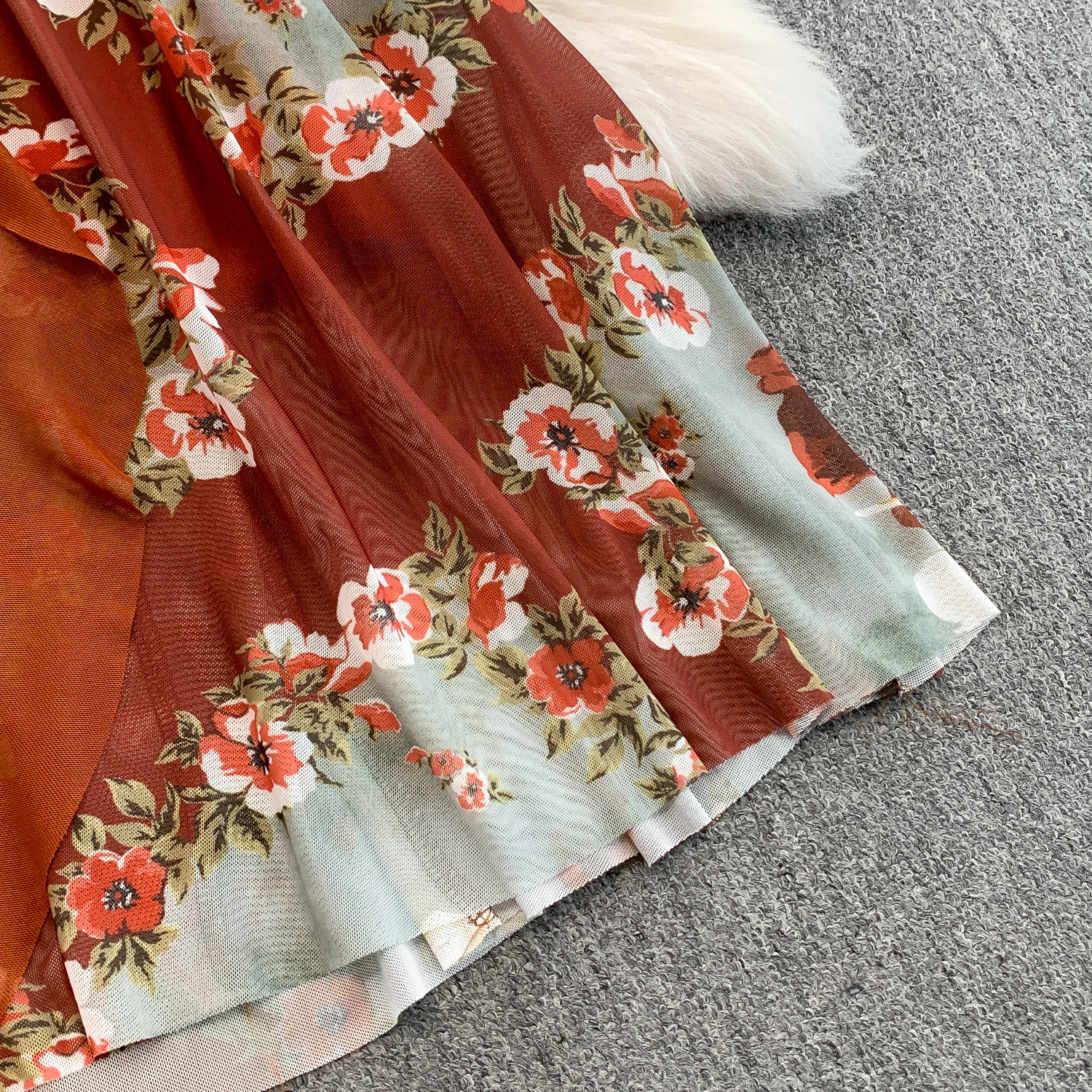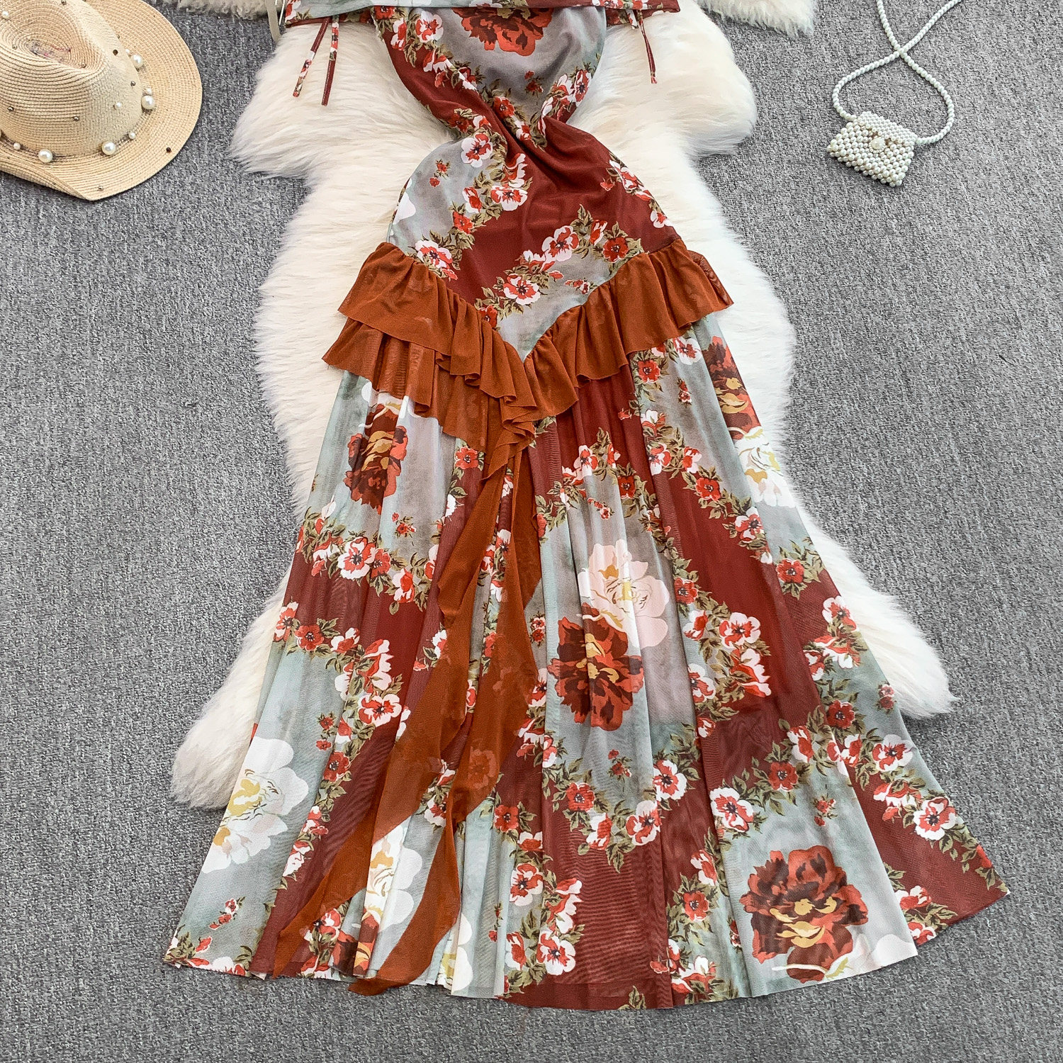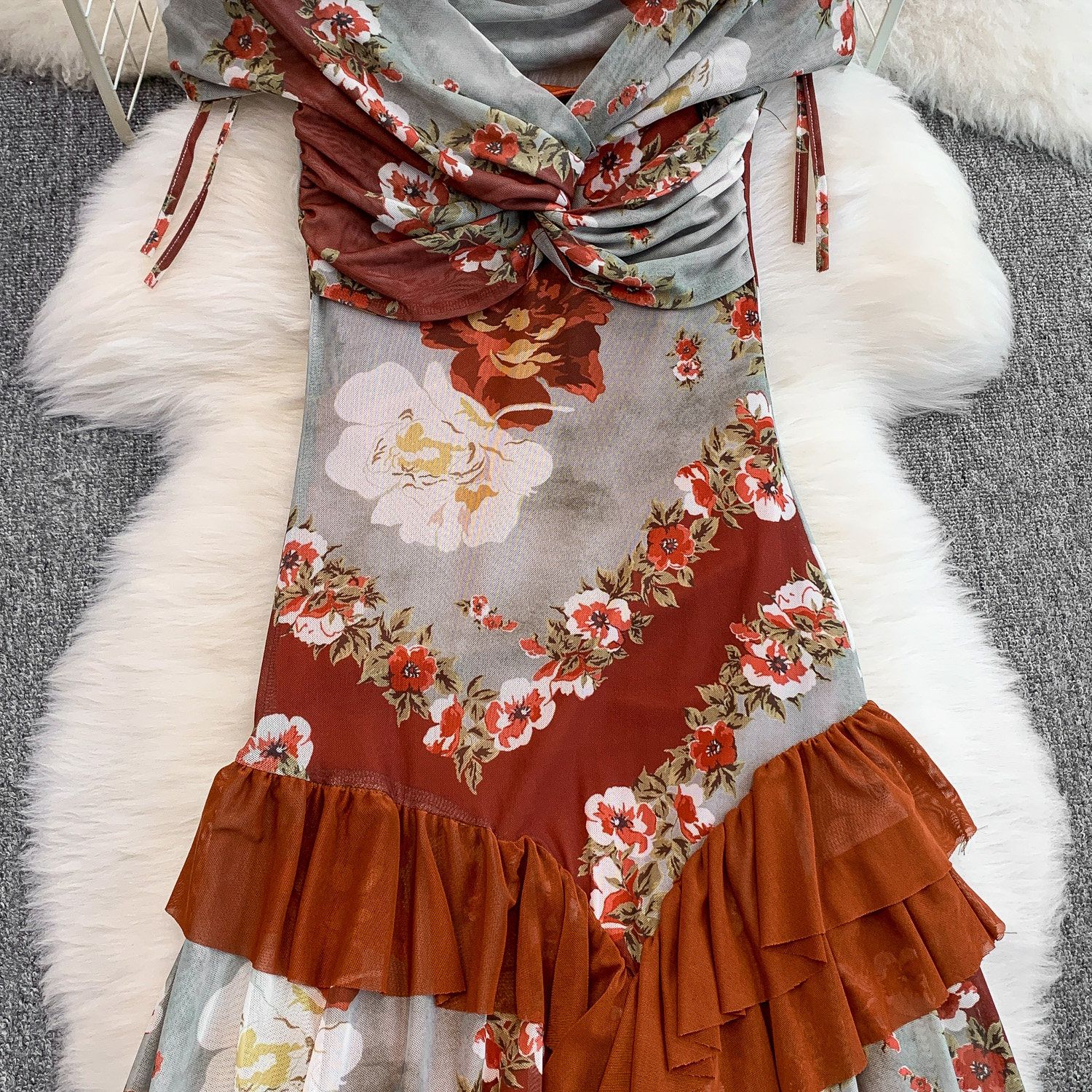 European and American Style Atmospheric Mesh Printed Twisted V-Neck Dress for Women, Summer Waist-Cinching Ruffled Elegant Long Dress