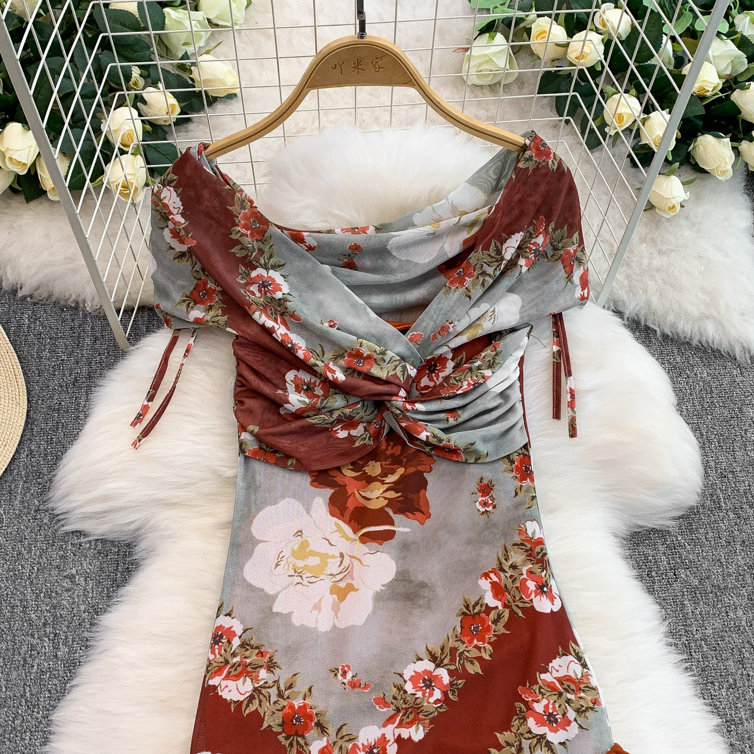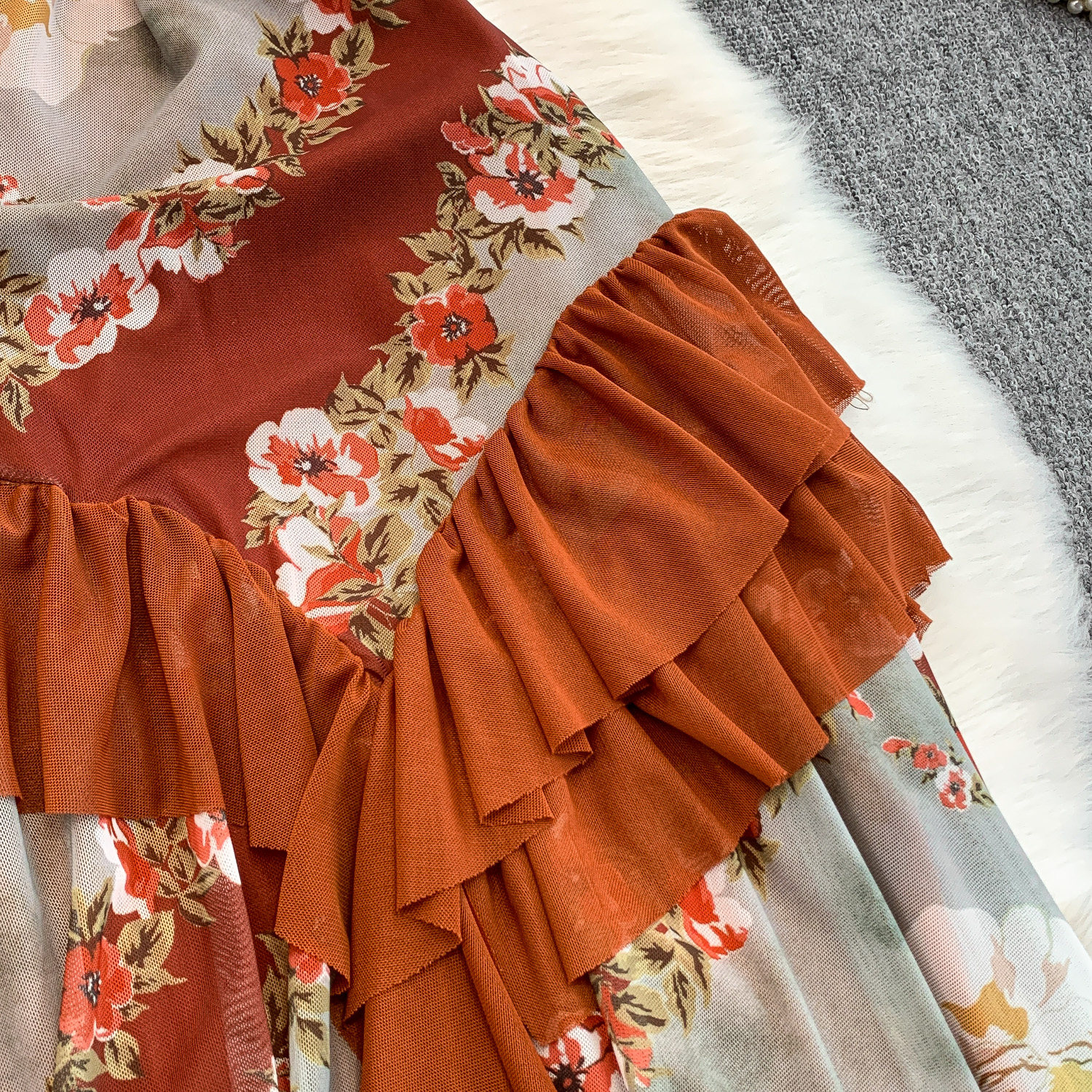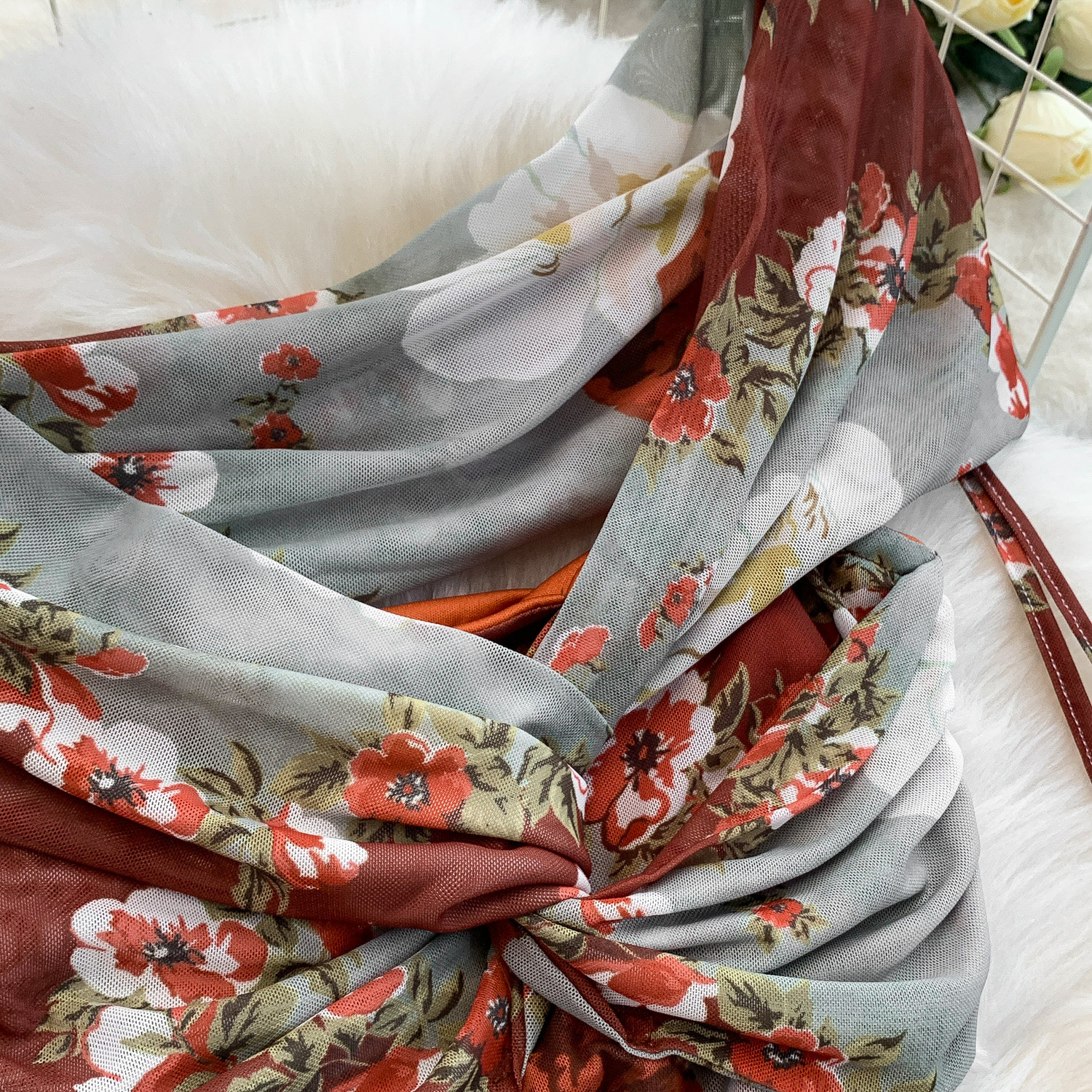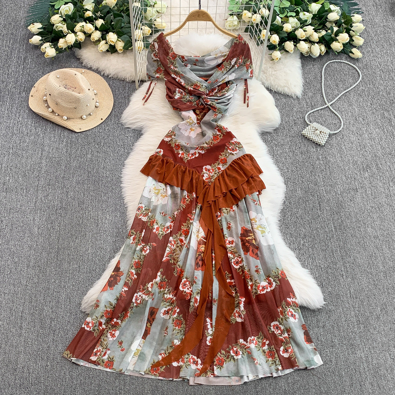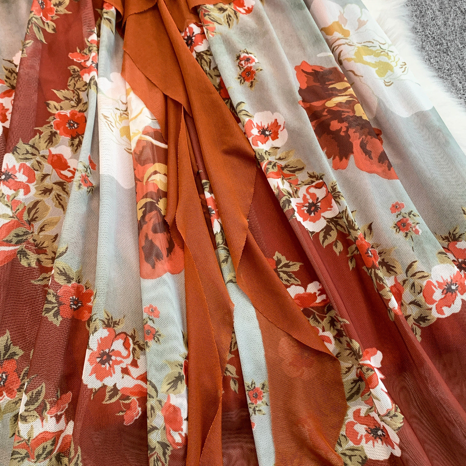 European and American Style Atmospheric Mesh Printed Twisted V-Neck Dress for Women, Summer Waist-Cinching Ruffled Elegant Long Dress
