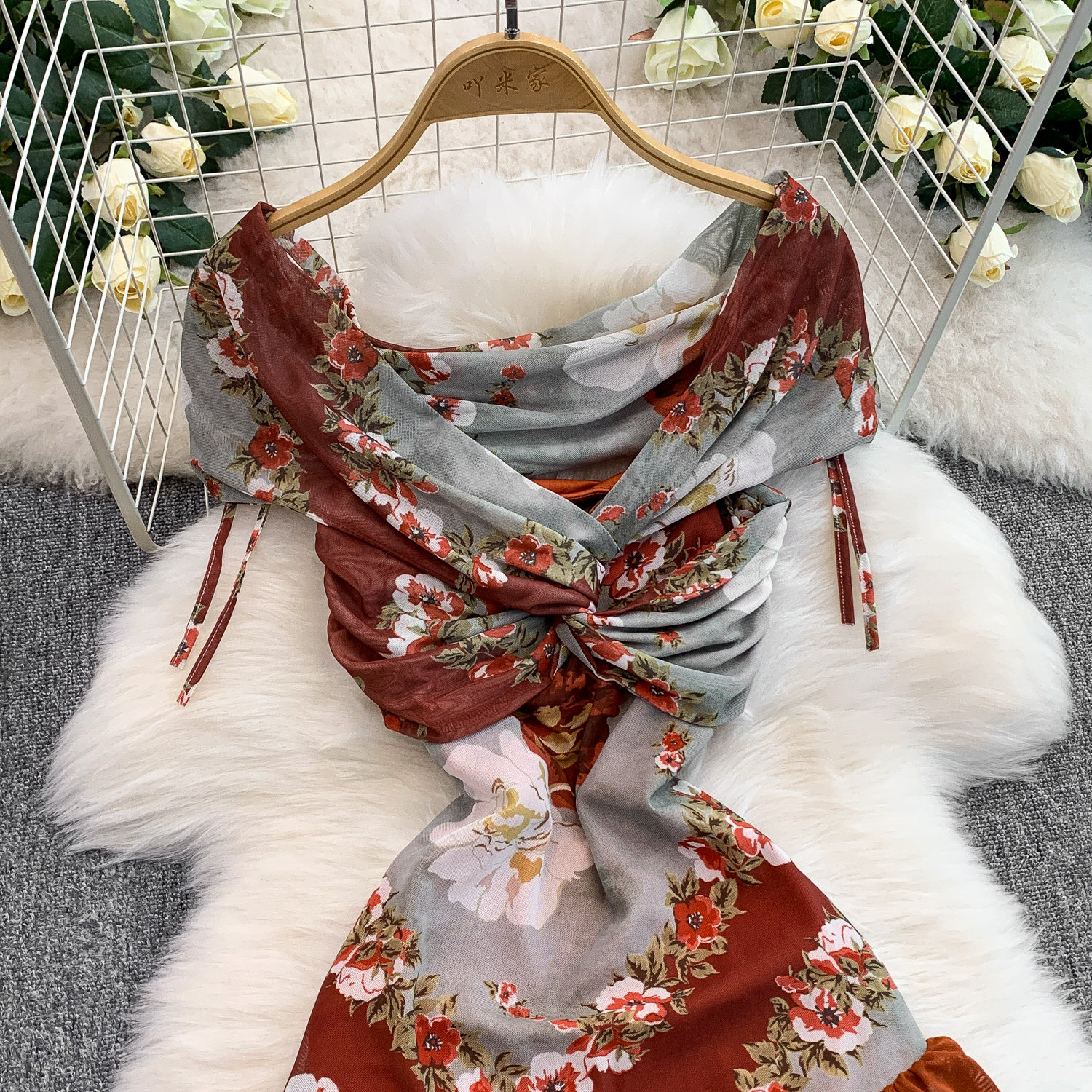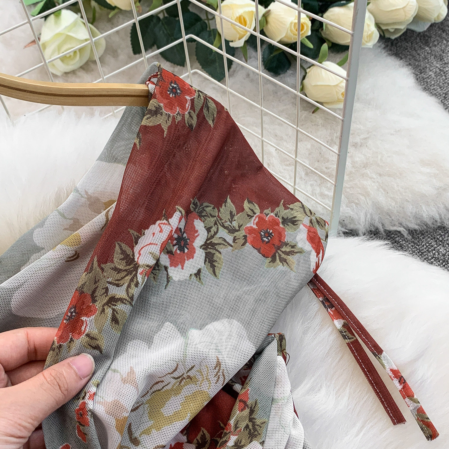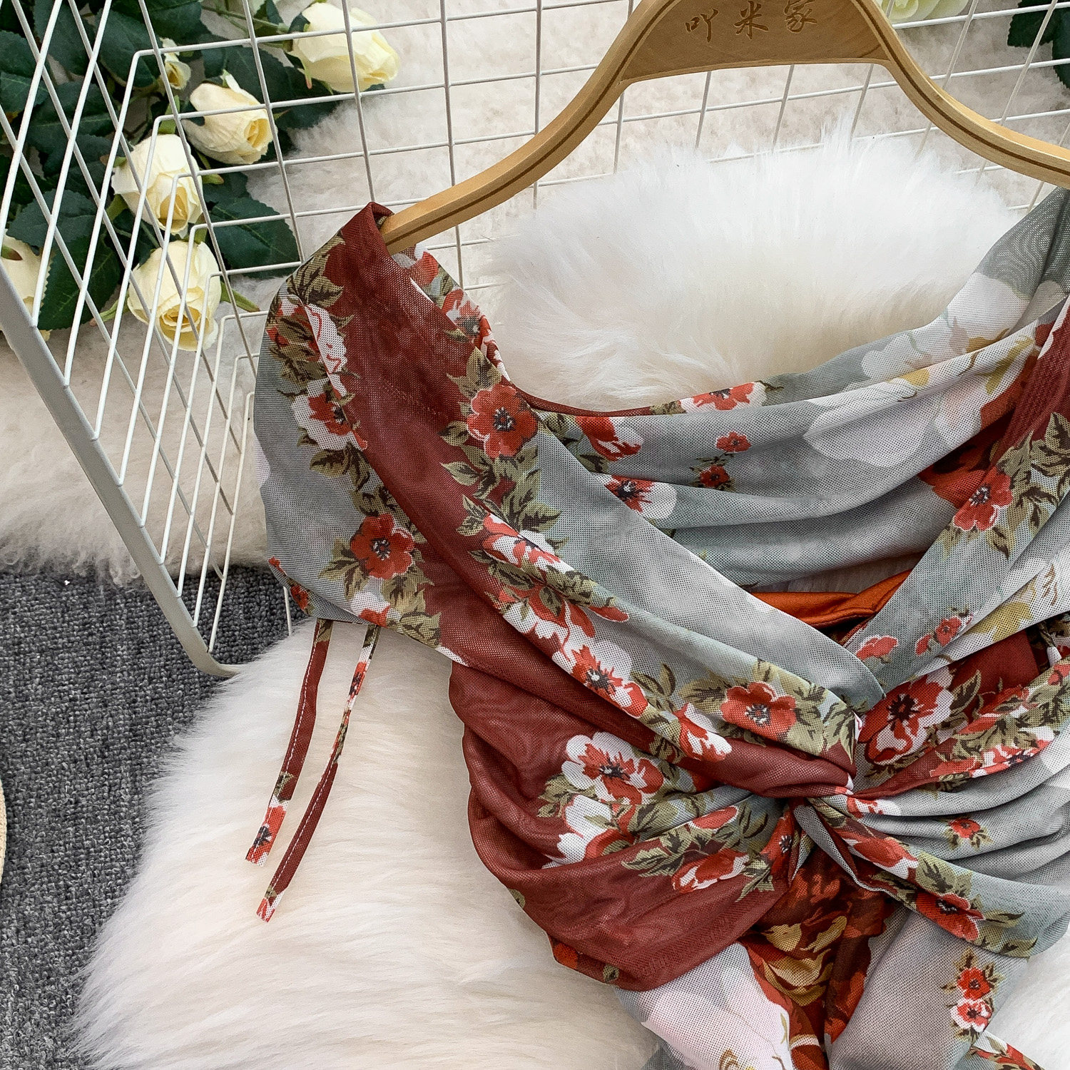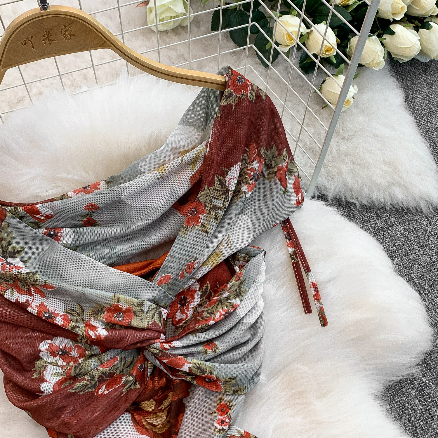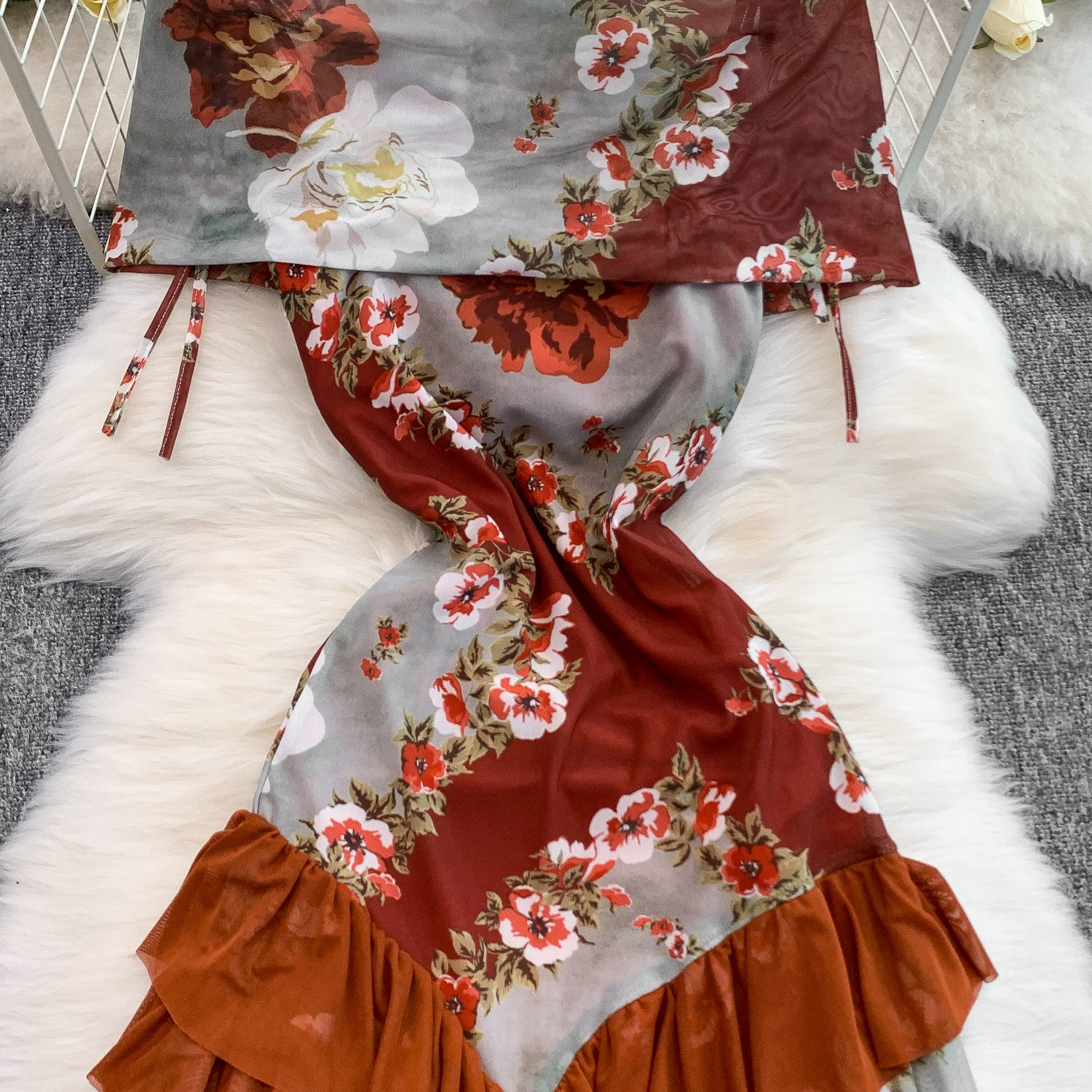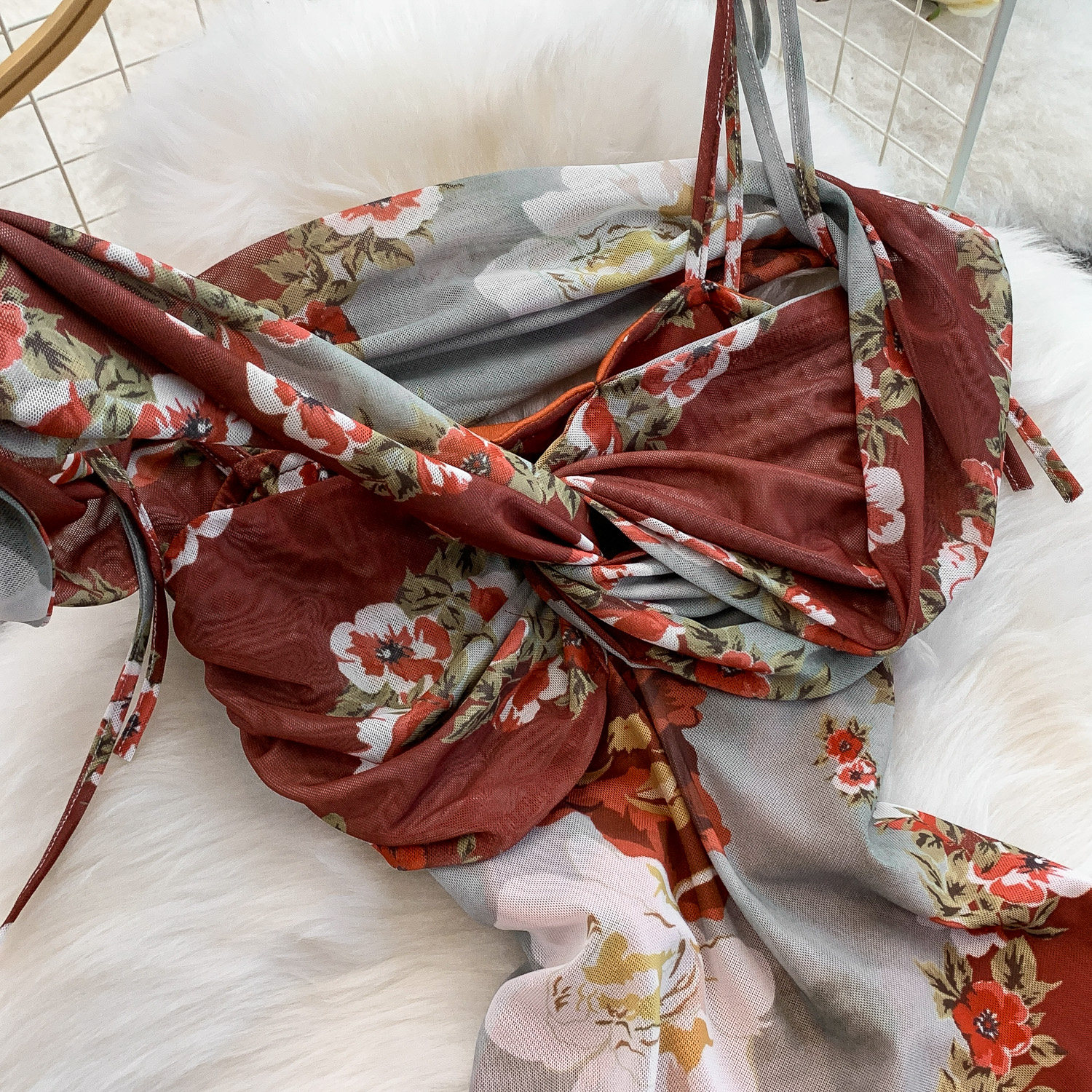 European and American Style Atmospheric Mesh Printed Twisted V-Neck Dress for Women, Summer Waist-Cinching Ruffled Elegant Long Dress