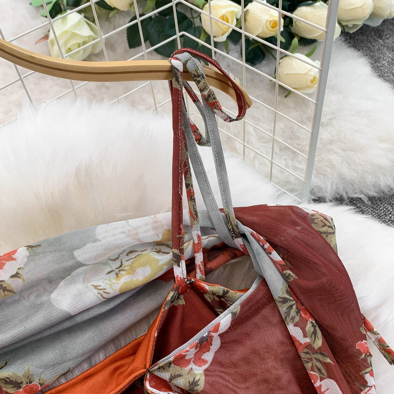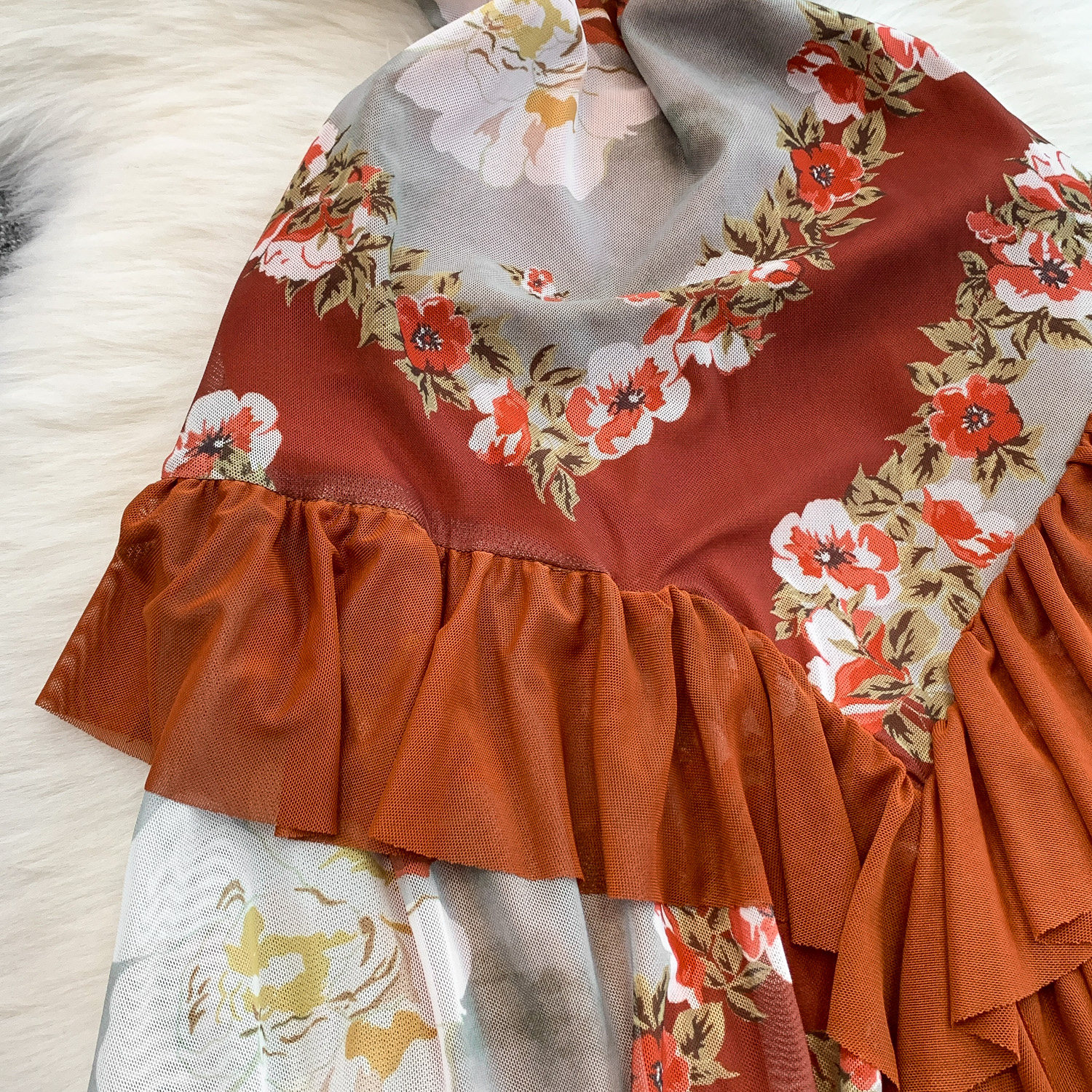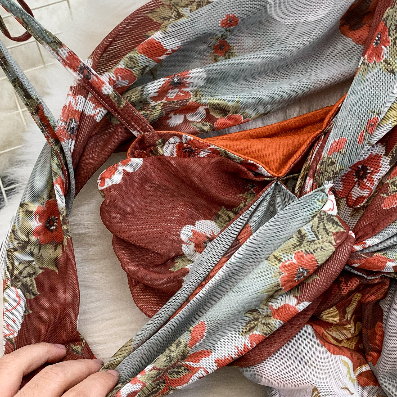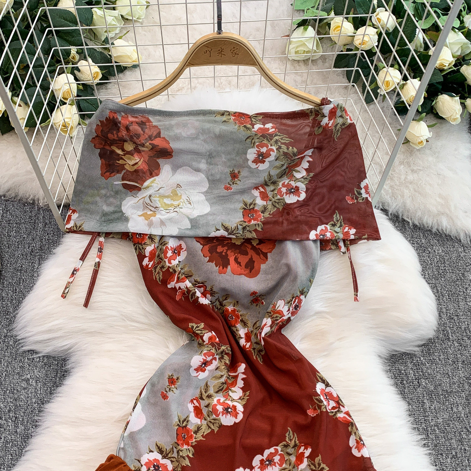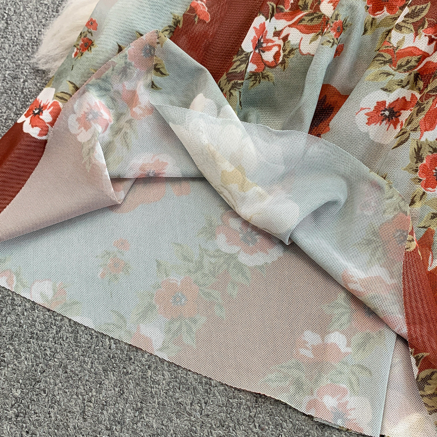 European and American Style Atmospheric Mesh Printed Twisted V-Neck Dress for Women, Summer Waist-Cinching Ruffled Elegant Long Dress