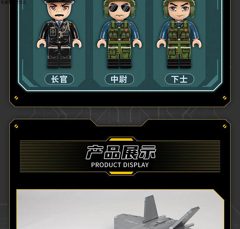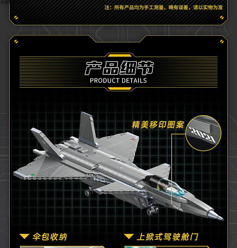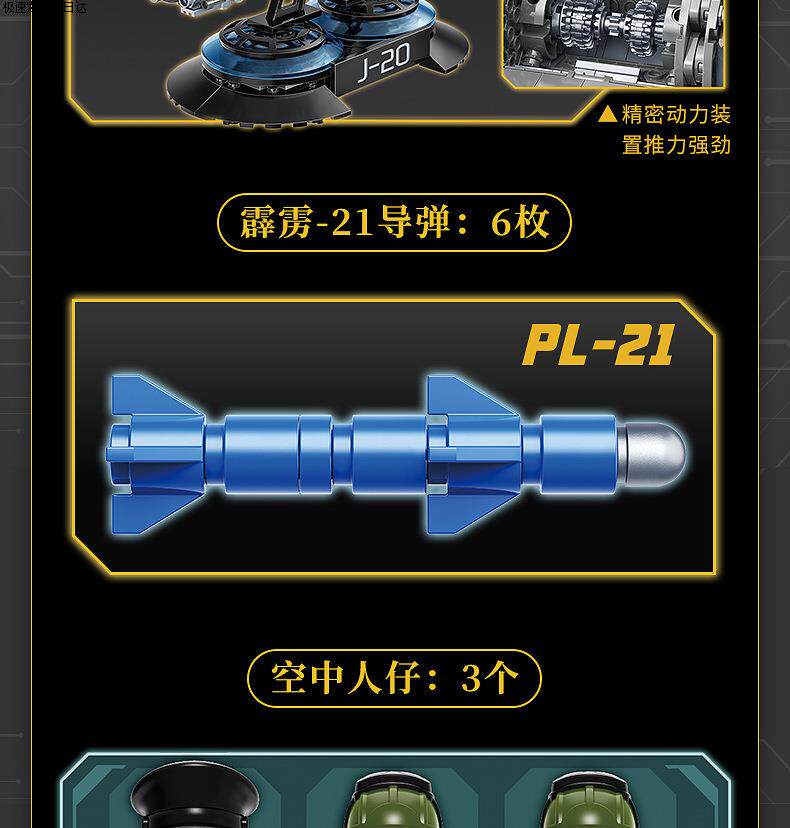 Color Classification Wonderful 22020 J-20 Stealth Fighter,Wonderful 22021 -96B Main Battle Tank,Enlighten 23011 J-20 Stealth Fighter,Enlighten 23012 Dongfeng 41 Intercontinental Strategic Nuclear Missile,Enlighten 23013 Y-20 Large Transport Aircraft,Enlightenment 23014-99A Main Station Tank,Enlightenment 23015-055 Destroyer Aircraft Carrier,Enlighten 23020 Strategic Nuclear Submarine,Wonderful 23026 99A Main Station Tank,Wonderful 23027 J-20 Fighter Jet,Wonderful 23029 J-15 Fighter Jet,23030 J-10C,23031 Destroyer Type 052,23032 Boom 6K,23034 Oil Transport-20,23035 Shandong Aircraft Carrier,23016 Z-20 Tactical General-Purpose Helicopter,Enlighten 23019 J-35 Stealth Carrier-Based Fighter - Base Edition,Wonderful 23028 Fujian Ship