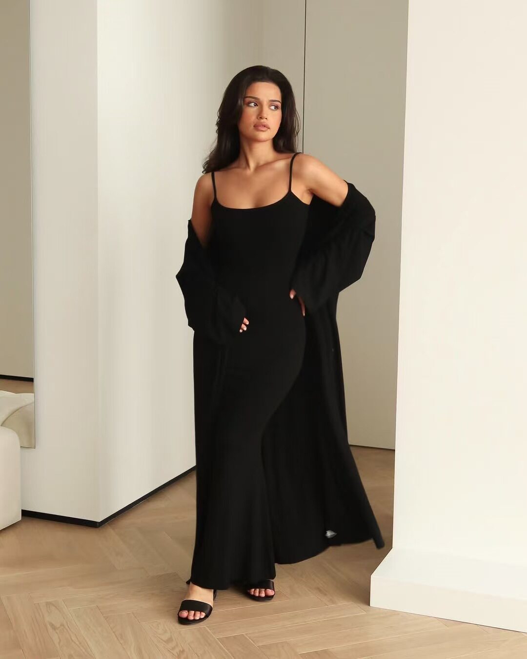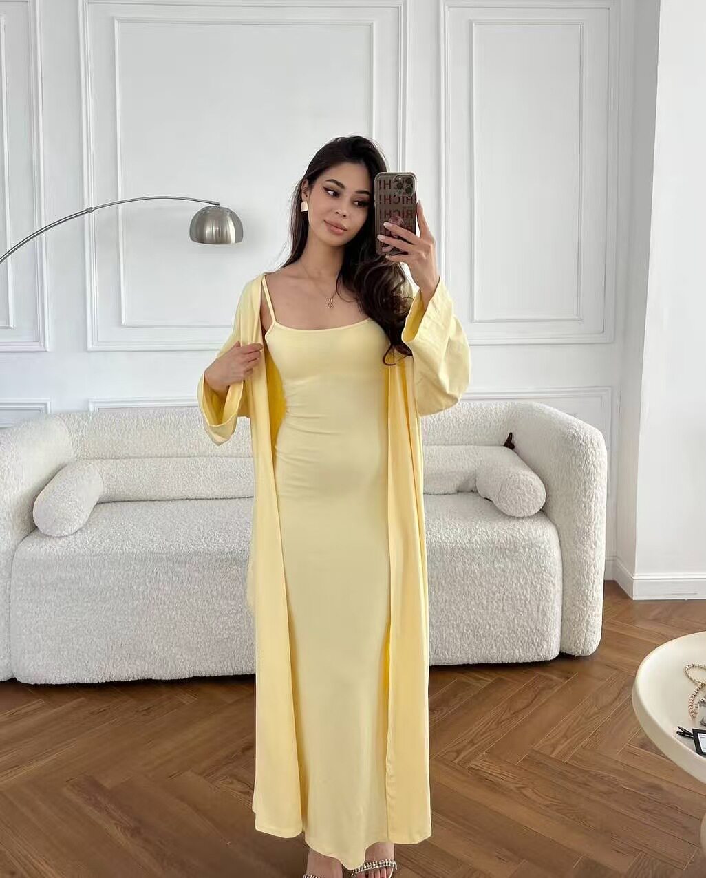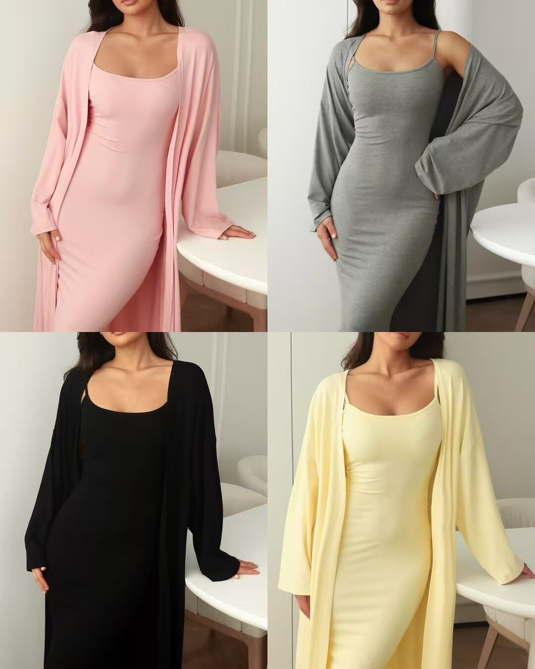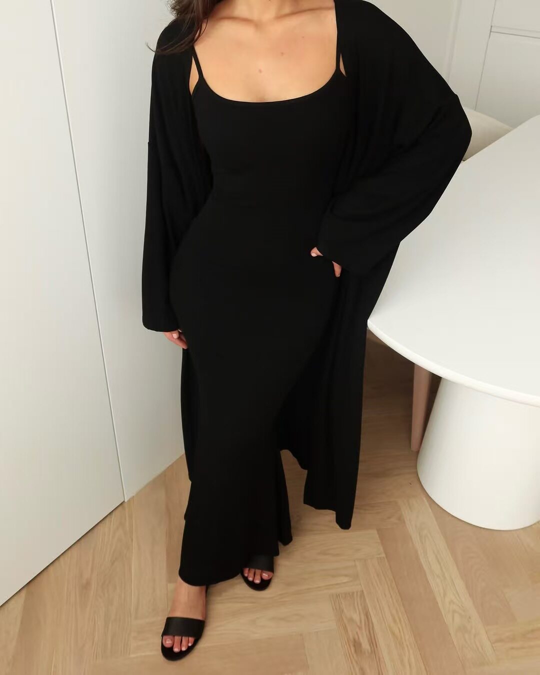 European and American Style New Solid Color Long-Sleeved Cardigan Jacket and Suspender Dress Two-Piece Set Robe and Dress Set